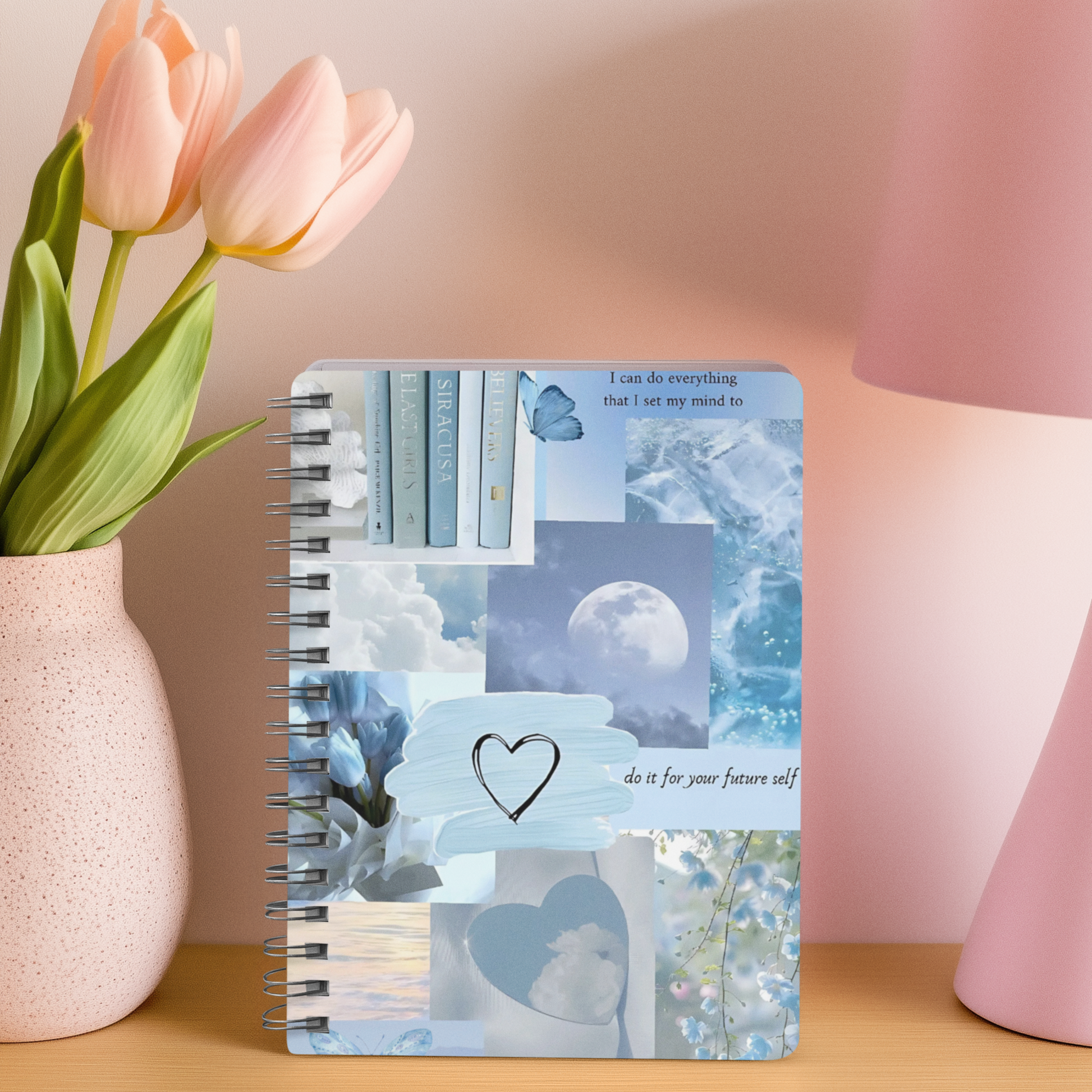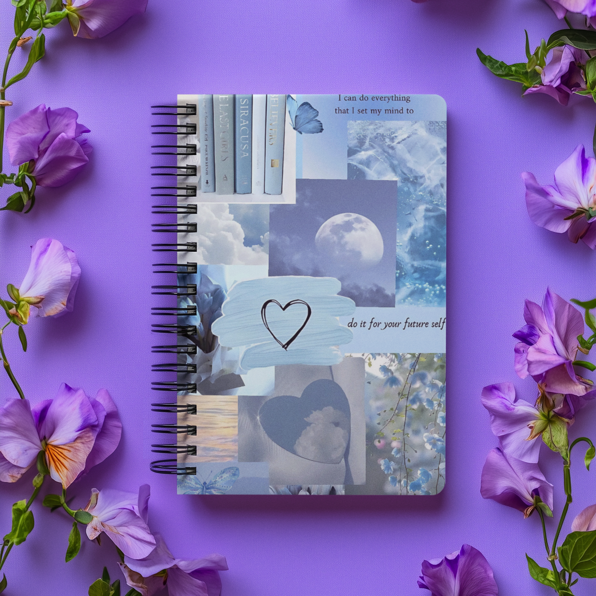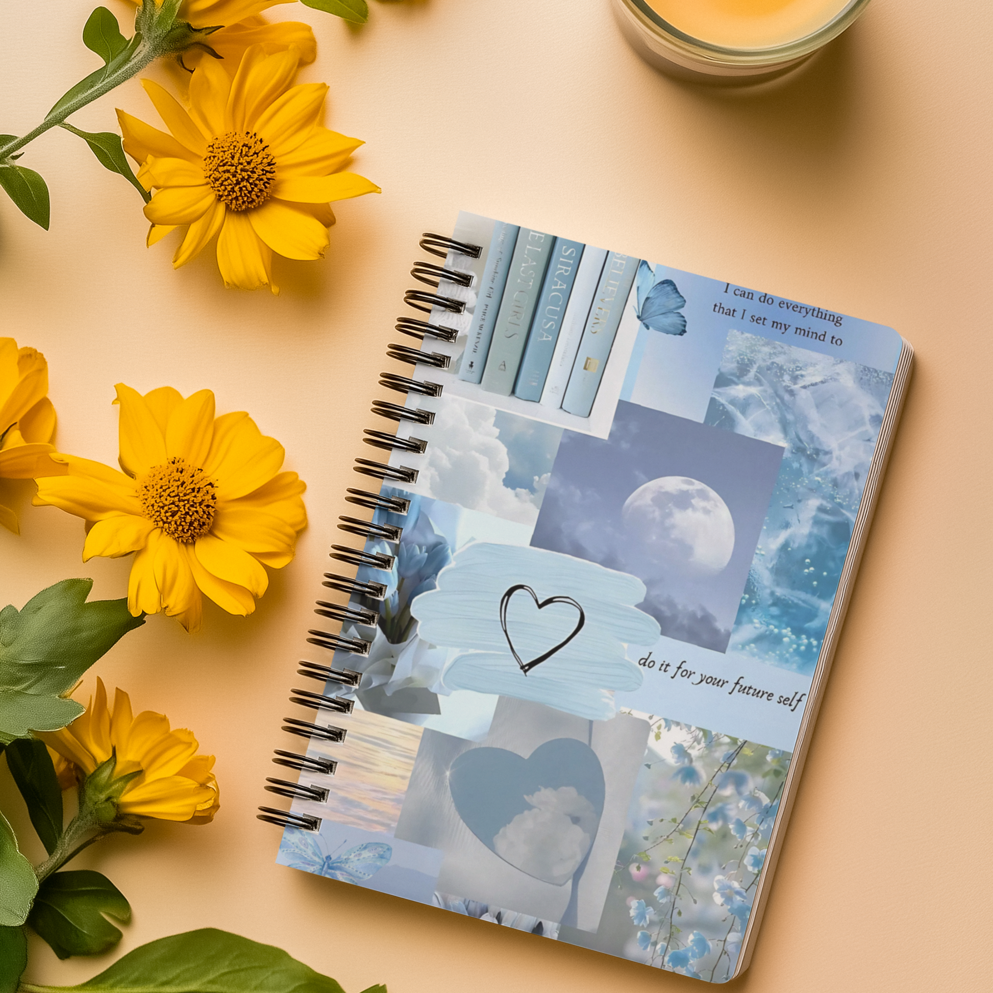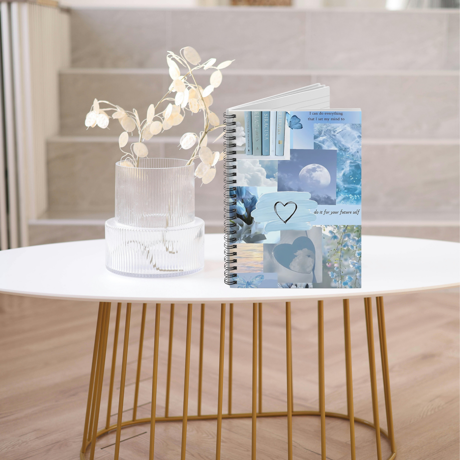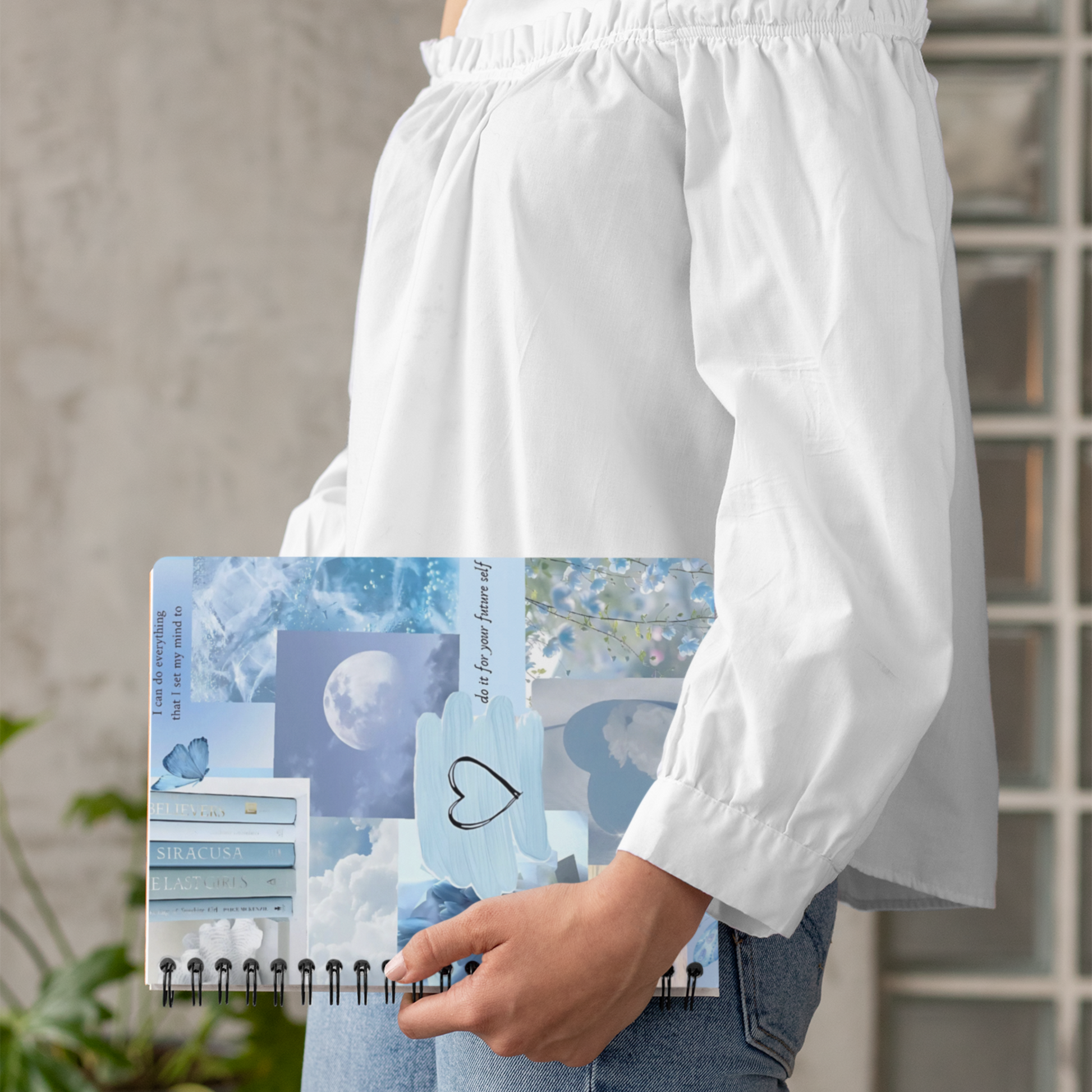 Drift into a dreamscape with this baby blue spiral notebook, where every page feels like a whisper from the sky. The soft cover is a canvas of serenity, painted in delicate hues of light blue tones melting into one another like watercolors in a daydream. Wispy clouds float lazily across the front, cradling dainty butterflies mid-flight, their wings shimmering with hints of pearlescent magic.