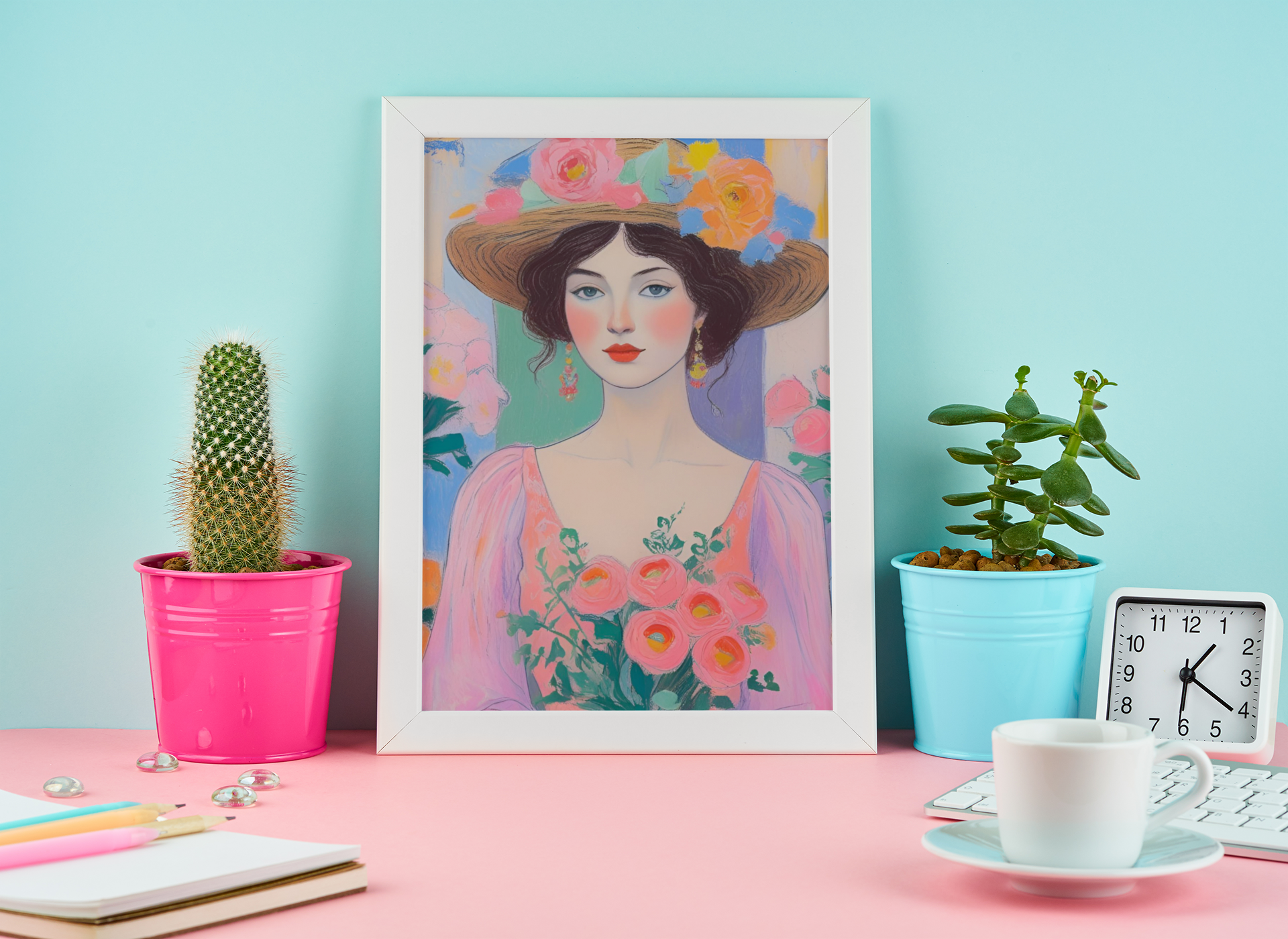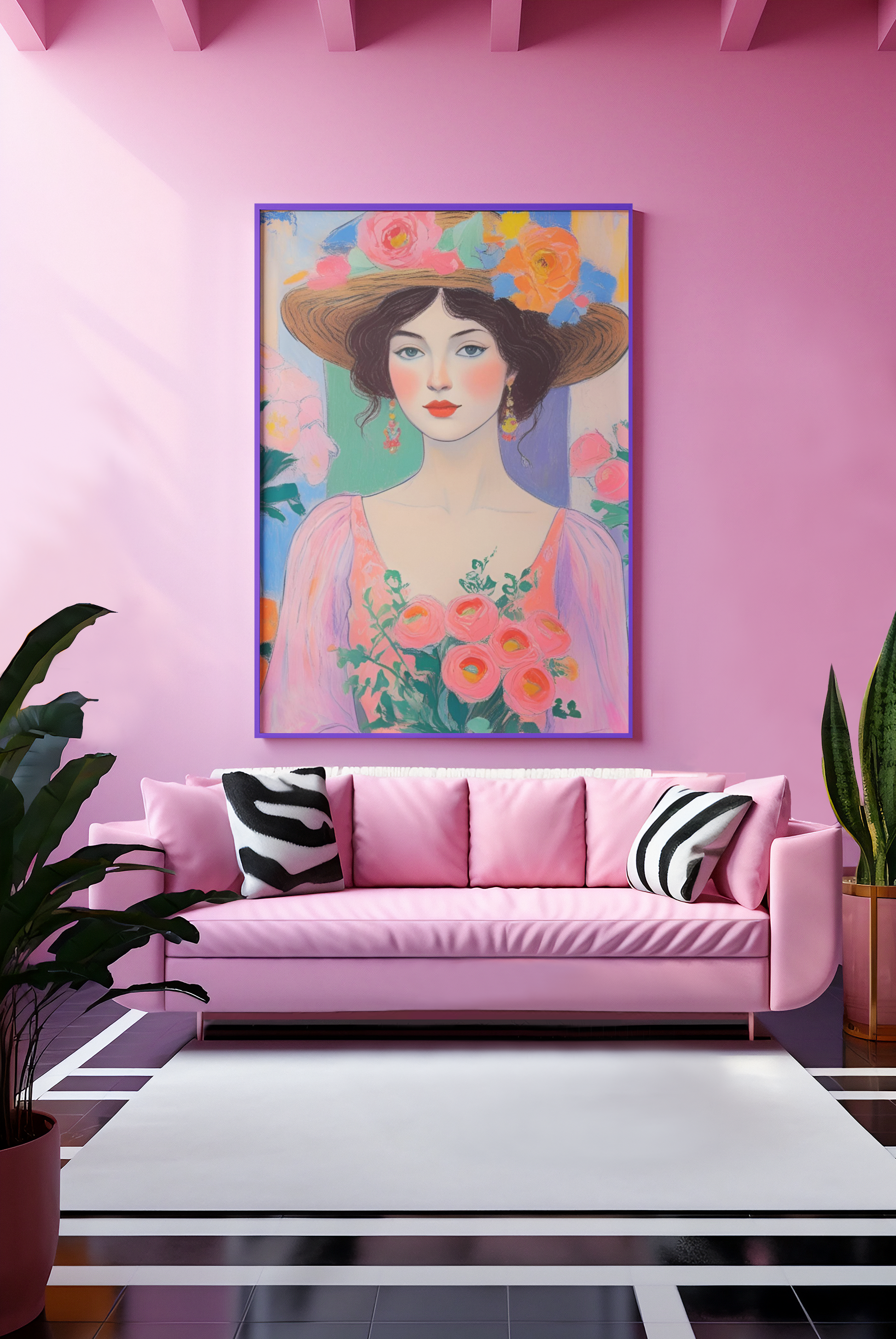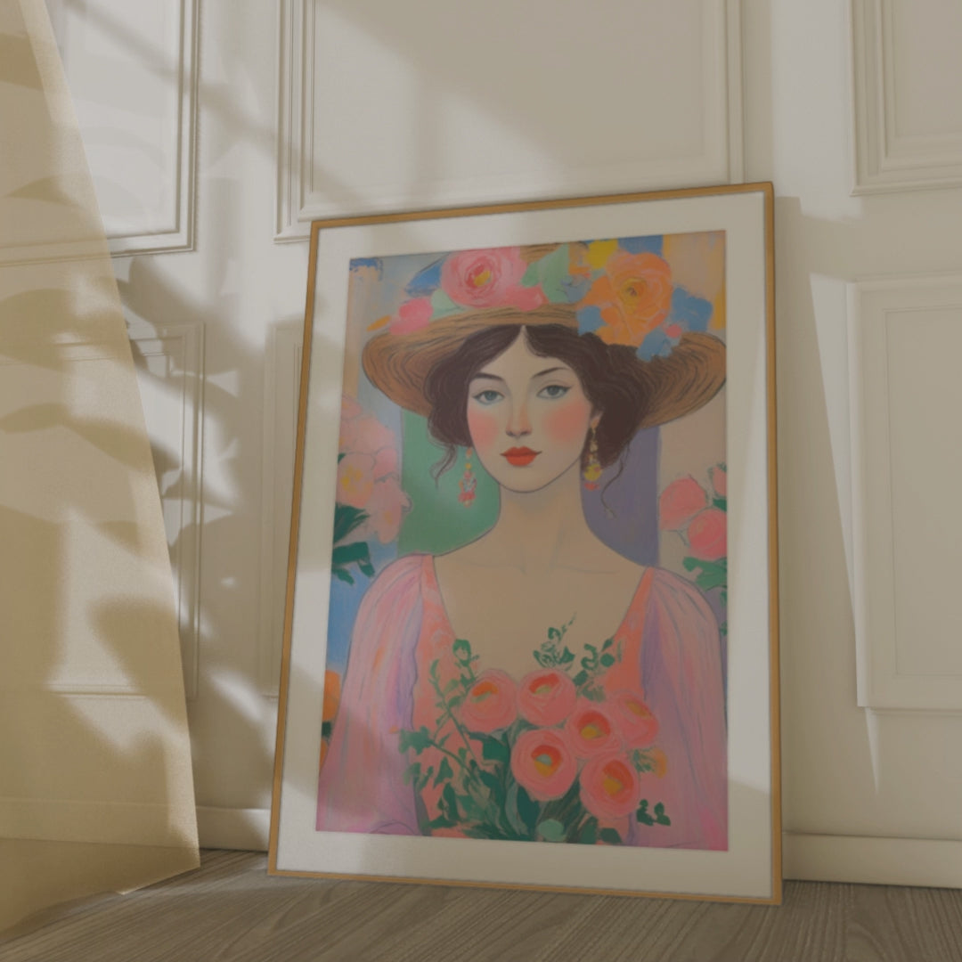 A radiant celebration of femininity and nature, Blossoms of Grace captures the timeless elegance of a painted lady adorned in a vibrant floral hat. Her serene gaze is framed by cascading colors, while a lush bouquet rests gently in her hands. The vivid palette bursting with bold pinks, electric blues, and golden hues infuses the portrait with life and emotion, inviting the viewer into a world where beauty blooms endlessly.