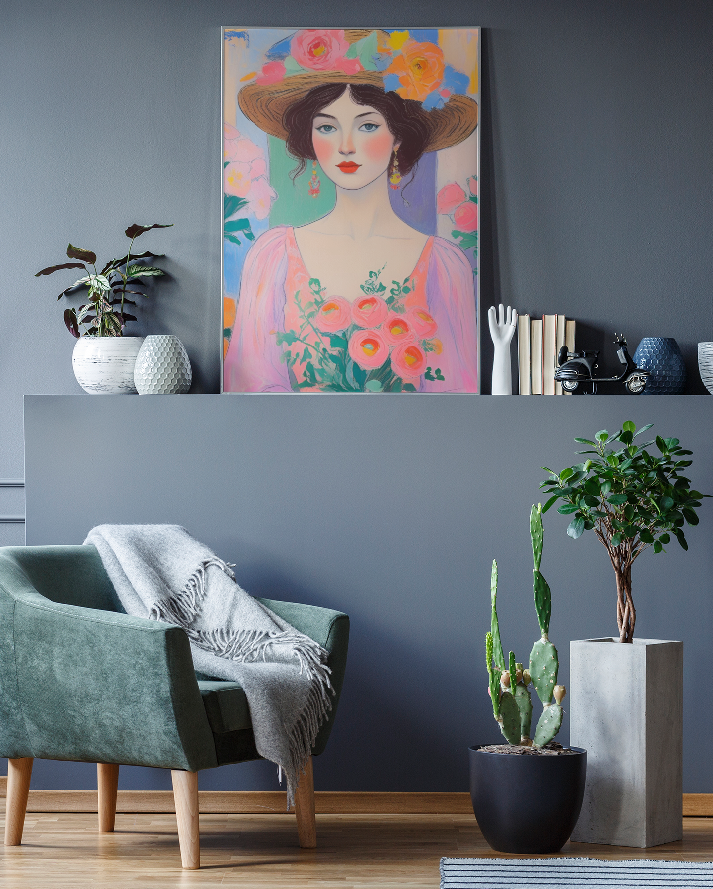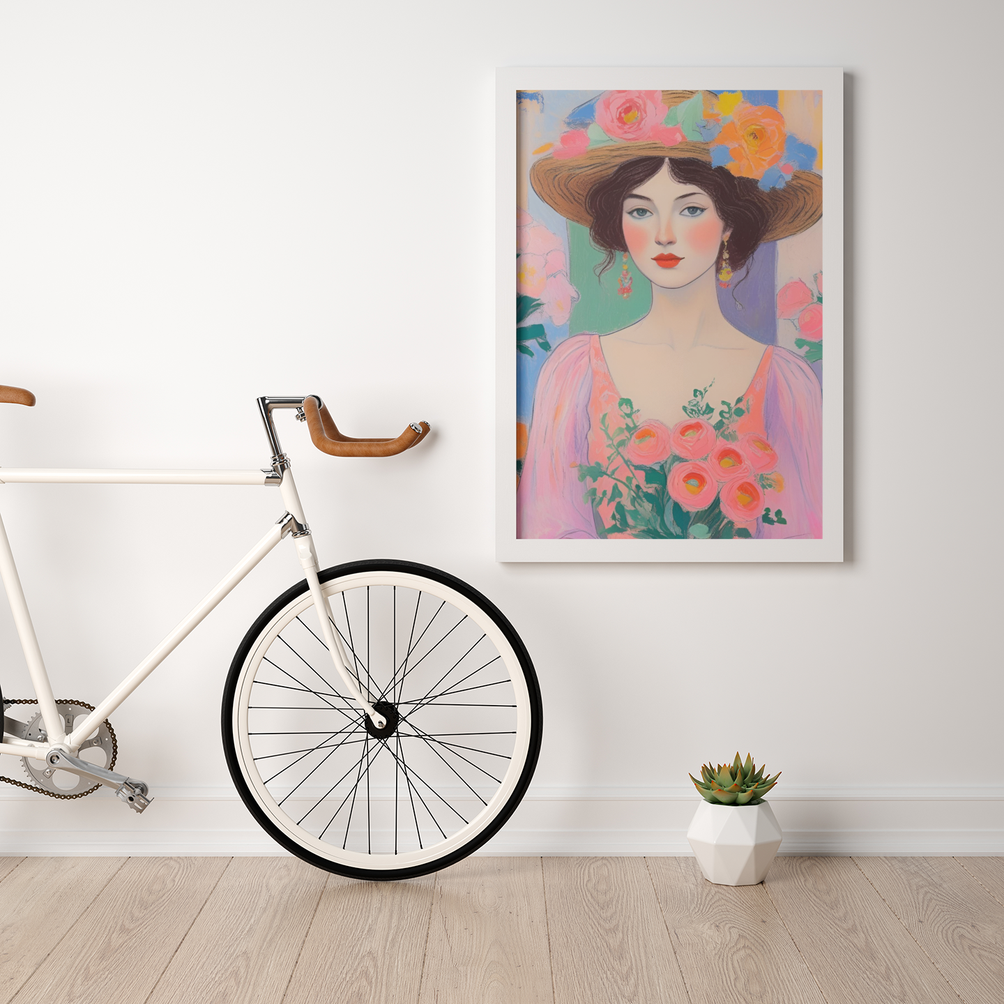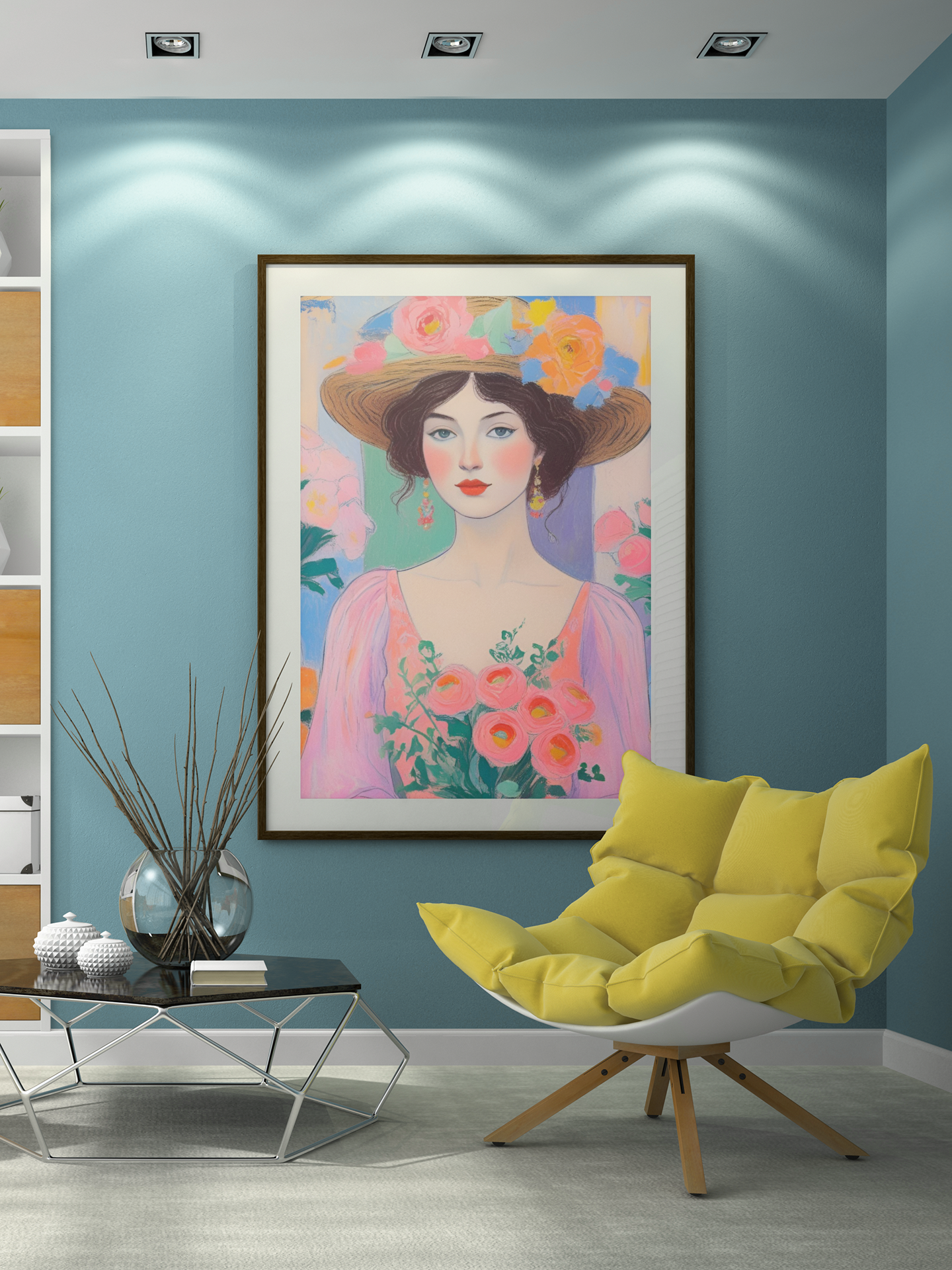 A radiant celebration of femininity and nature, Blossoms of Grace captures the timeless elegance of a painted lady adorned in a vibrant floral hat. Her serene gaze is framed by cascading colors, while a lush bouquet rests gently in her hands. The vivid palette bursting with bold pinks, electric blues, and golden hues infuses the portrait with life and emotion, inviting the viewer into a world where beauty blooms endlessly.
