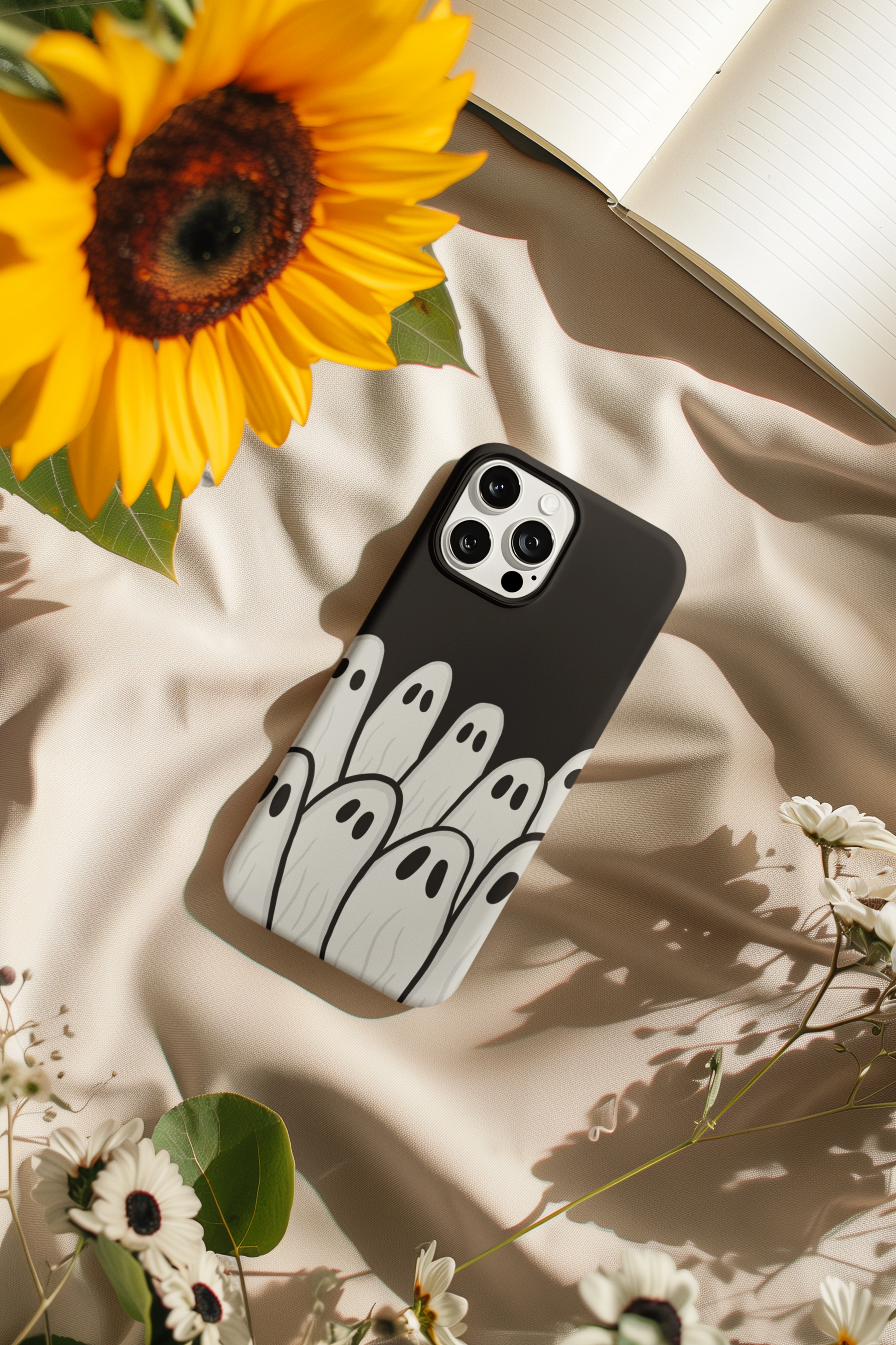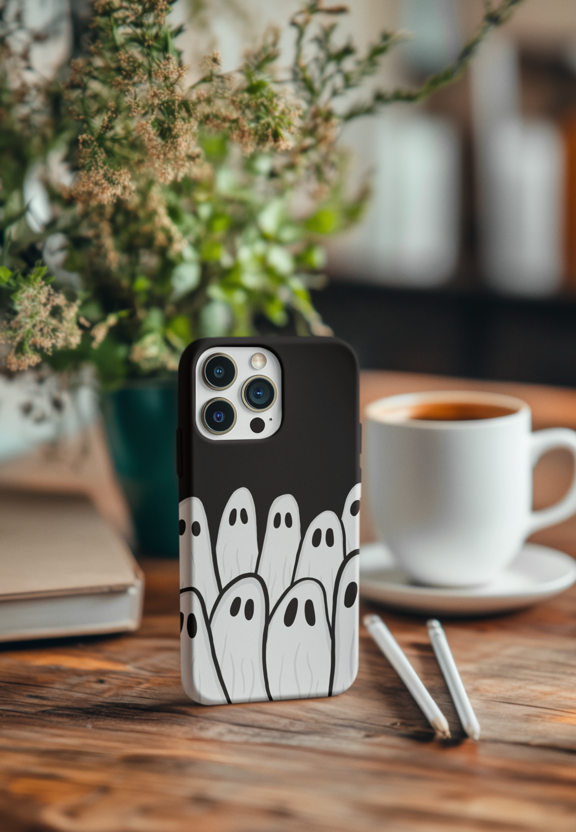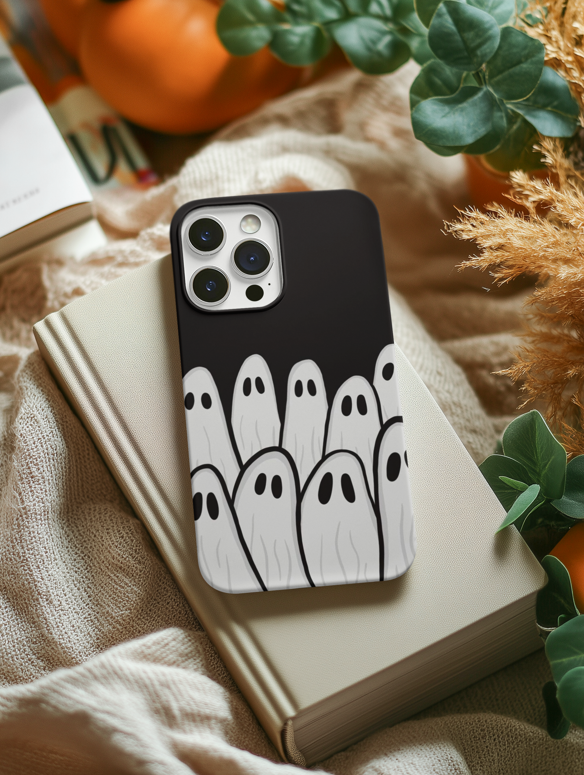 Simple, spooky, and effortlessly cool this phone case features a parade of playful white ghosts floating across a deep black background. With their soft, whimsical shapes and haunted little charm, these friendly phantoms bring just the right mix of mischief and minimalism.