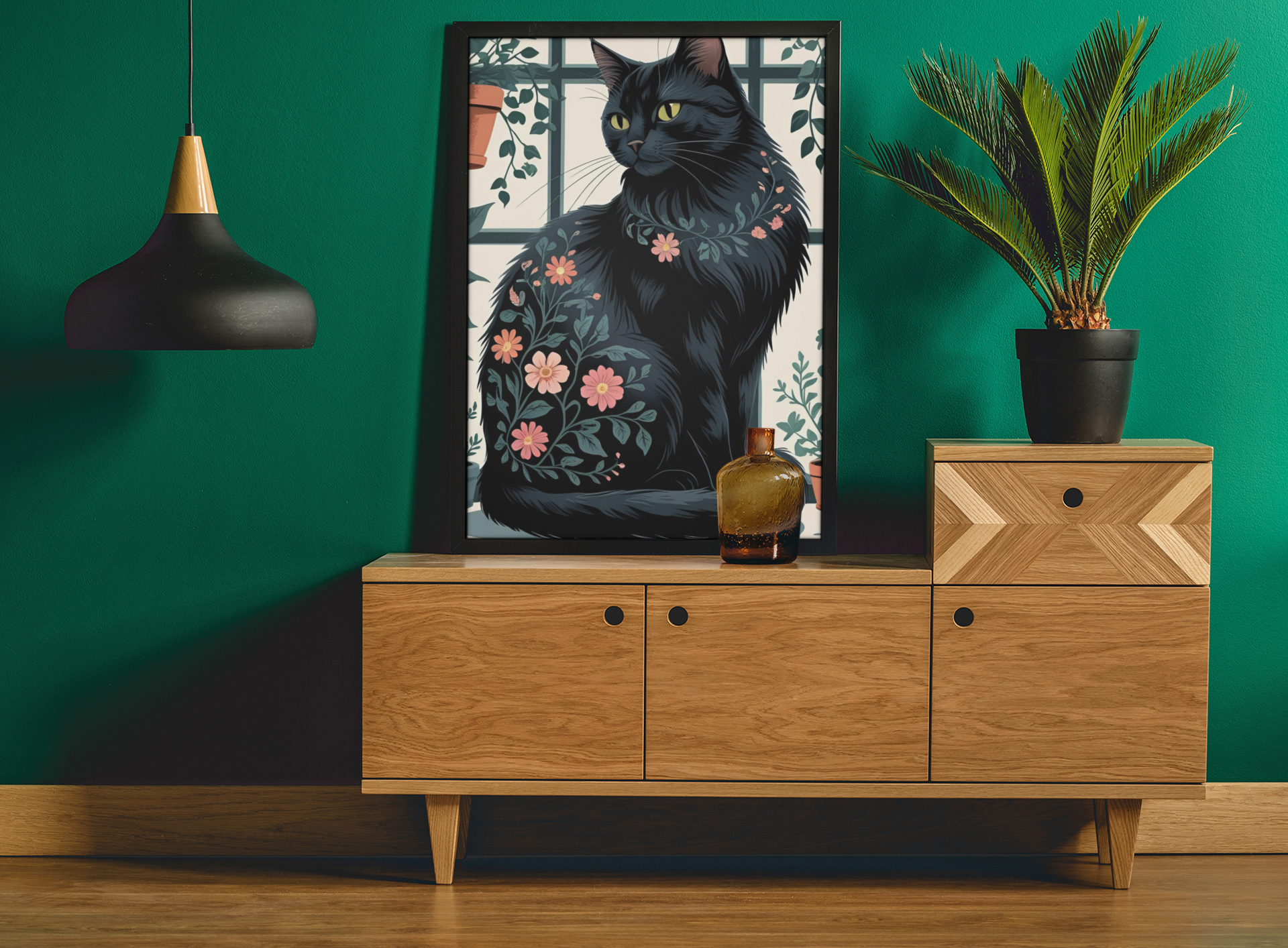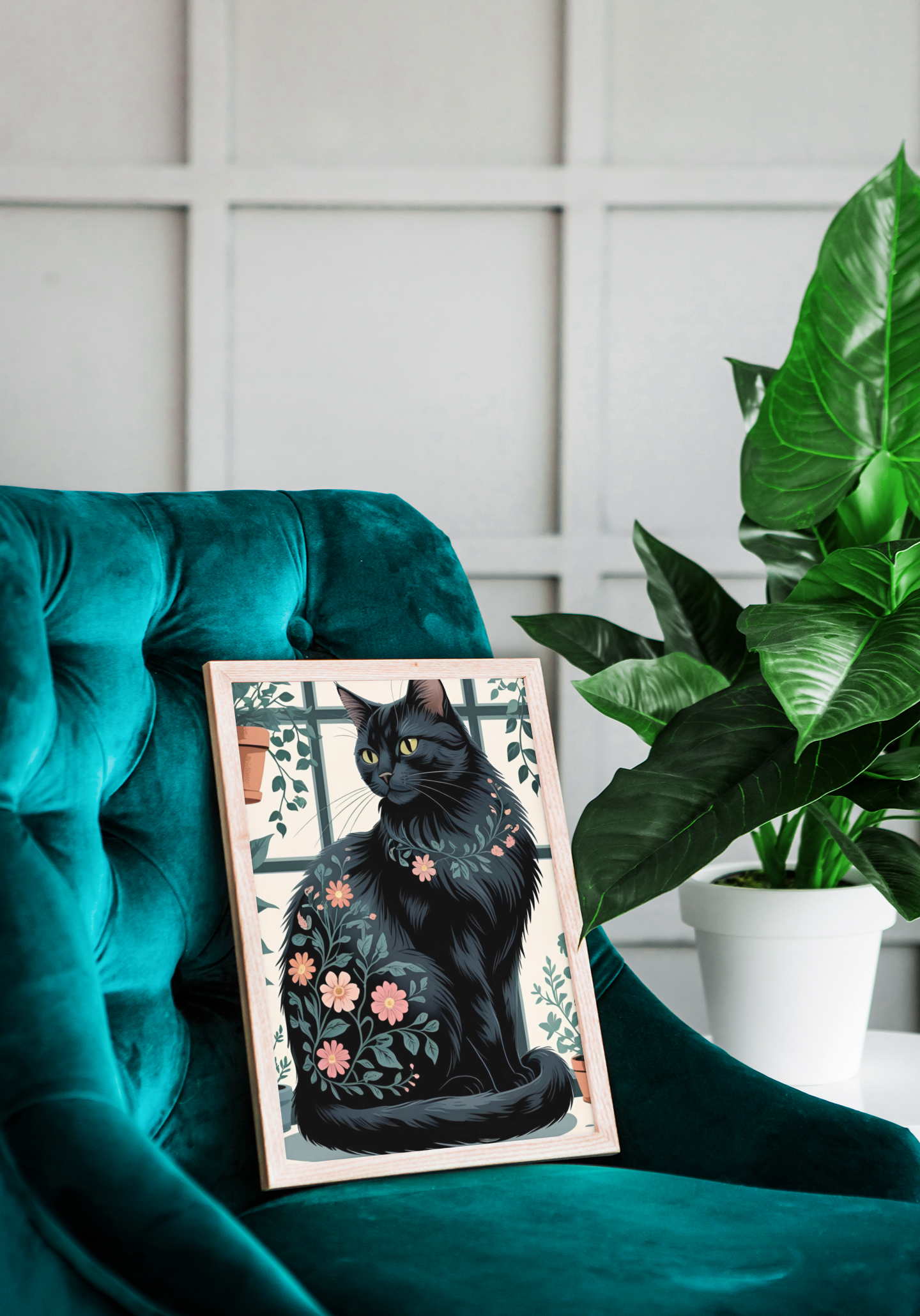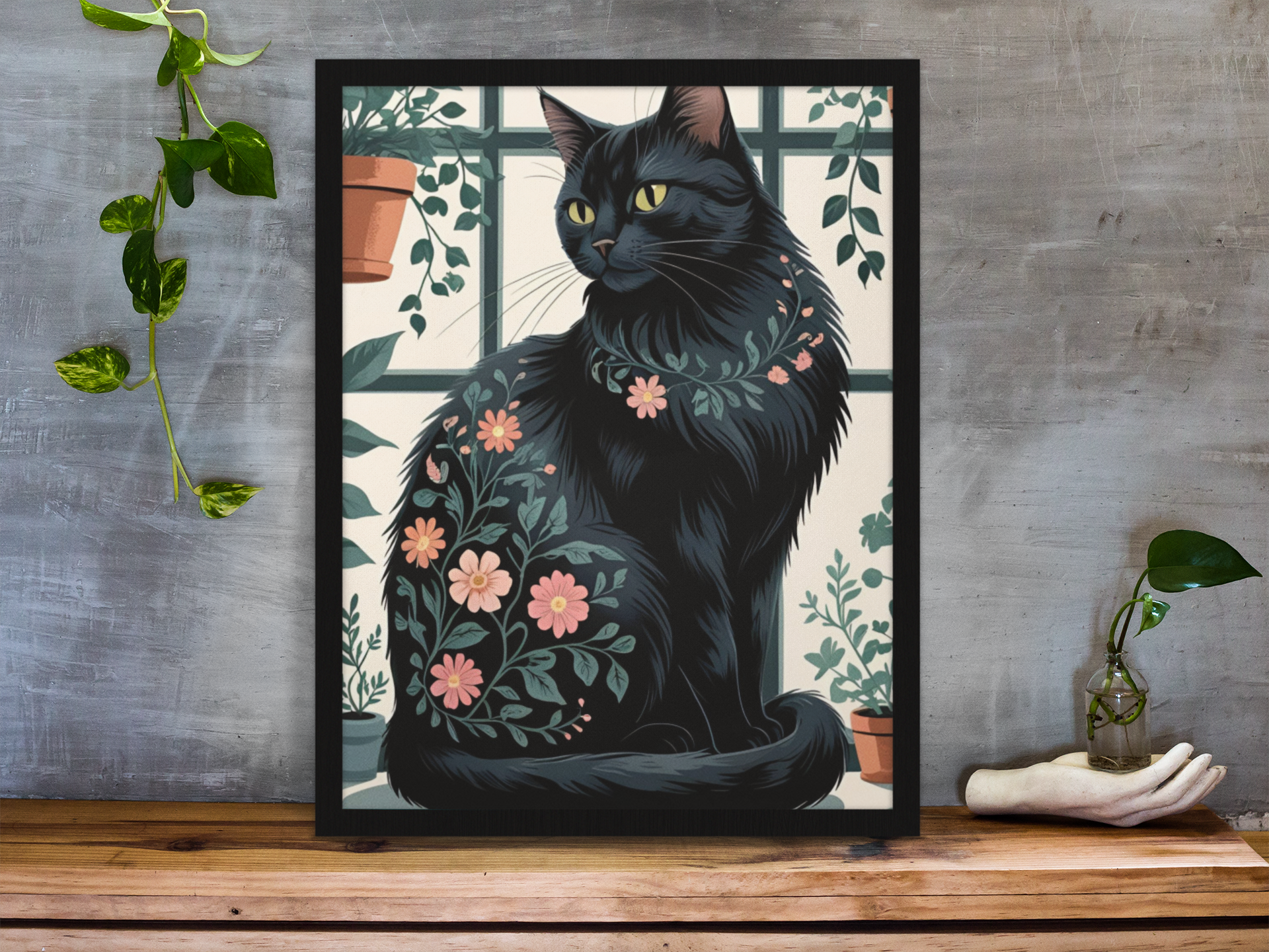 Mysterious and enchanting, this fancy black cat lounges in a world of winding vines and blossoming florals. With piercing eyes and a coat kissed by delicate botanical patterns, she’s part feline, part fairytale. Set against a lush tapestry of plants and greenery, this satin-finish poster adds a touch of magic, mystery, and wild beauty to any space. Perfect for cat lovers, plant parents, and dreamers alike.
