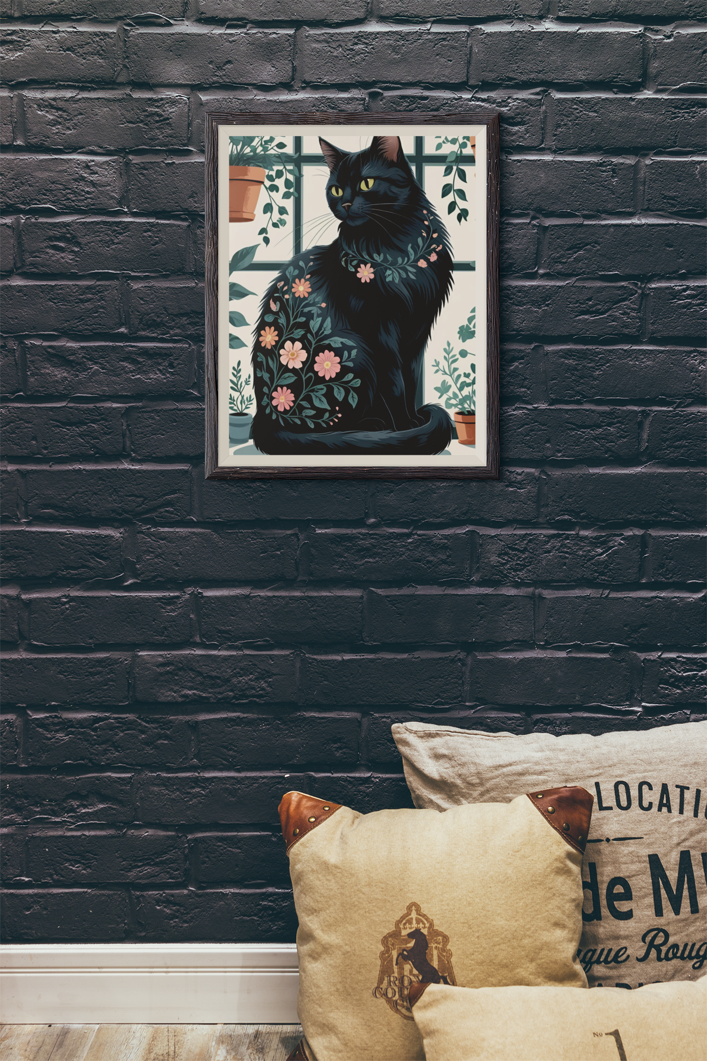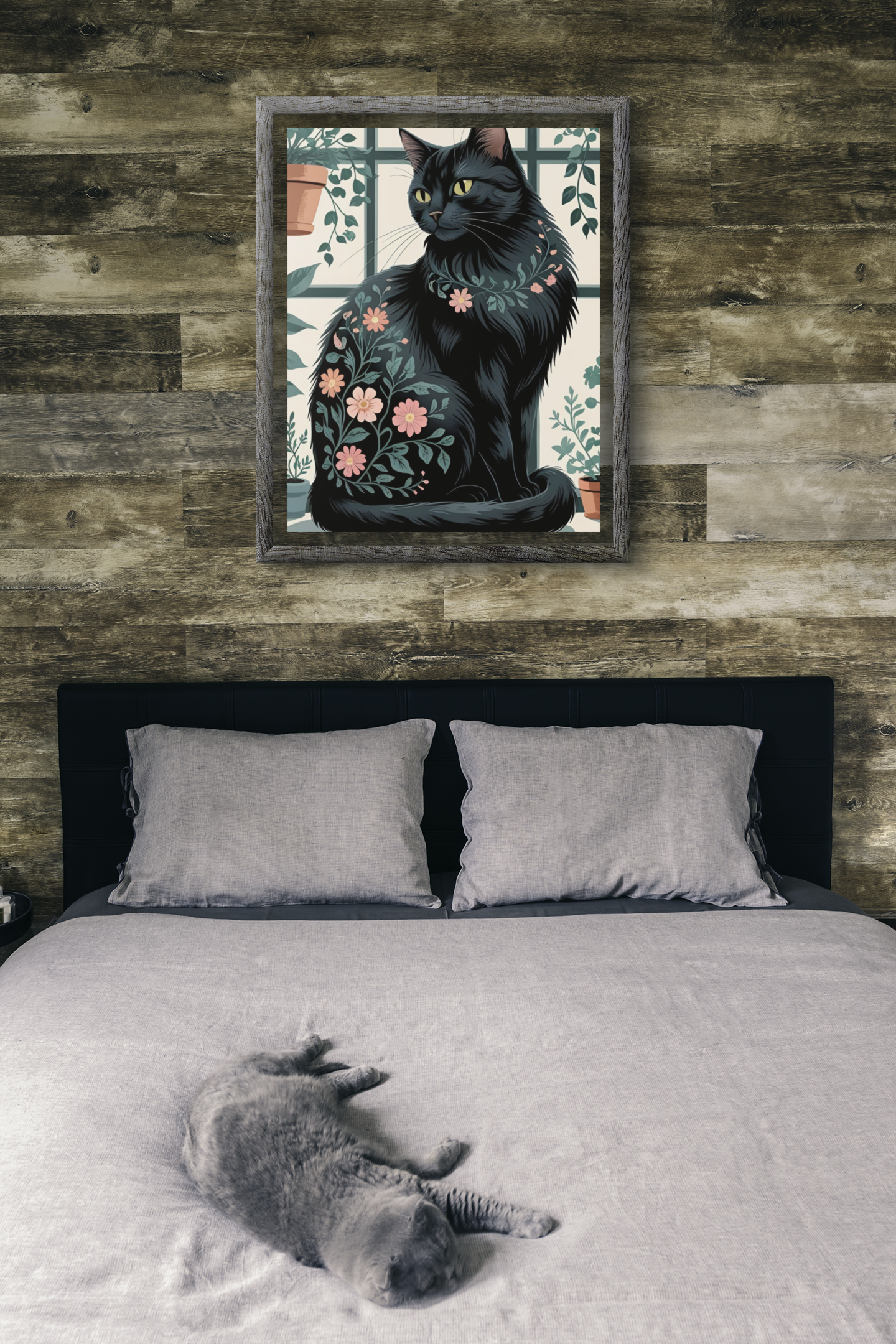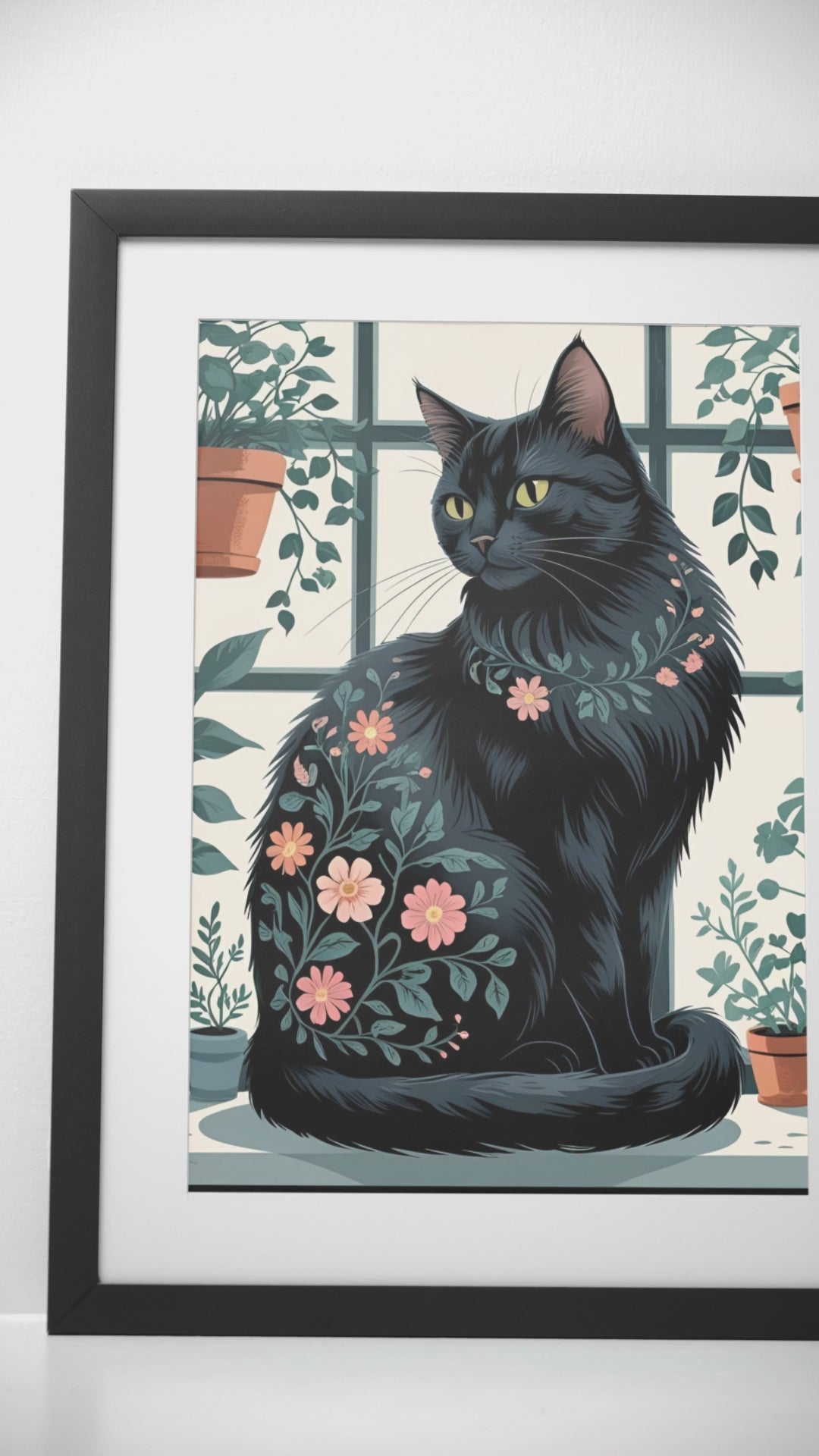 Mysterious and enchanting, this fancy black cat lounges in a world of winding vines and blossoming florals. With piercing eyes and a coat kissed by delicate botanical patterns, she’s part feline, part fairytale. Set against a lush tapestry of plants and greenery, this satin-finish poster adds a touch of magic, mystery, and wild beauty to any space. Perfect for cat lovers, plant parents, and dreamers alike.
