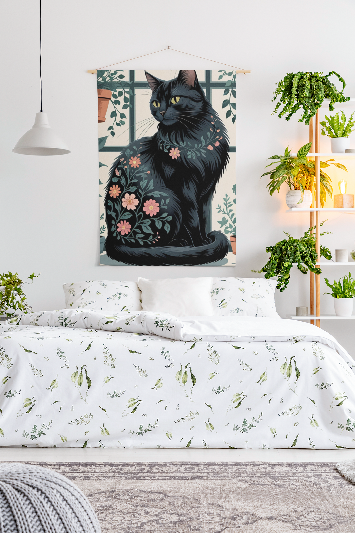 Botanical Purrfection - Floral Black Cat Satin Poster