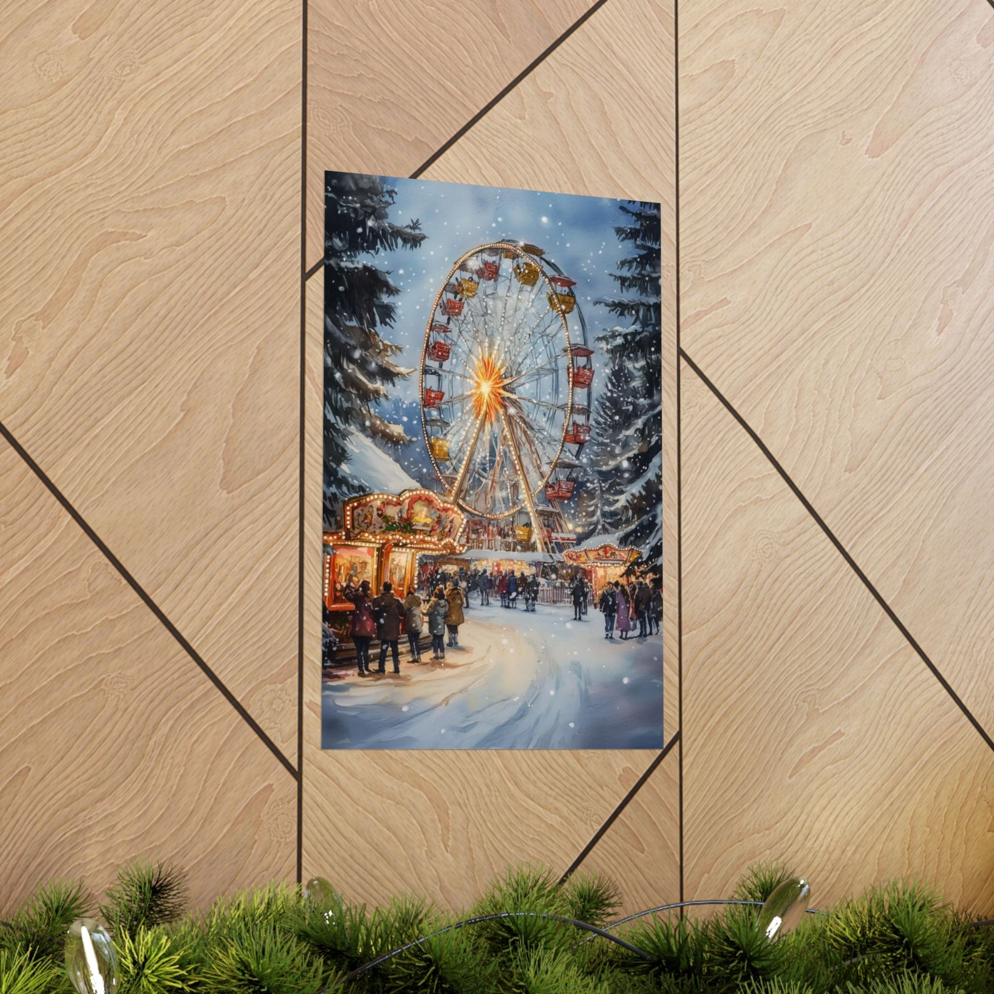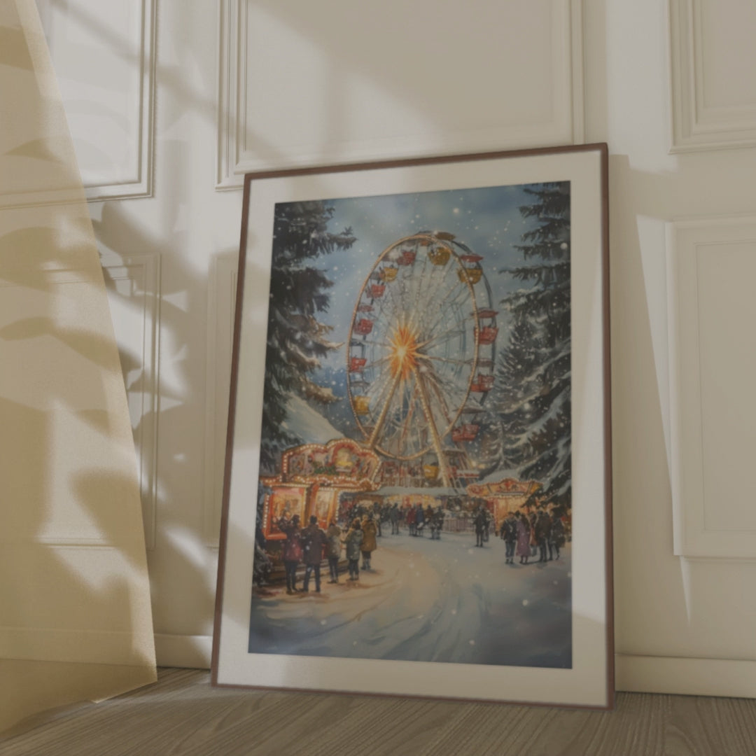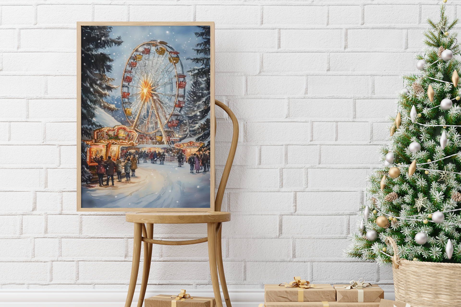 Step into a magical winter carnival where laughter floats through the frosty air and snowflakes twirl like confetti. Beneath a sky dusted with snow, joyful crowds gather among twinkling lights, candy-striped tents, and the soft crunch of snow underfoot. A glowing Ferris wheel spins slowly in the distance, its lights shimmering like stars above the merry scene. This dreamy winter wonderland captures the heart of holiday magic where every moment feels like a snow globe come to life.