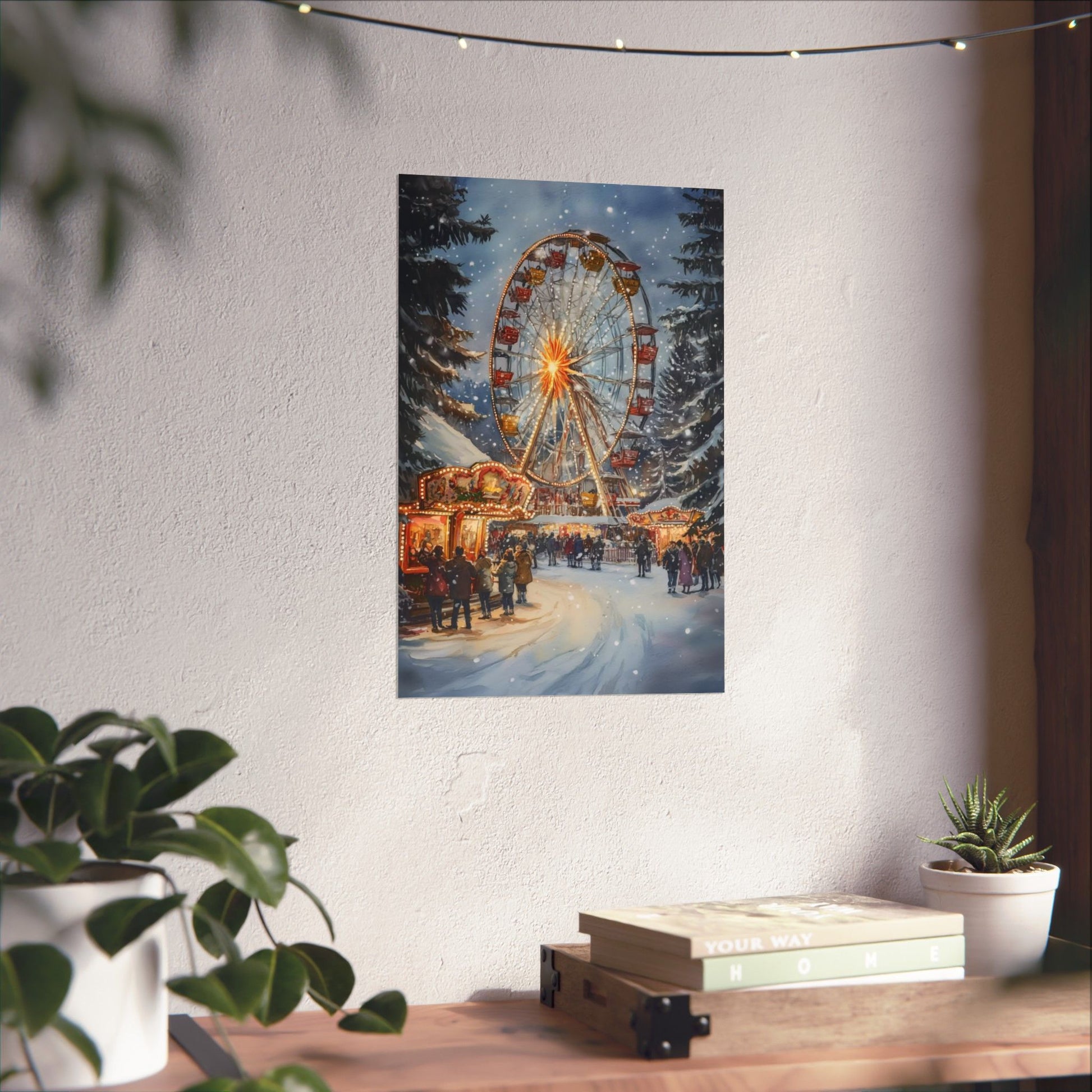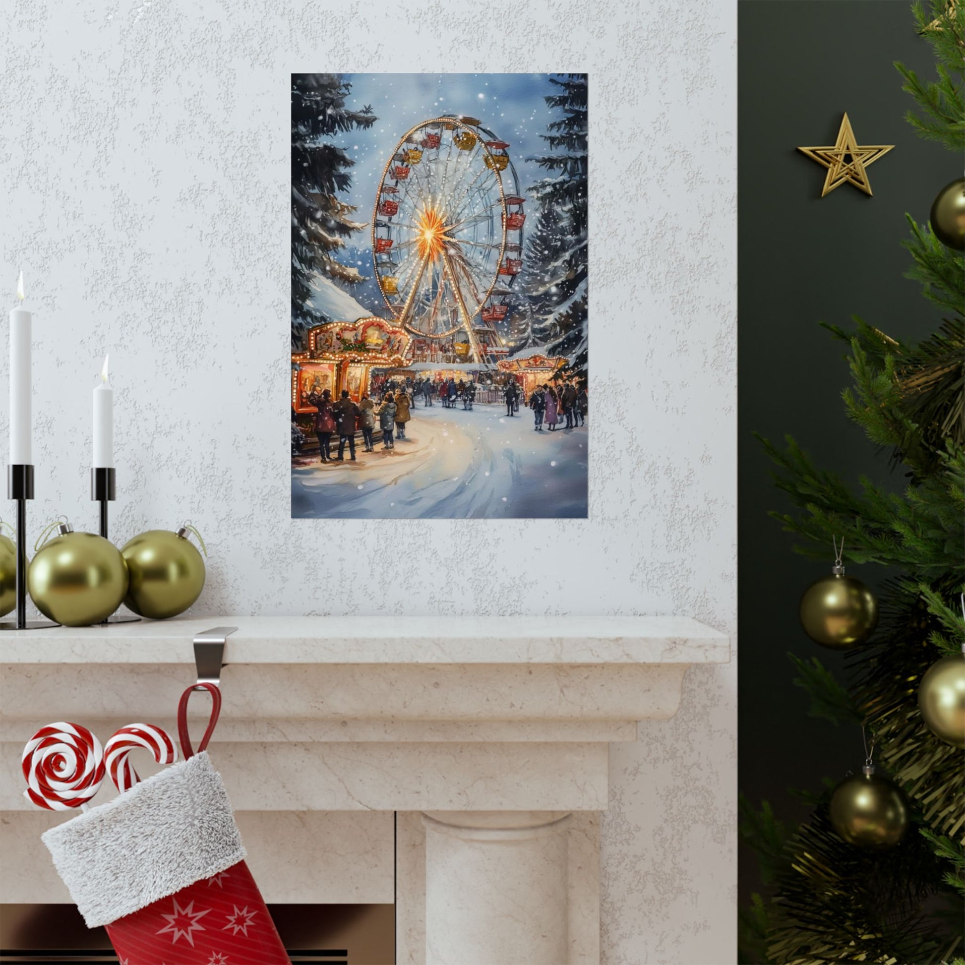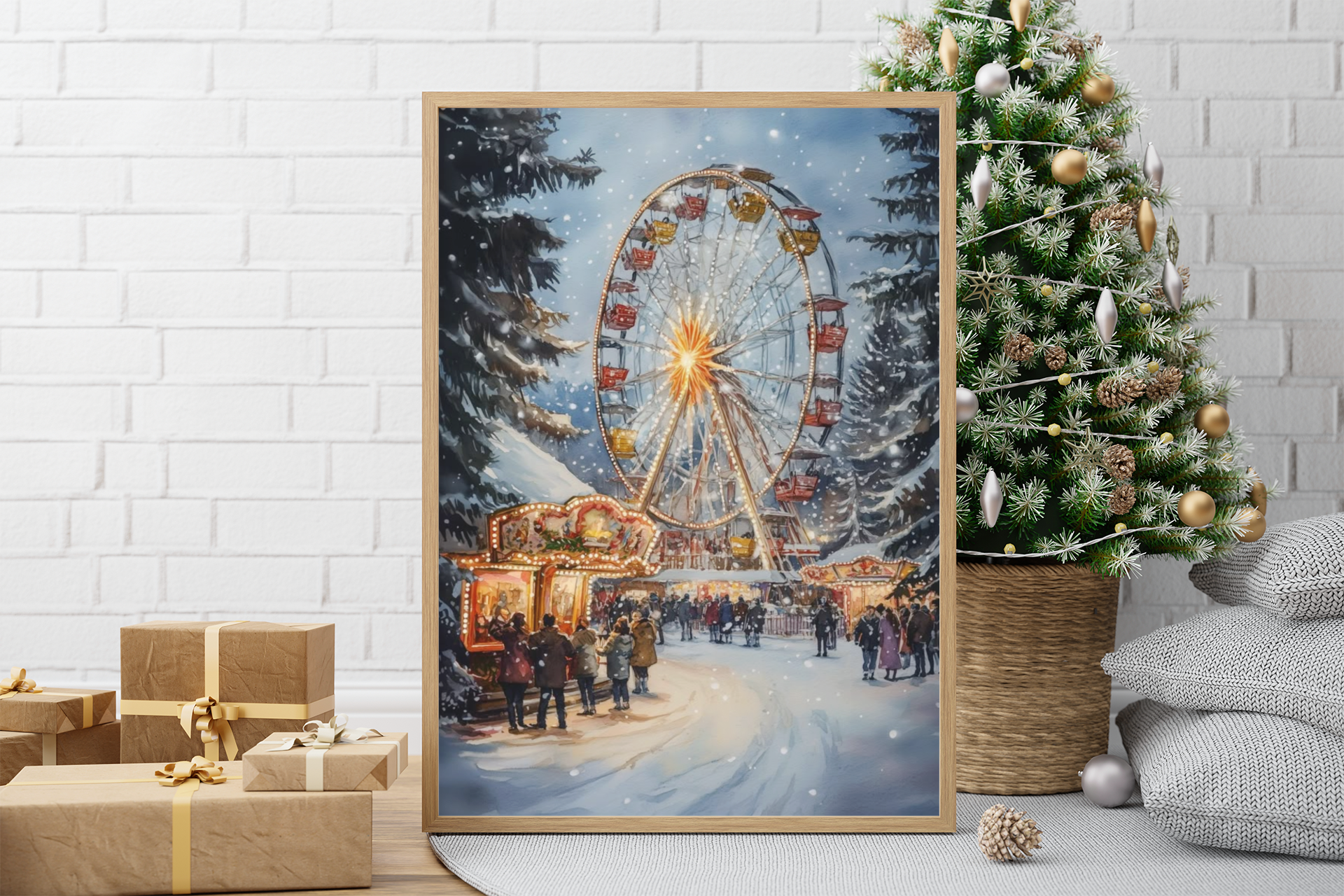 Step into a magical winter carnival where laughter floats through the frosty air and snowflakes twirl like confetti. Beneath a sky dusted with snow, joyful crowds gather among twinkling lights, candy-striped tents, and the soft crunch of snow underfoot. A glowing Ferris wheel spins slowly in the distance, its lights shimmering like stars above the merry scene. This dreamy winter wonderland captures the heart of holiday magic where every moment feels like a snow globe come to life.
