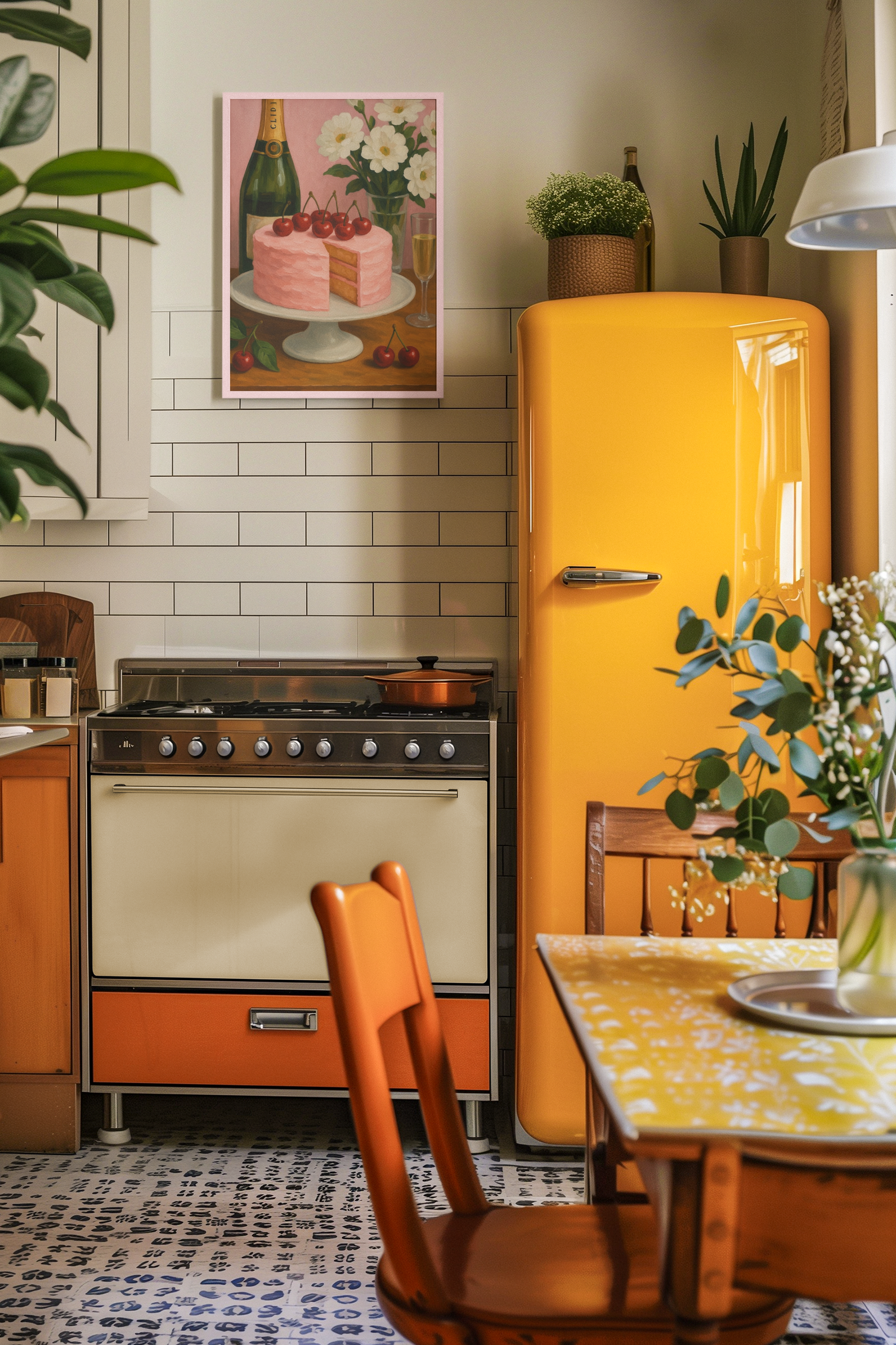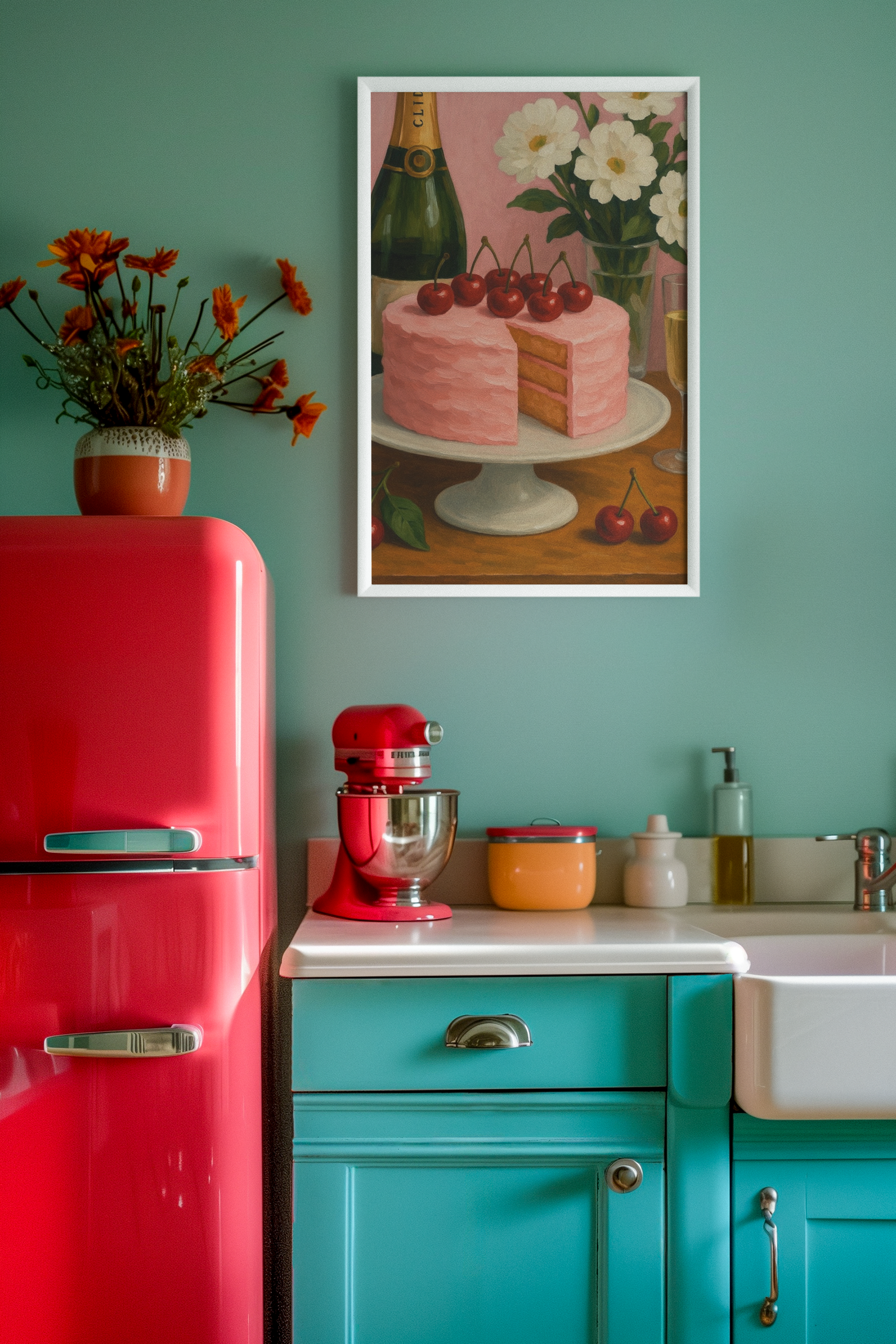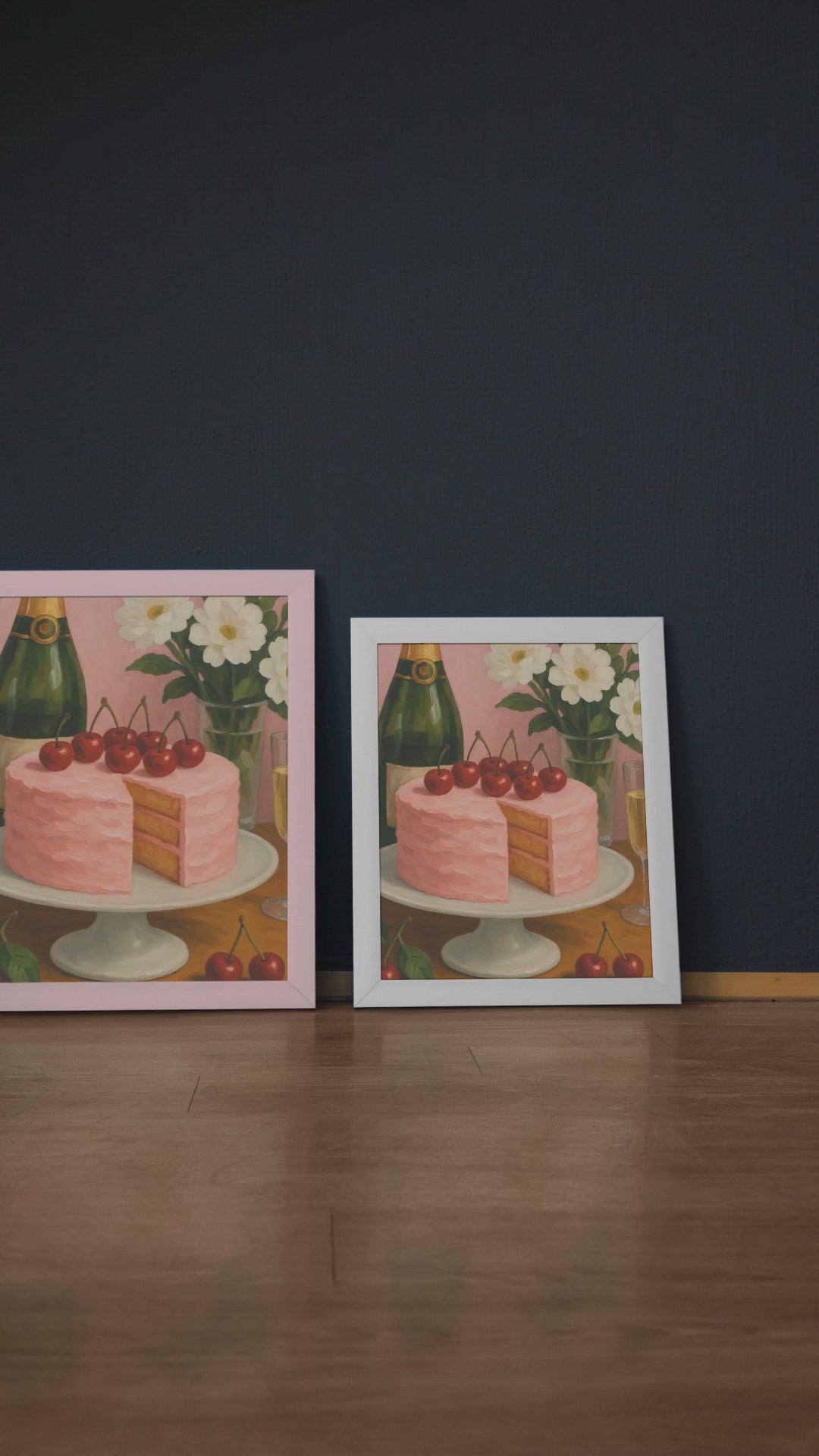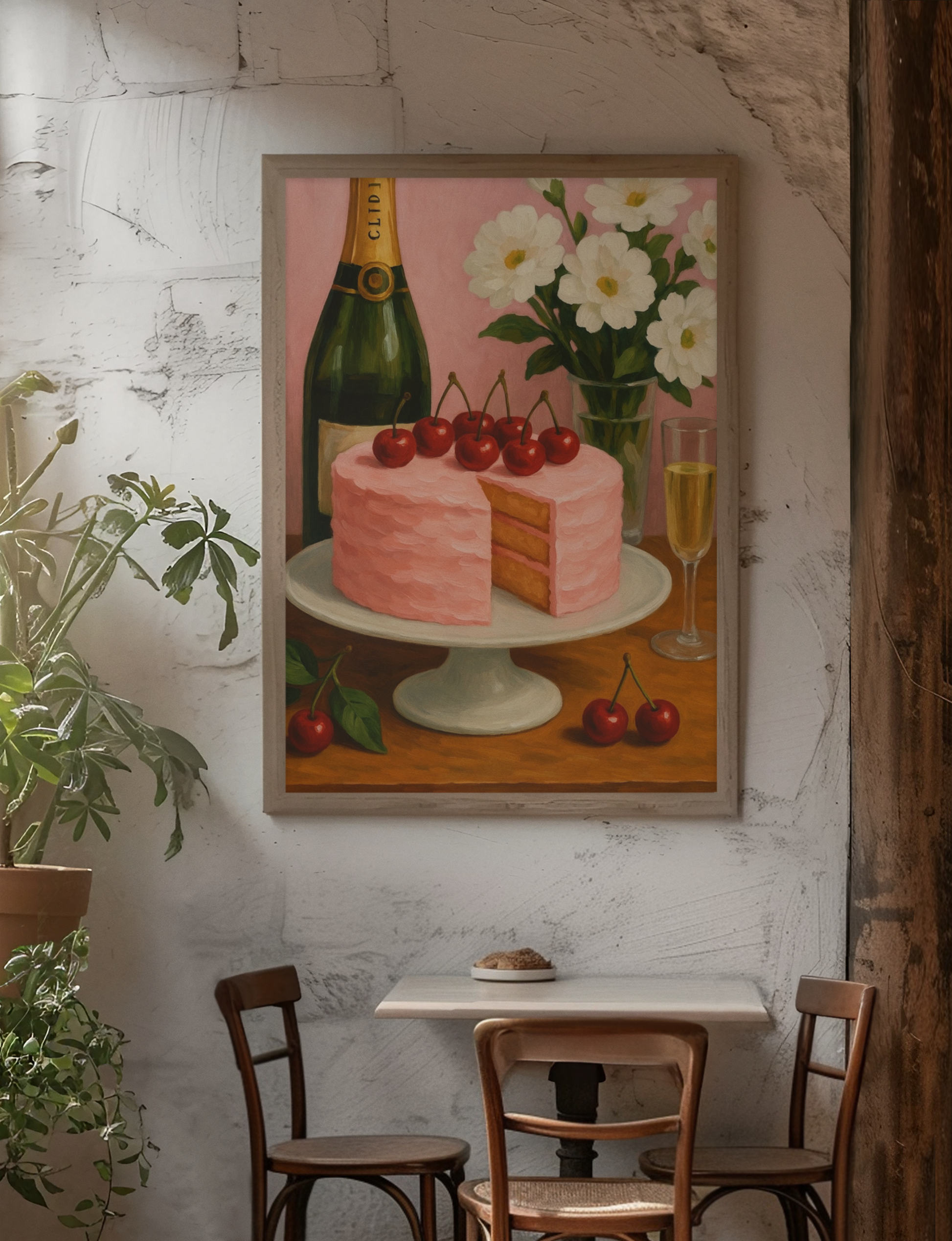 Indulge your senses with this elegant wall art featuring a decadent cherry cake paired with a sparkling glass of champagne. Adorned with glistening cherries and set against a soft, dreamy backdrop, this piece captures the luxurious joy of celebration and sweetness in every detail. Perfect for kitchens, dining rooms, bakeries, or anyone who loves a touch of romance and refinement. Let the rich reds and golden bubbles bring a tasteful charm to your space where dessert meets delight.