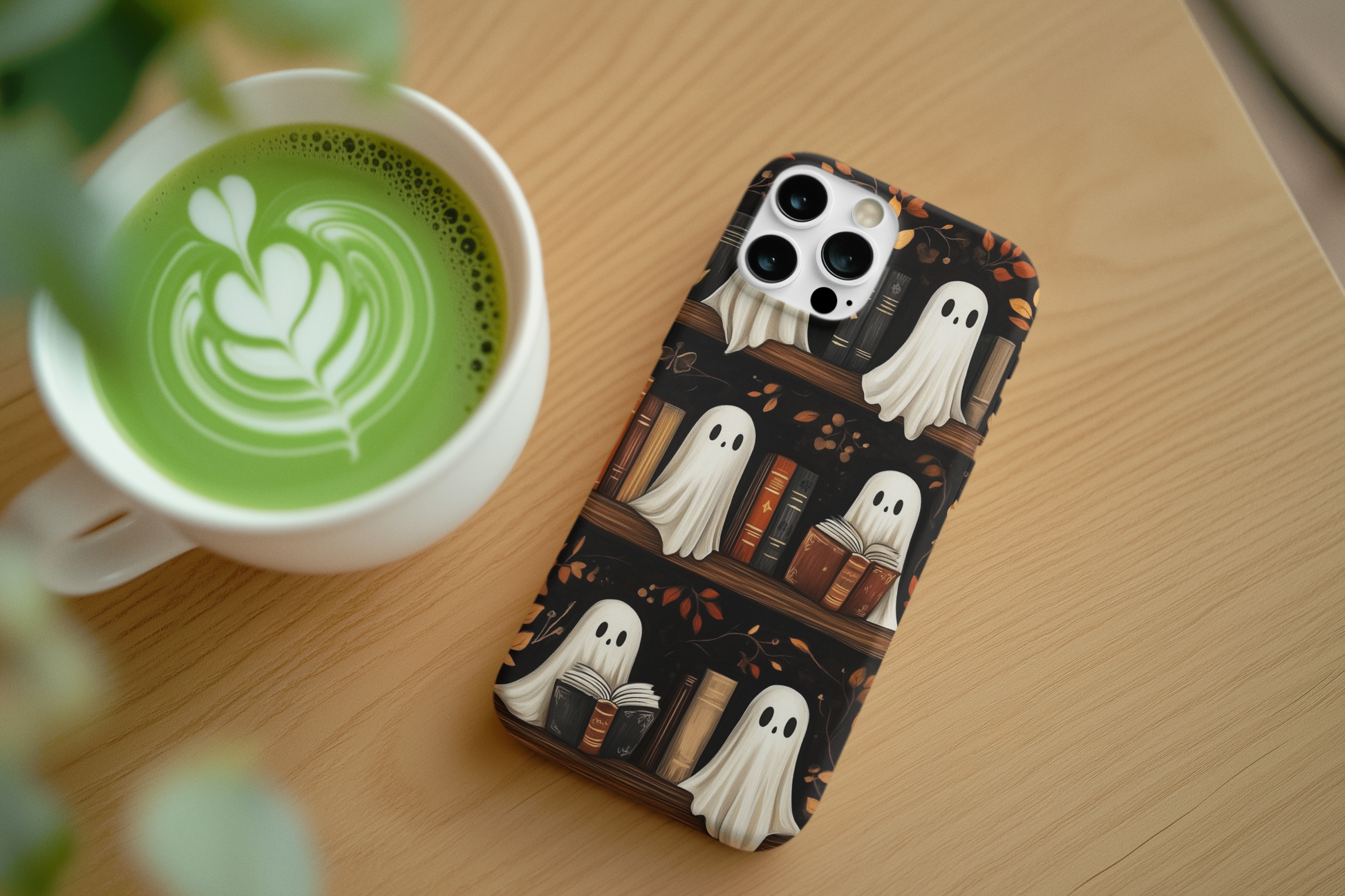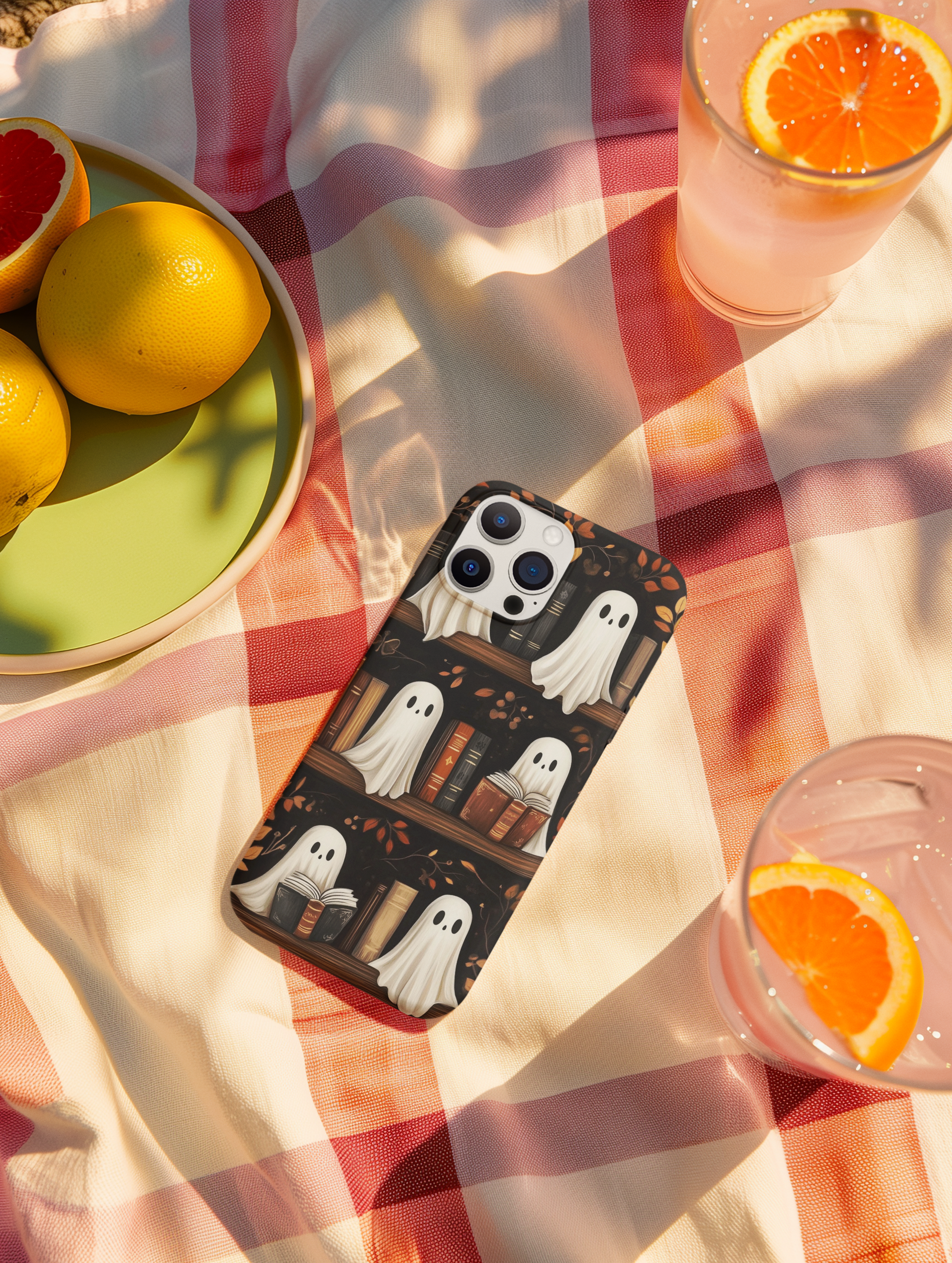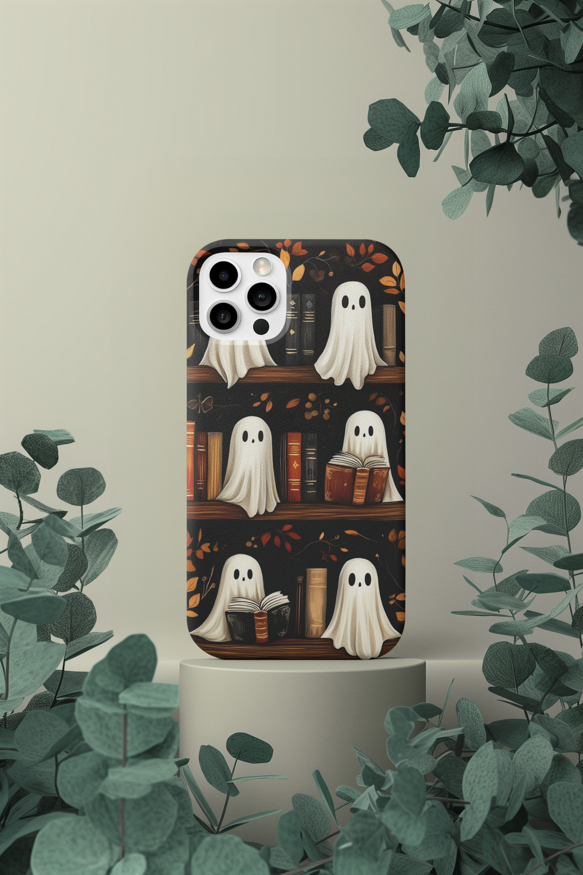 Where spooky meets sweet! This adorable phone case features cozy little ghosts perched on a bookshelf, completely absorbed in their favorite books. Surrounded by stacked stories and haunted tales, these bookish spirits bring a touch of Halloween magic to every page and every phone call.