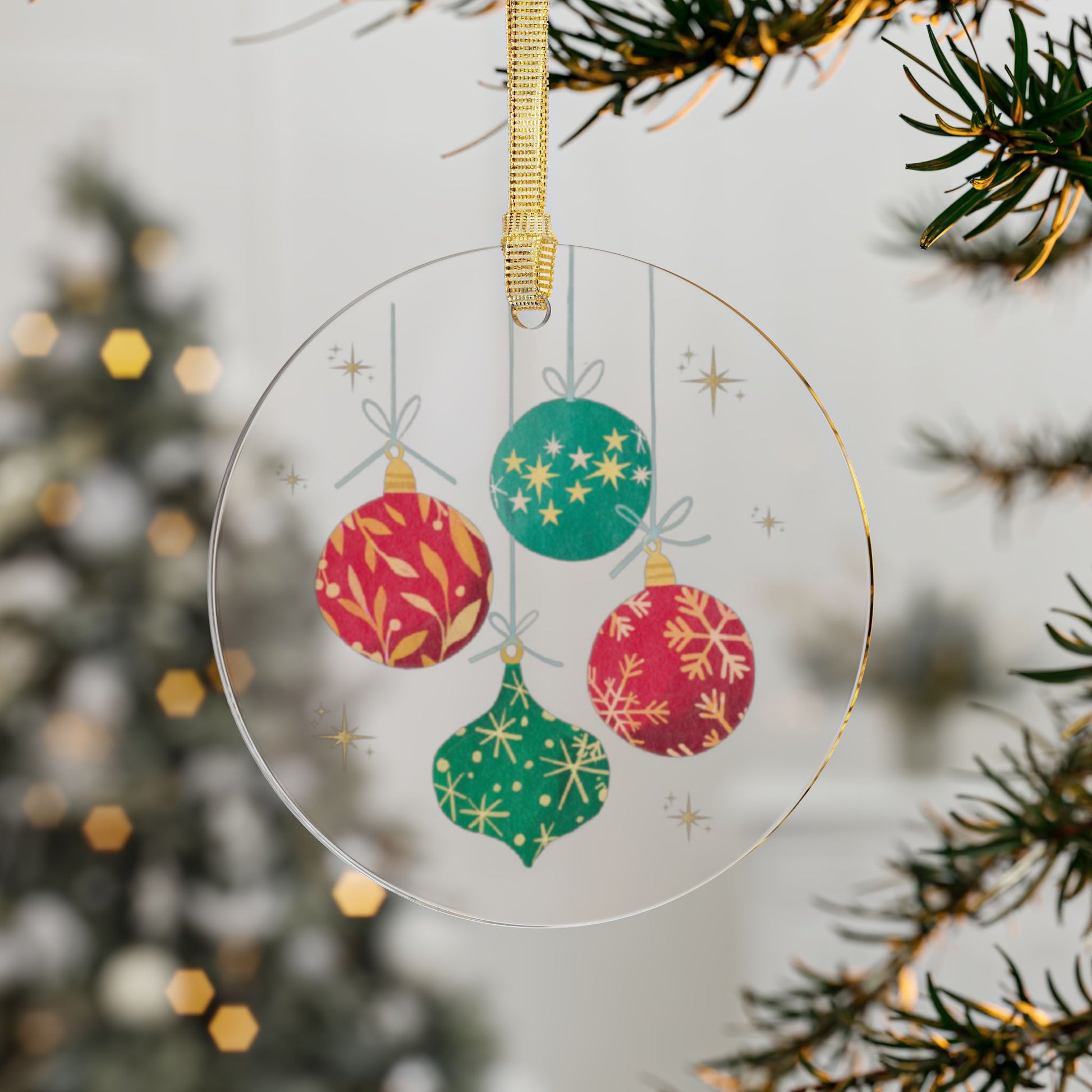 A celebration of classic Christmas charm, this clear acrylic ornament captures the magic of holiday decorating in one sparkling moment. Inside, tiny red and green baubles dangle delicately, like miniature treasures suspended in midair, while golden twinkles shimmer all around like stardust caught in a snow globe. Light, bright, and full of festive cheer, it’s a joyful nod to the timeless beauty of trimming the tree.fetime!