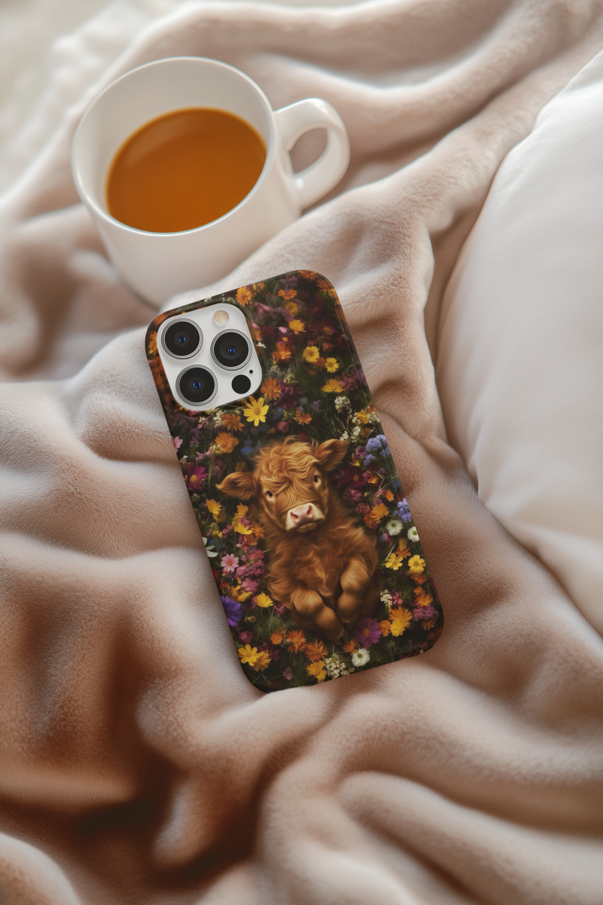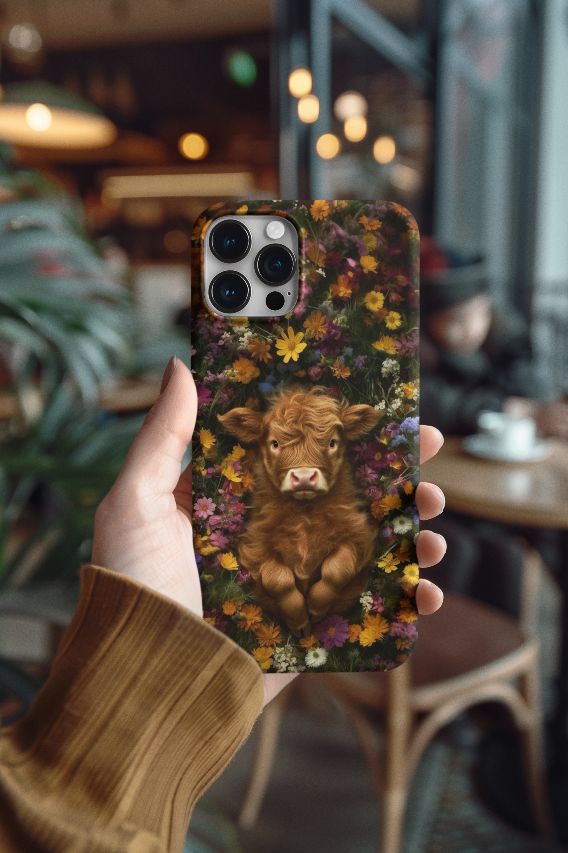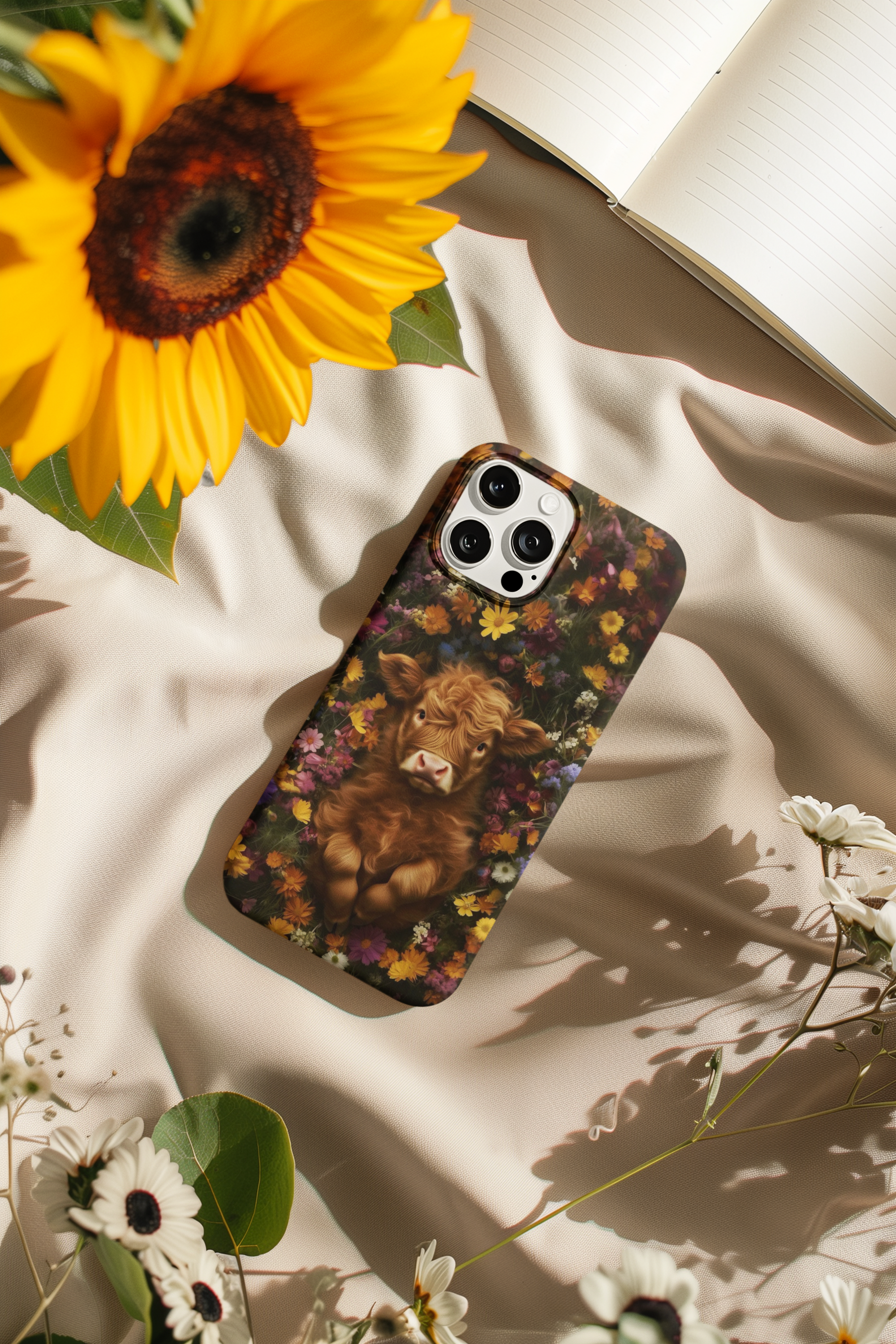 Let your phone rest in the peaceful charm of the countryside with this enchanting case featuring a fluffy red-haired Highland cow nestled in a field of wildflowers. With her gentle gaze and windswept fringe, she brings a calming touch of rustic beauty everywhere you go.