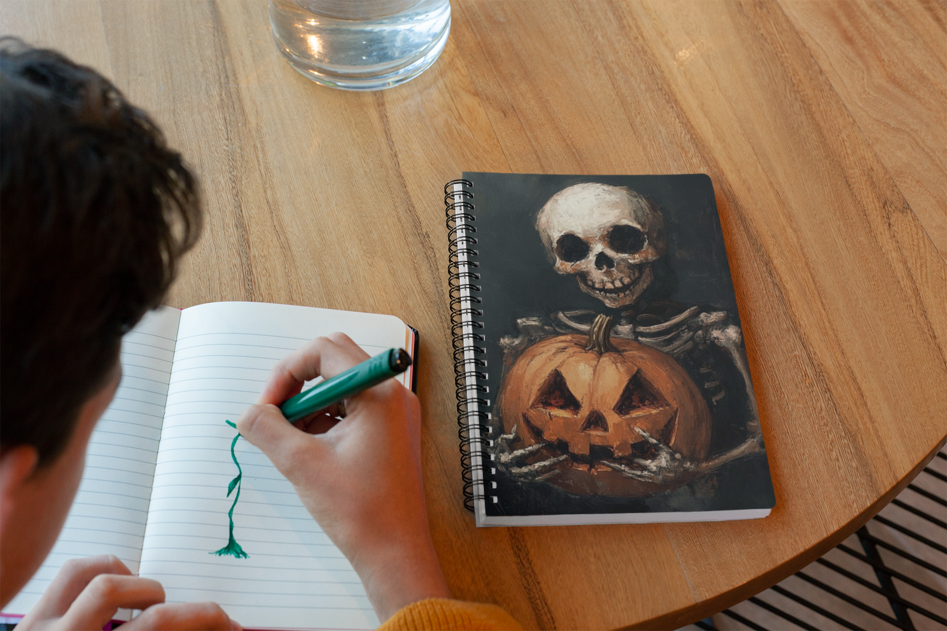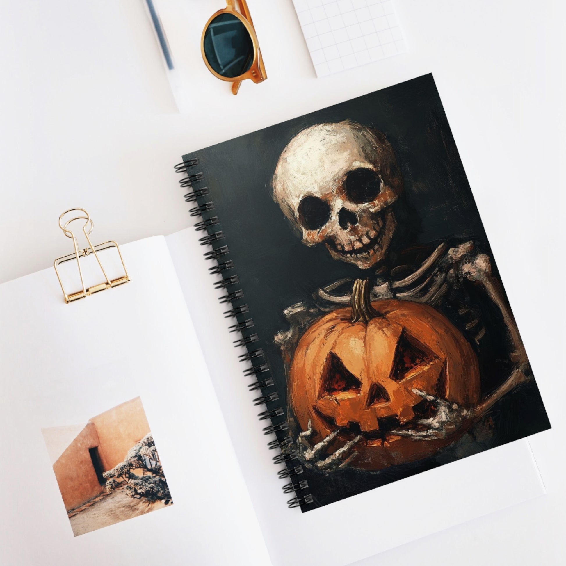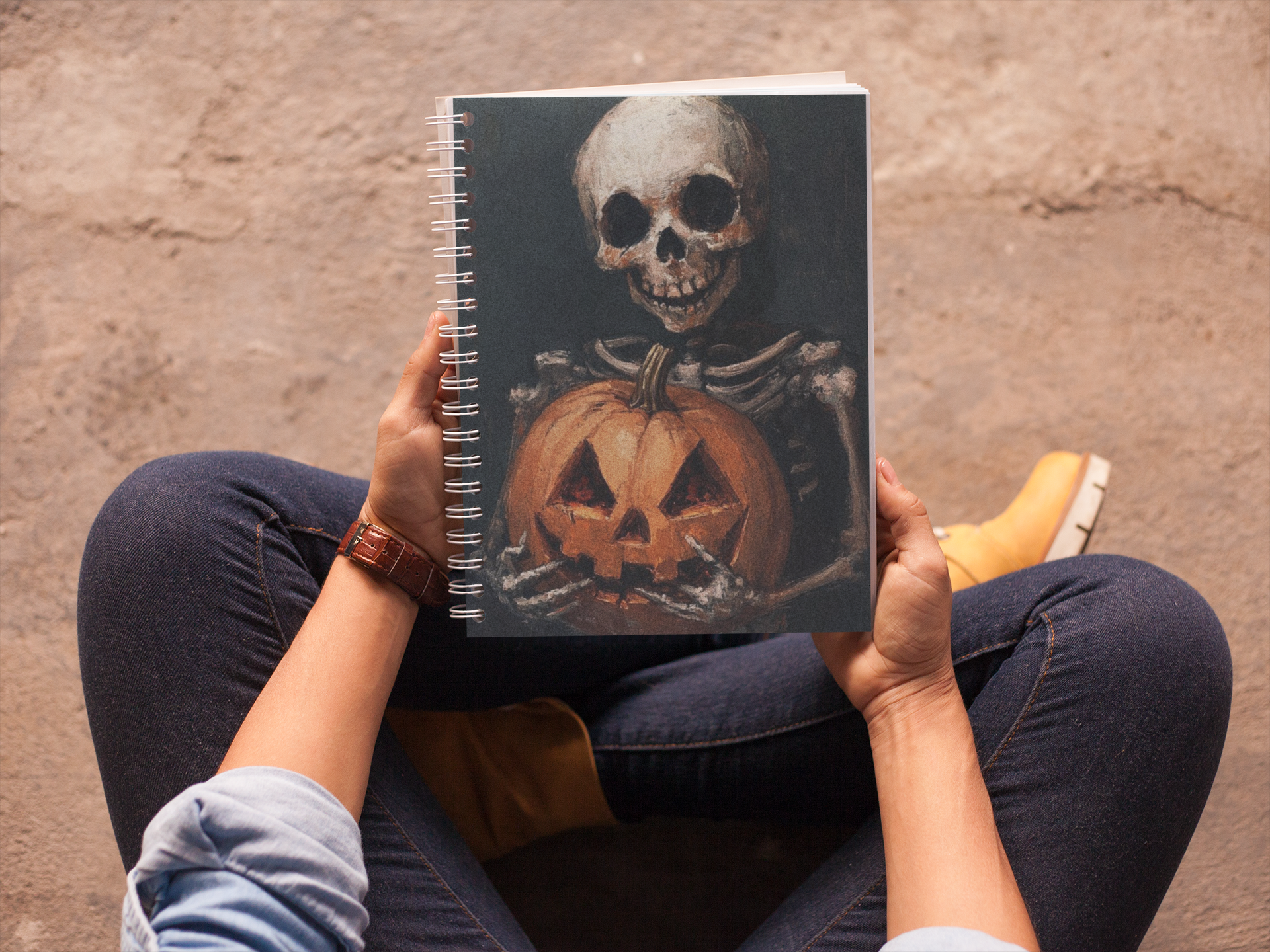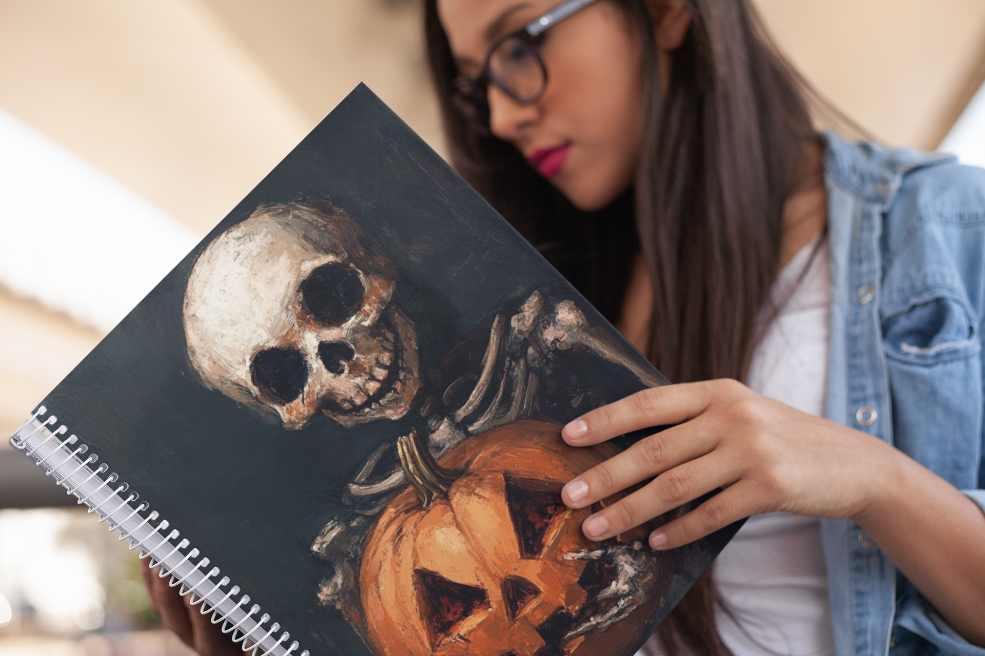 Set against a midnight-black backdrop, a grinning skeleton cradles a glowing jack-o’-lantern its eerie light flickering like a secret waiting to be told. With hollow eyes and bony fingers, this charmingly creepy figure stands as a keeper of autumn mischief and moonlit musings. Perfect for ghost stories, haunted thoughts, or dark daydreams, this notebook invites you to write between the shadows... if you dare.