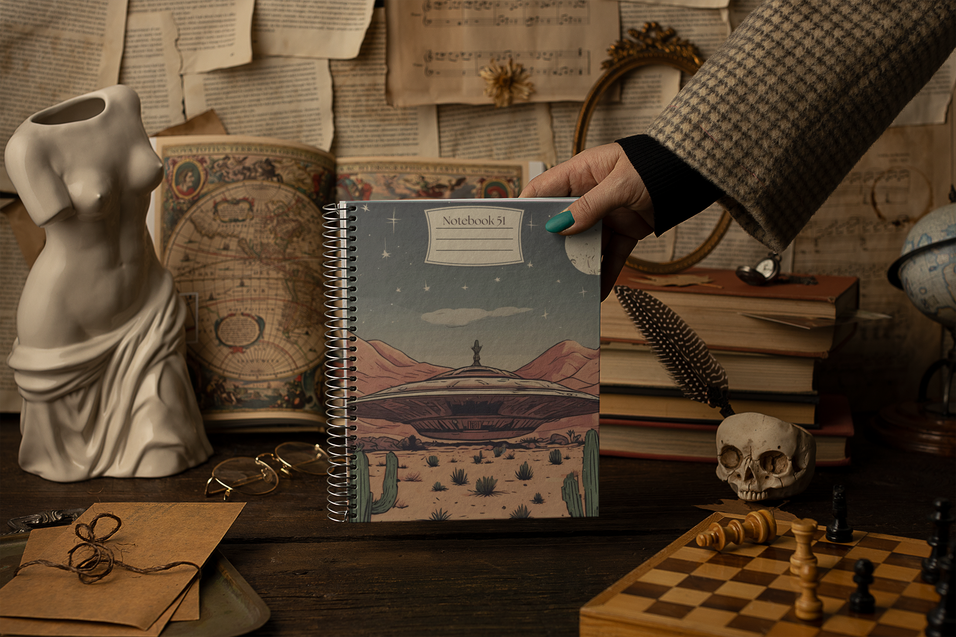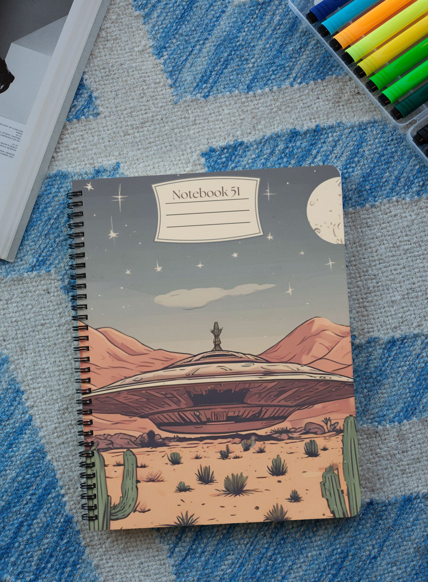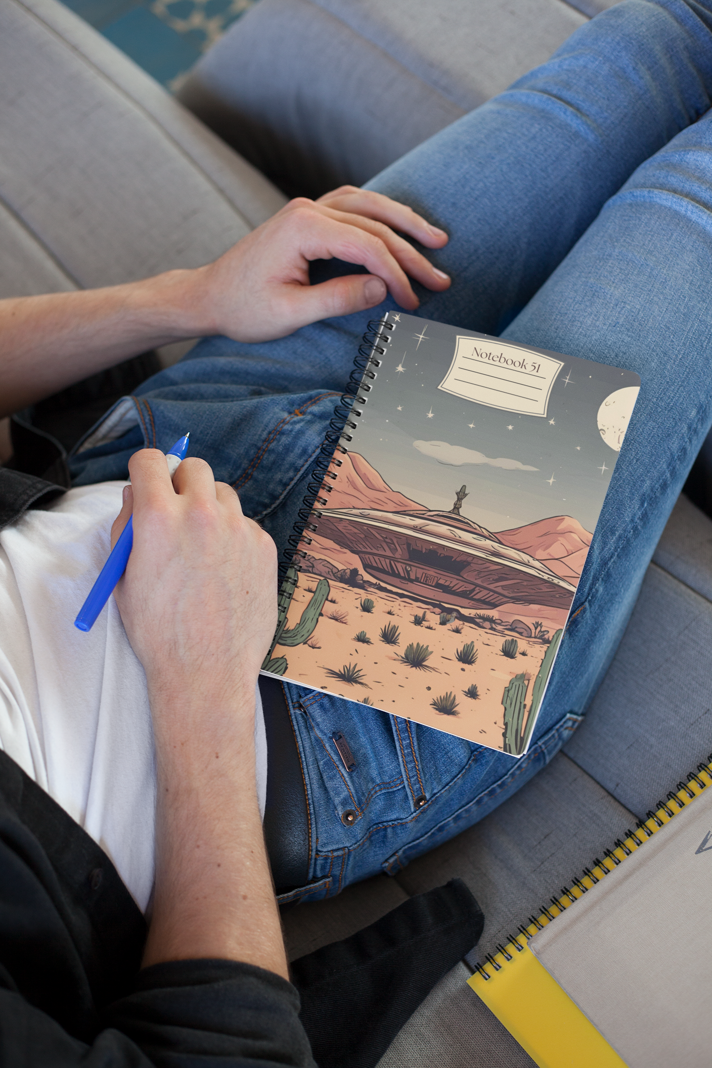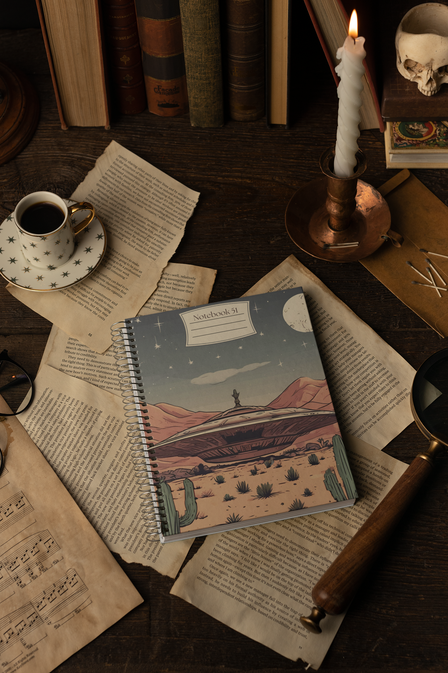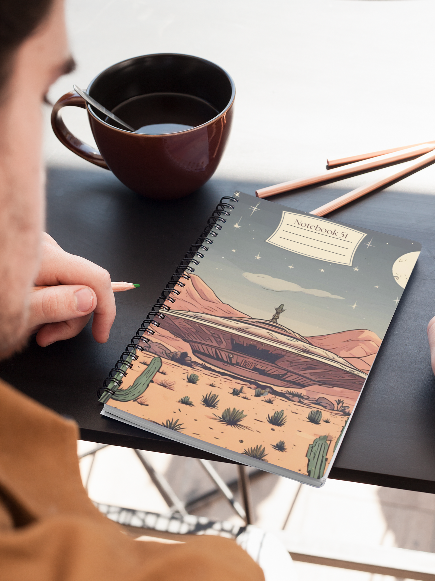 In a retro-futuristic world where mystery meets the stars. This vintage sci-fi inspired notebook captures a classic flying saucer suspended above a moonlit desert, casting a radiant beam over towering cacti and endless sand. The sky is alive with distant stars and a glowing moon, echoing the thrill of 1950s alien encounters and golden-age pulp adventures. Perfect for sketching wild theories, cosmic plots, or your next interstellar mission log. sessions.
