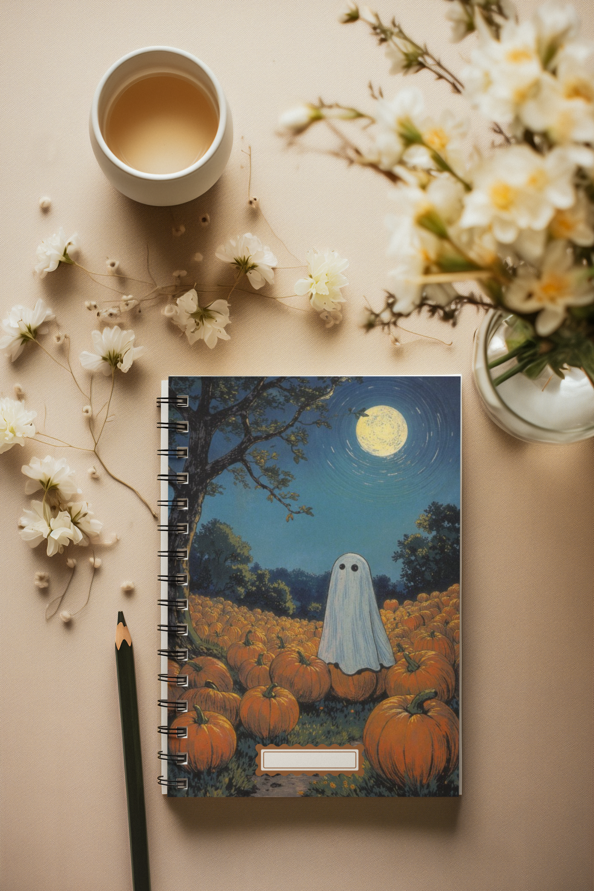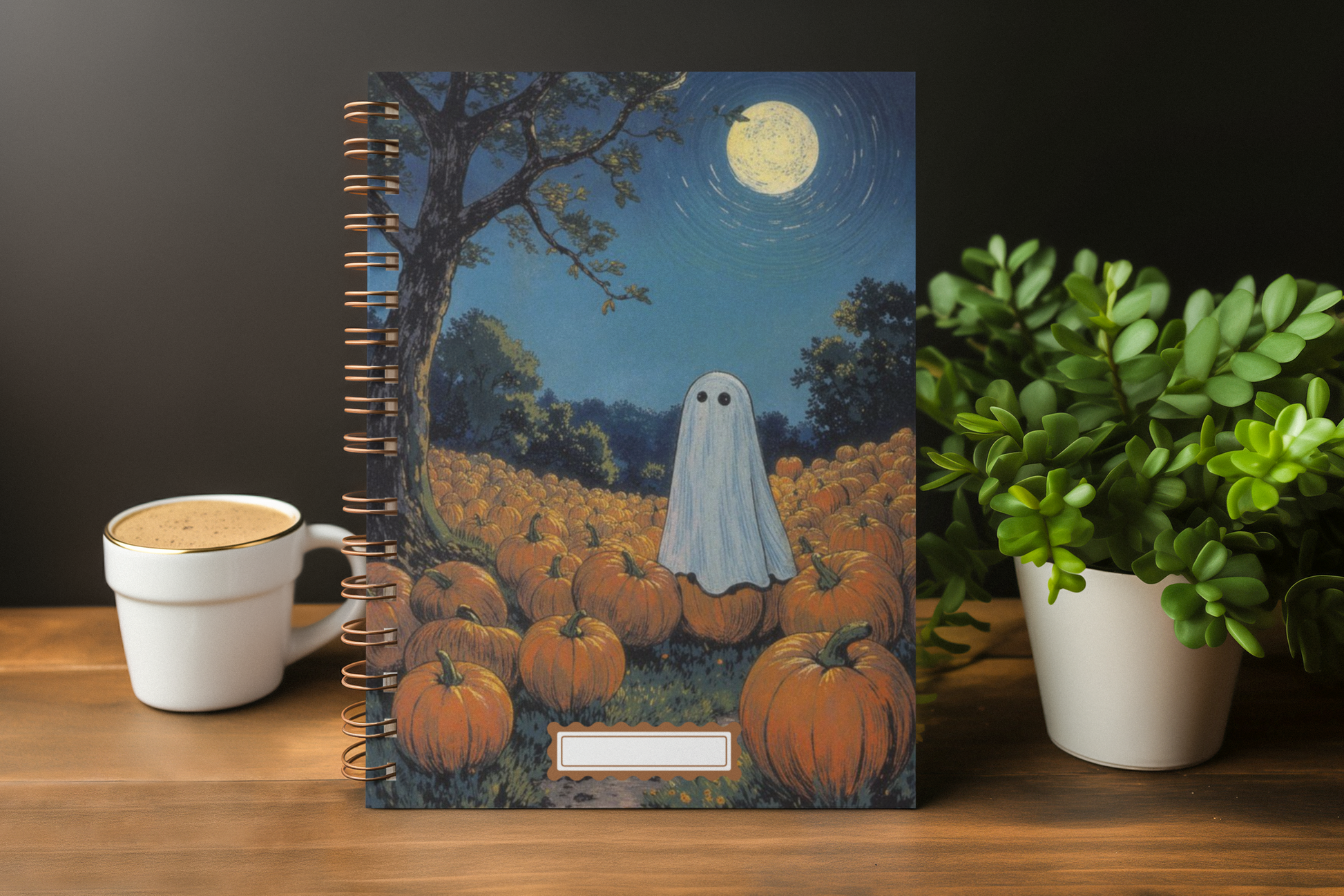 Wandering through a golden field dotted with plump pumpkins, this gentle little ghost drifts between the vines like a whisper of autumn magic. With soft edges and curious eyes, it’s more sweet than spooky bringing a playful charm to every page. Surrounded by crunchy leaves, harvest colors, and the glow of twilight, this notebook is the perfect place for cozy notes, haunting daydreams, and fall-touched thoughts that float just out of reach.