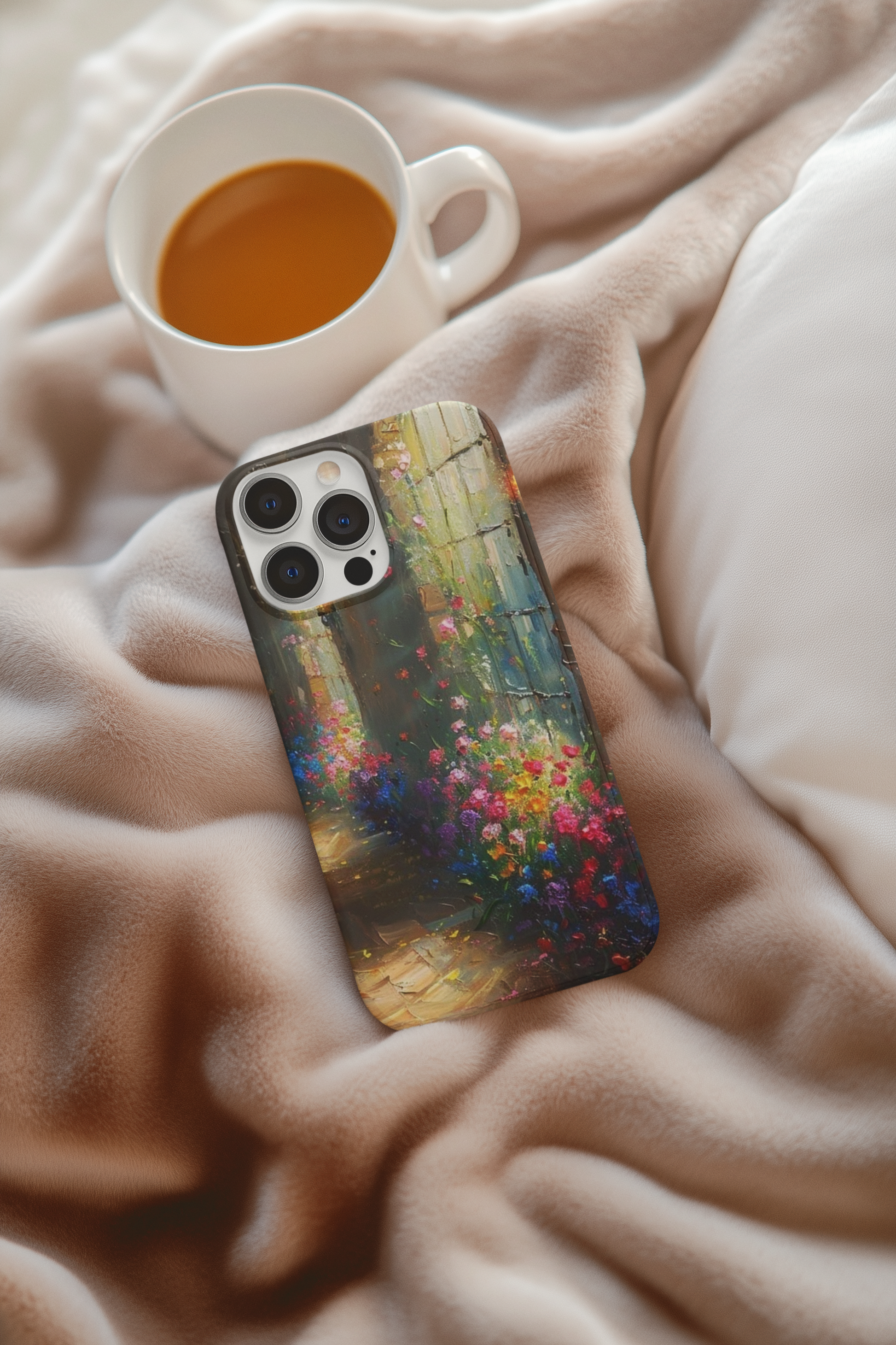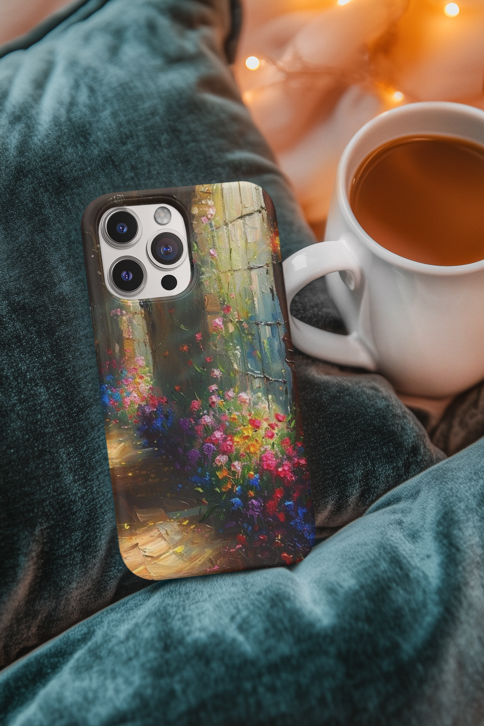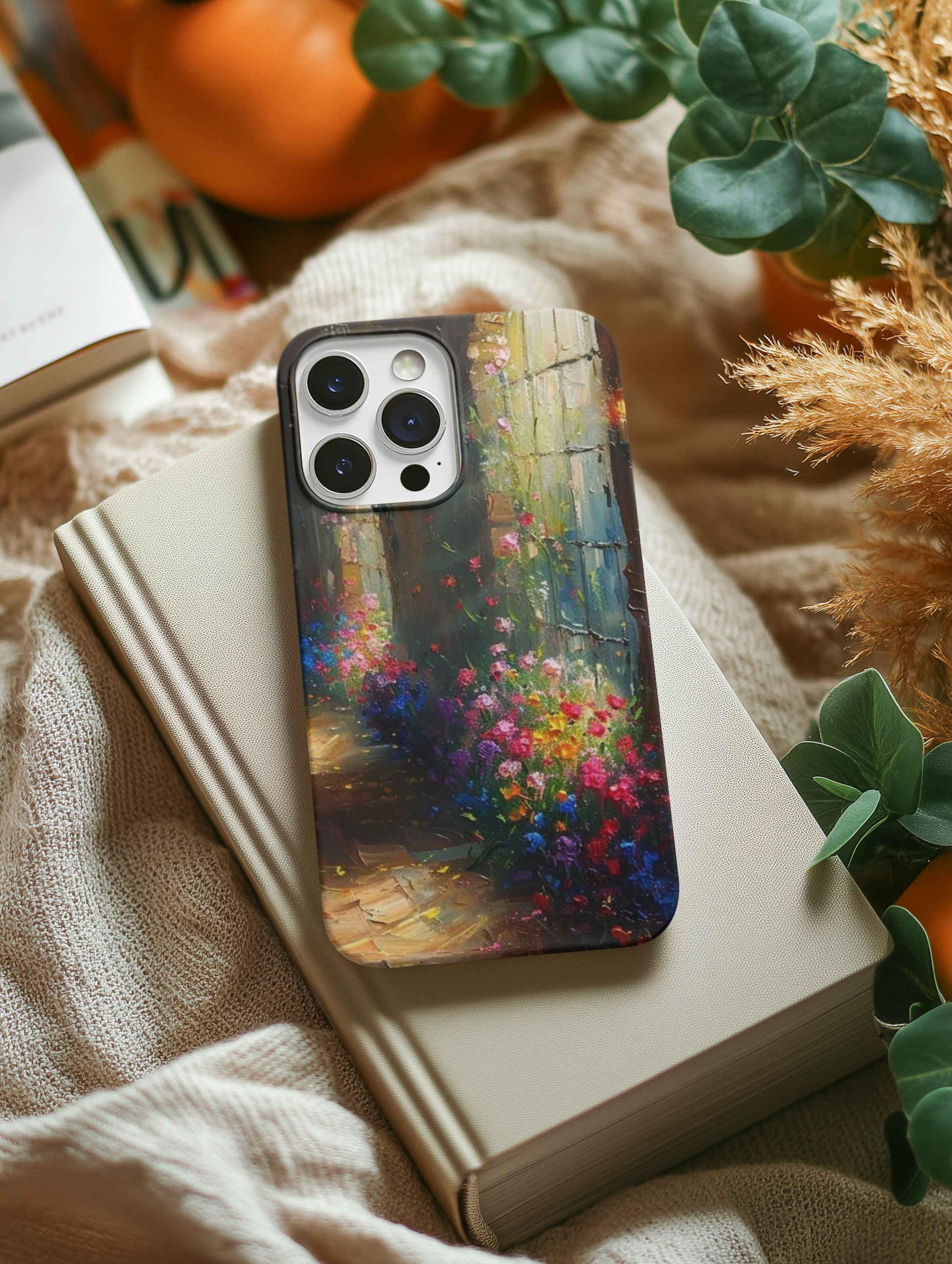 Like a painted dream come to life, this brush-stroked phone case captures a hallway bursting with vibrant flowers bathed in golden sunlight. Petals bloom along the walls in joyful color pinks, oranges, yellows while soft beams of light stream through tall windows, dancing across the floor in warm, glowing patterns.