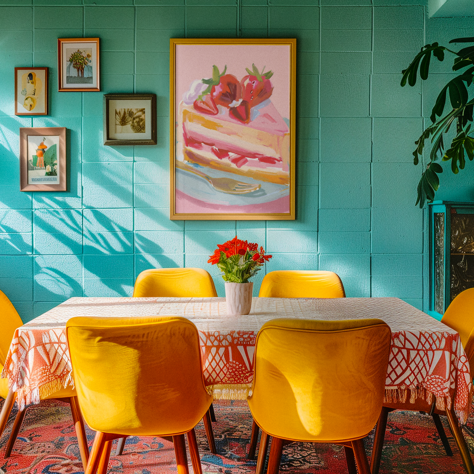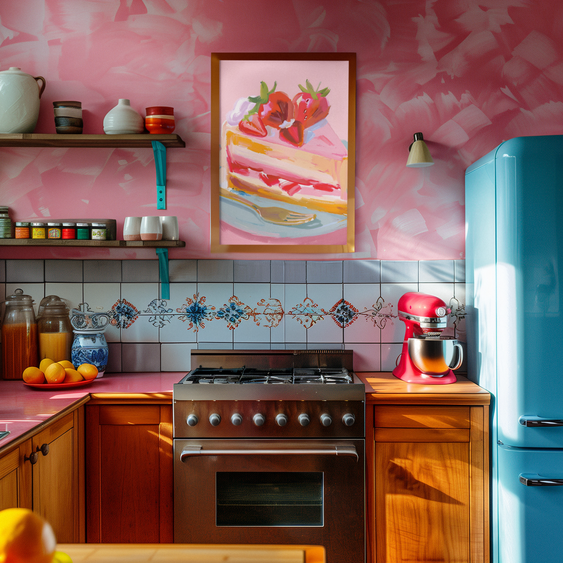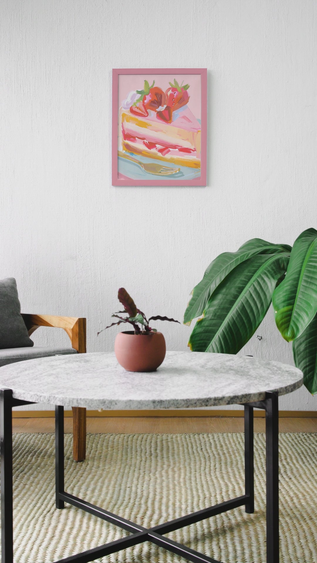 Set against a soft pastel background of blush pink, the painting radiates charm, playfulness, and a hint of magic. Tiny floating strawberries and twinkles of stardust bring the scene to life, making it a perfect piece for kitchens, cafés, or any space that craves a sprinkle of whimsy.