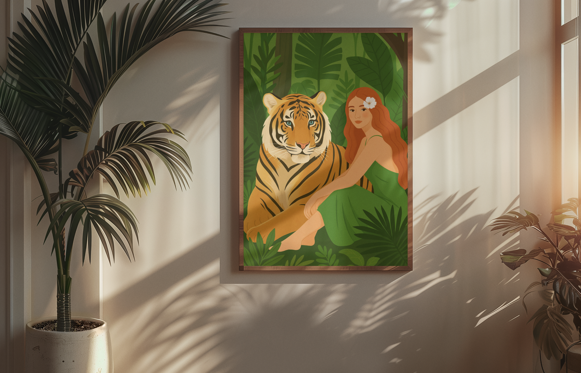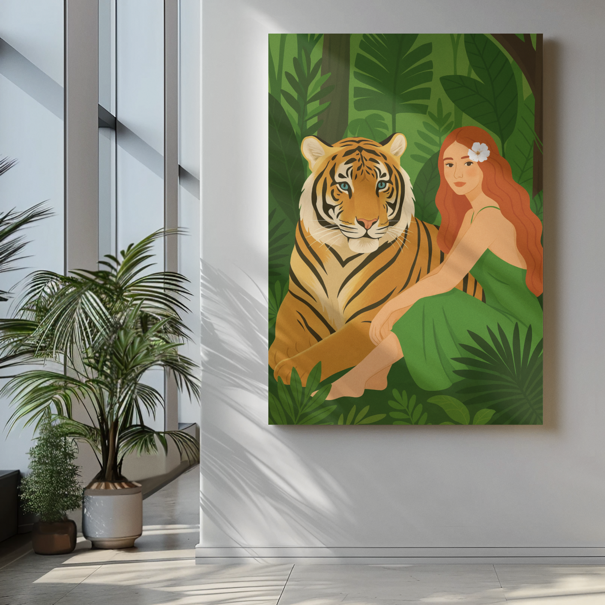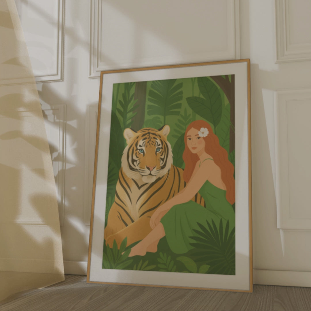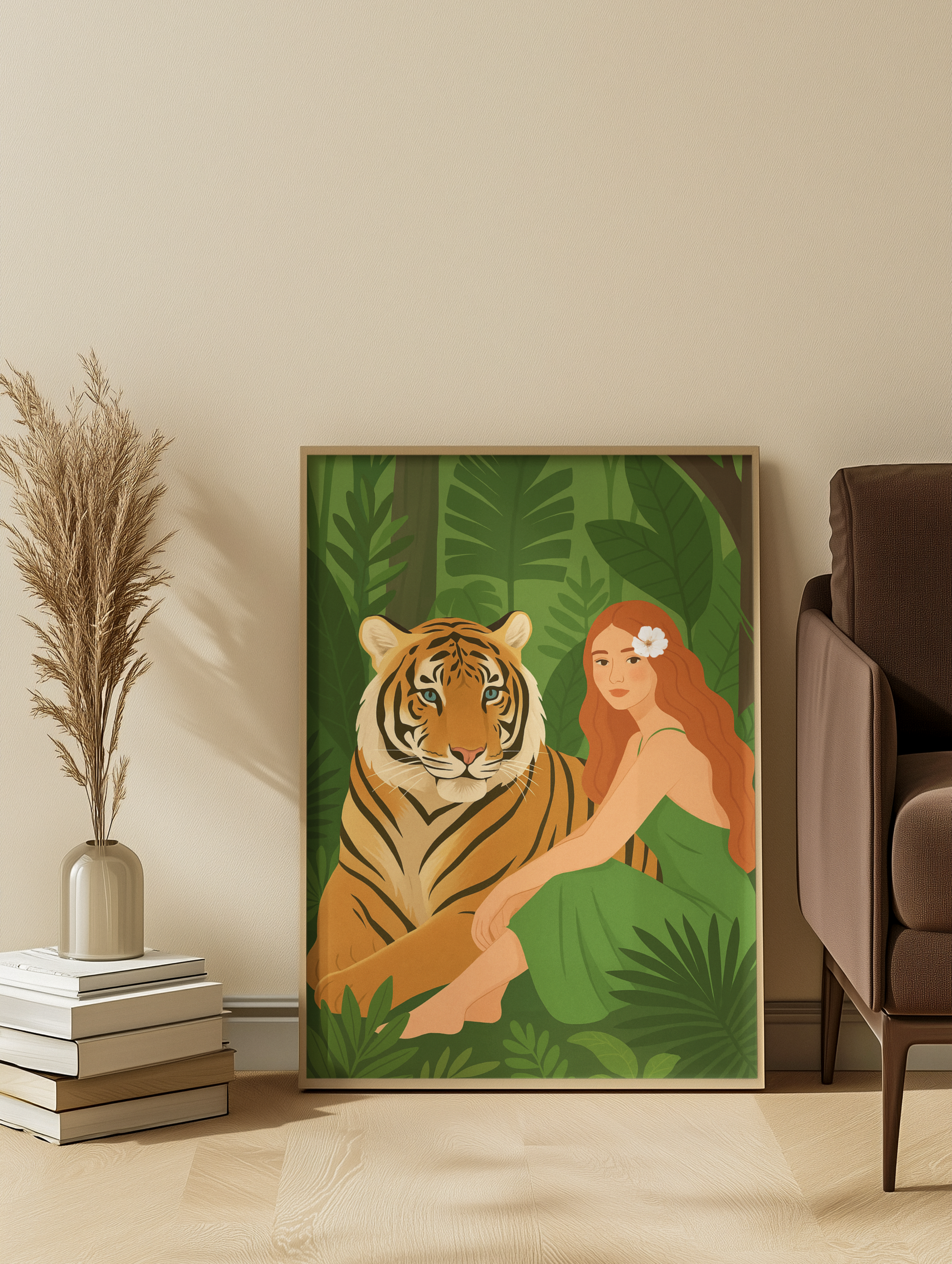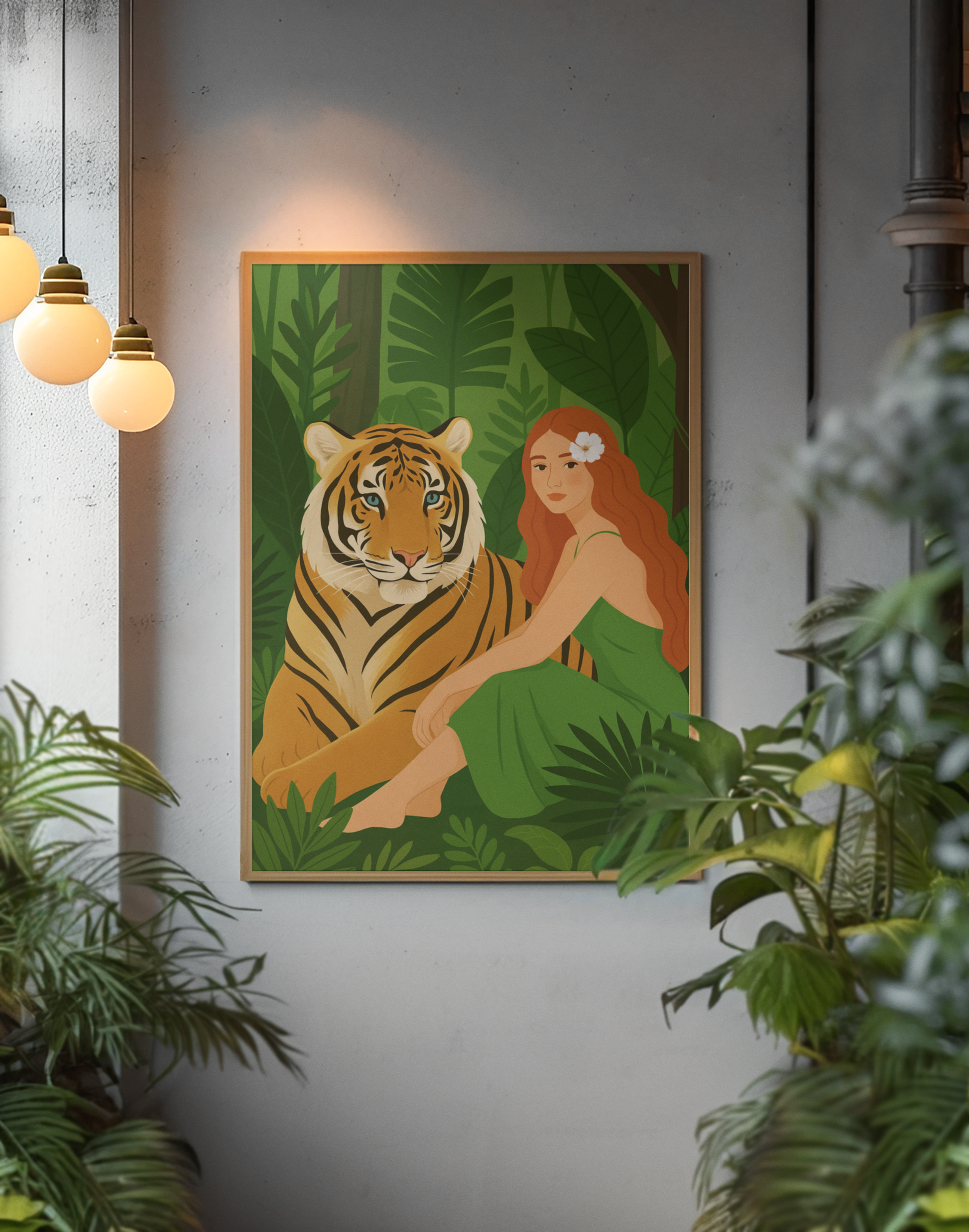 Amidst swirling green leaves and vibrant blooms, a sleek tiger lounges, eyes full of secrets, while a fiery red-haired girl calmly beside it, like a fearless friend taming the wild beast. Shadows play tricks and the soft glow of hidden light hints at untold adventures lurking just beyond the foliage. This poster brings a touch of jungle mystery and playful magic to your space where every glance invites you deeper into nature’s secret world and the powerful bond between girl and beast.