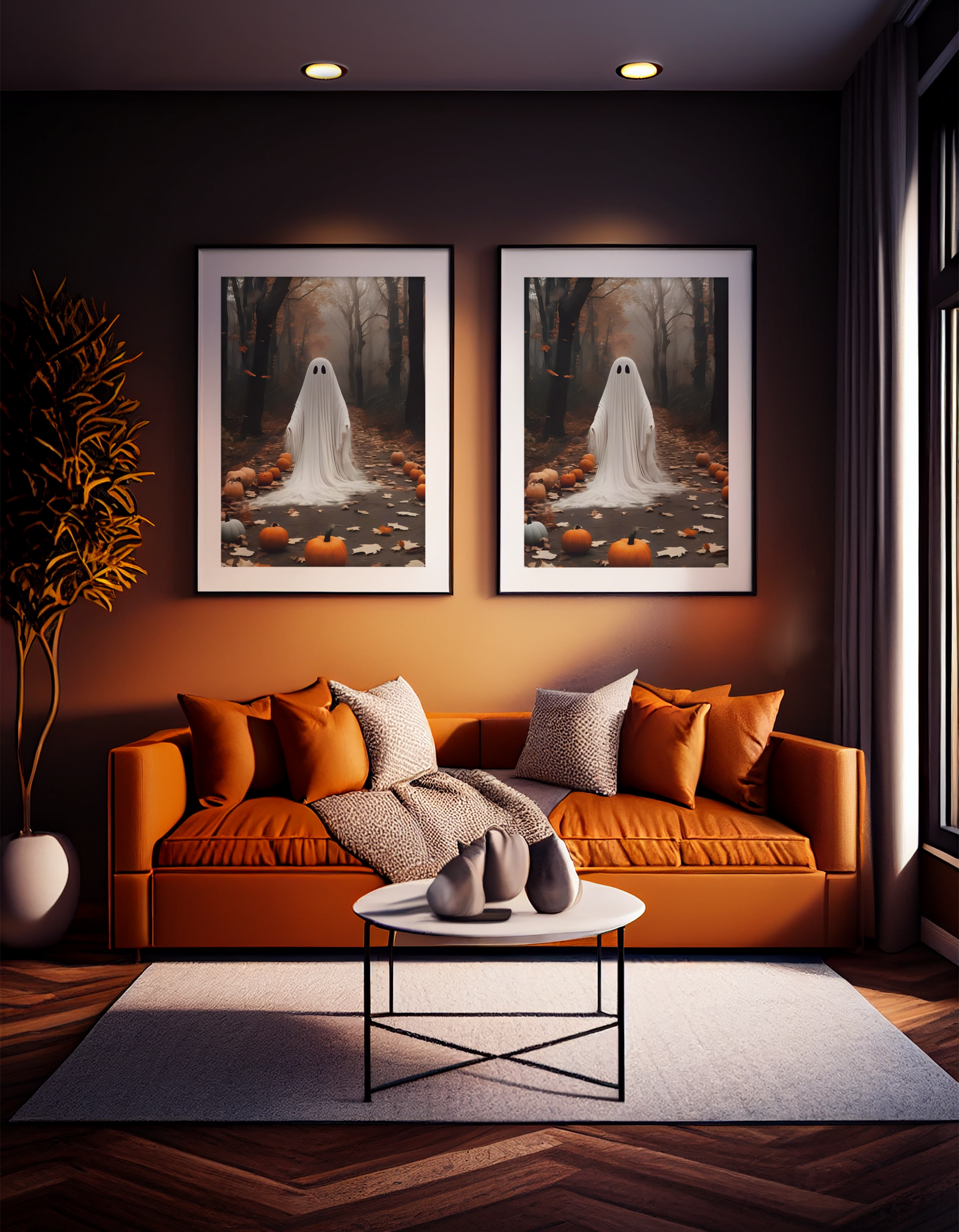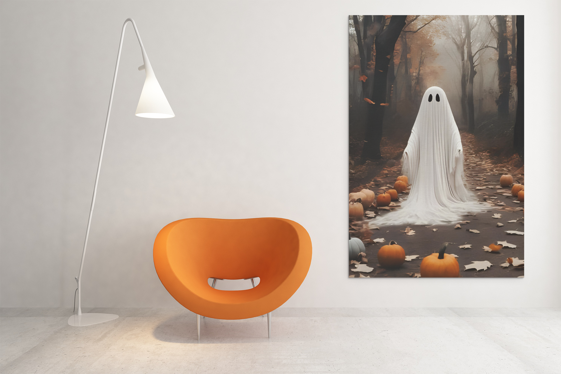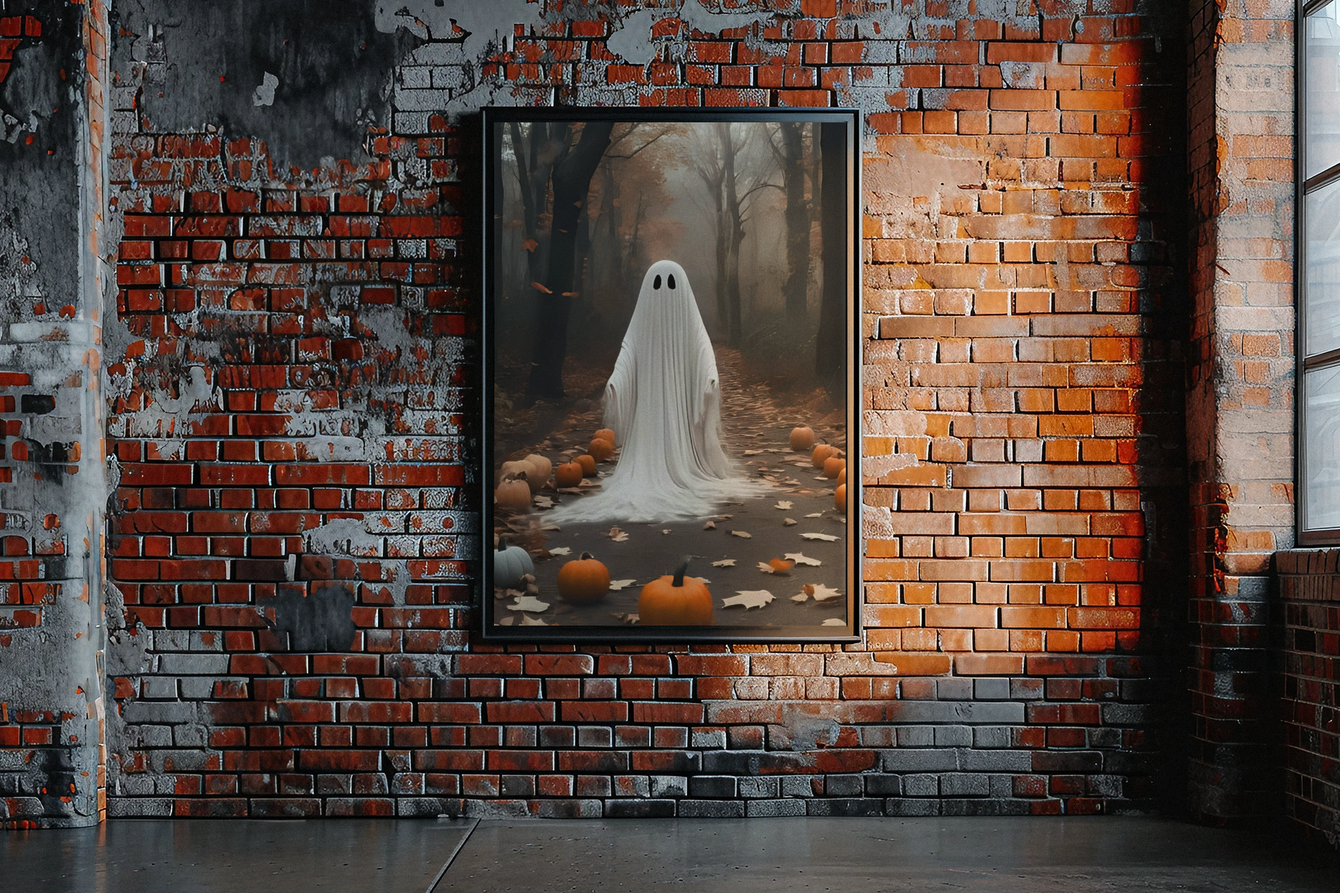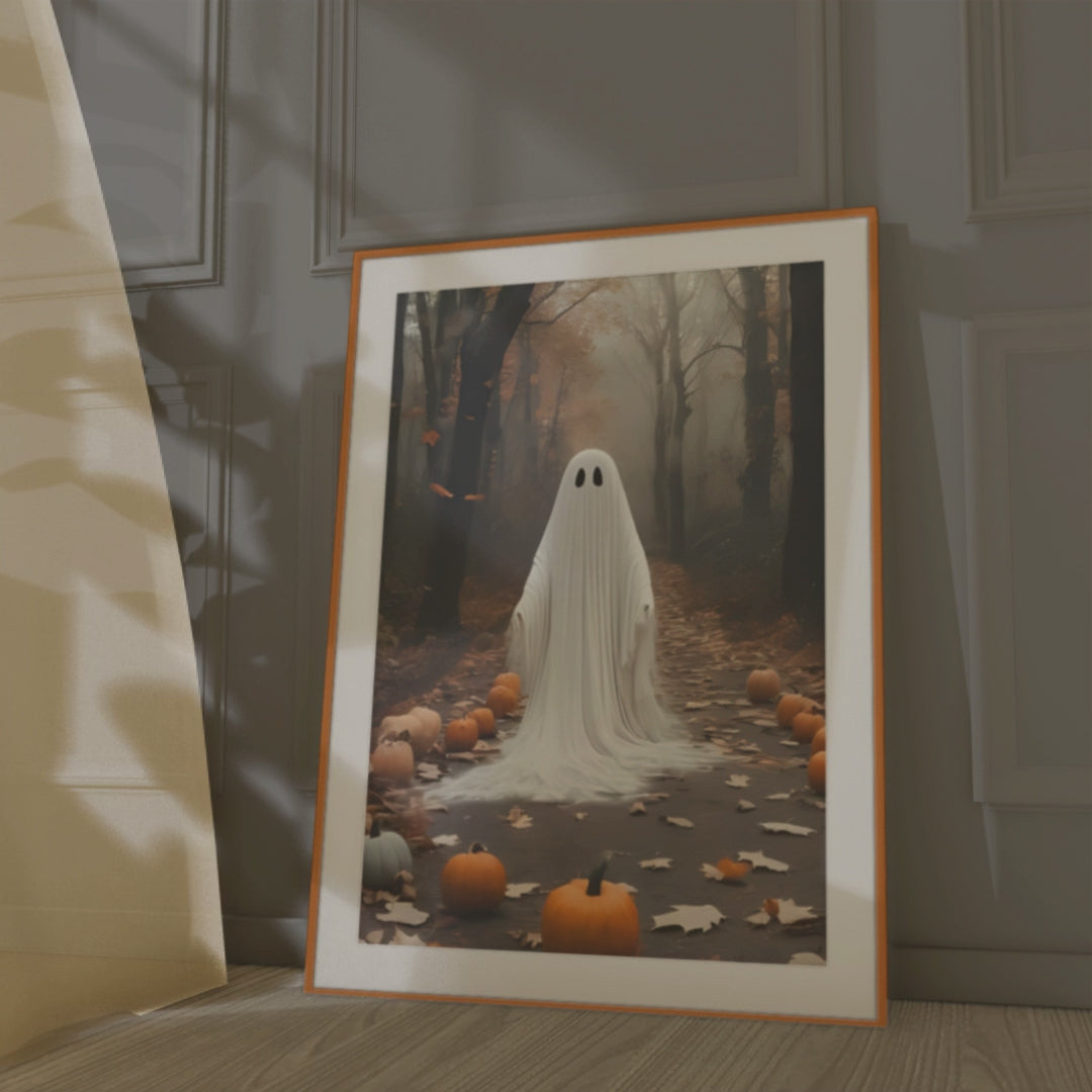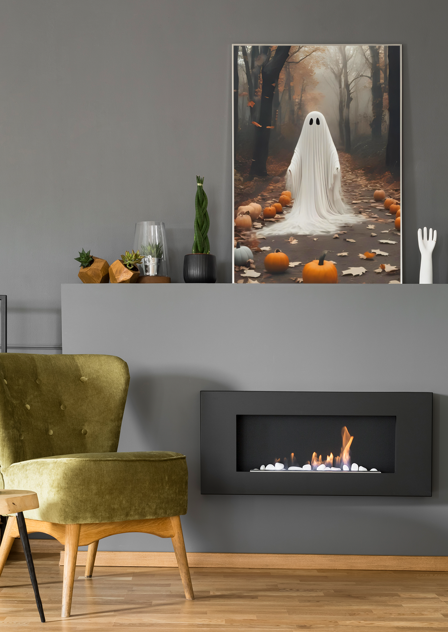 A quiet hush blankets the earth as a ghostly figure drifts down a forgotten path, its form soft and flowing like smoke in the wind. Burnt-orange leaves crunch beneath the weight of memory, and plump pumpkins rest like sentinels along the trail. The air is thick with the scent of moss and time, and every shadow seems to whisper secrets from another world. The Hollow Path is a haunting ode to autumn’s magic where the veil is thin, the woods are watching, and even the wind feels bewitched.