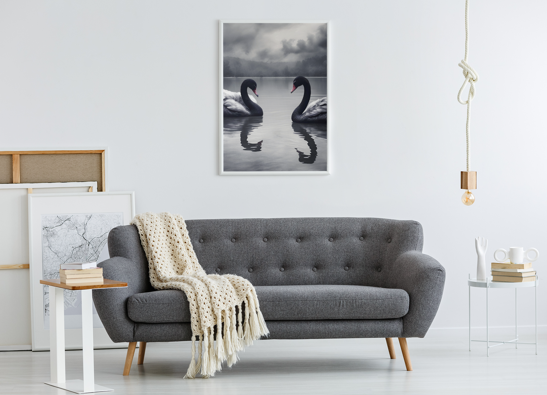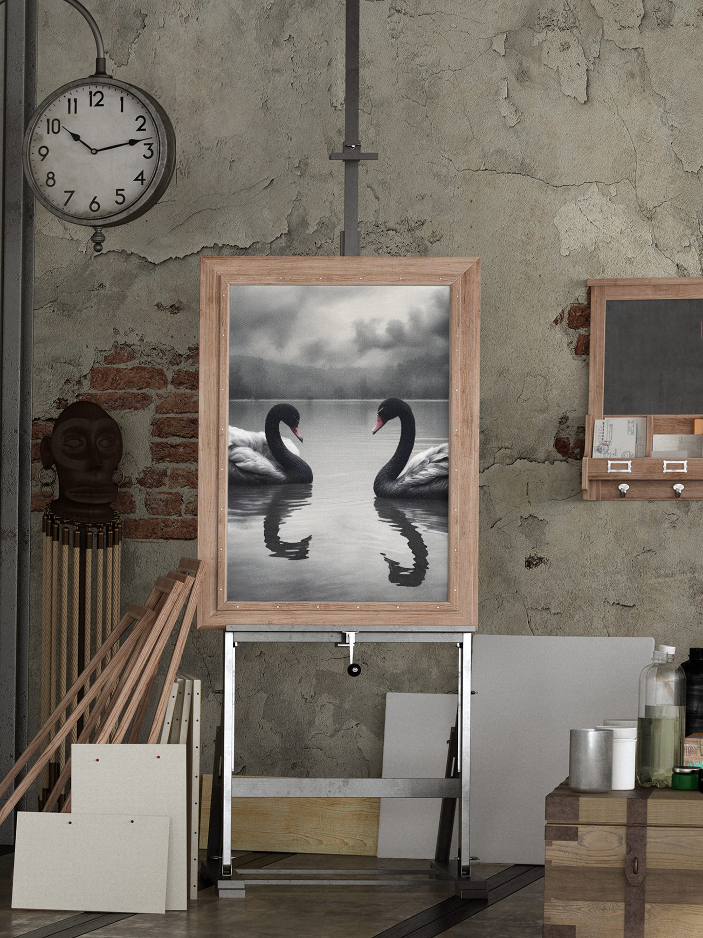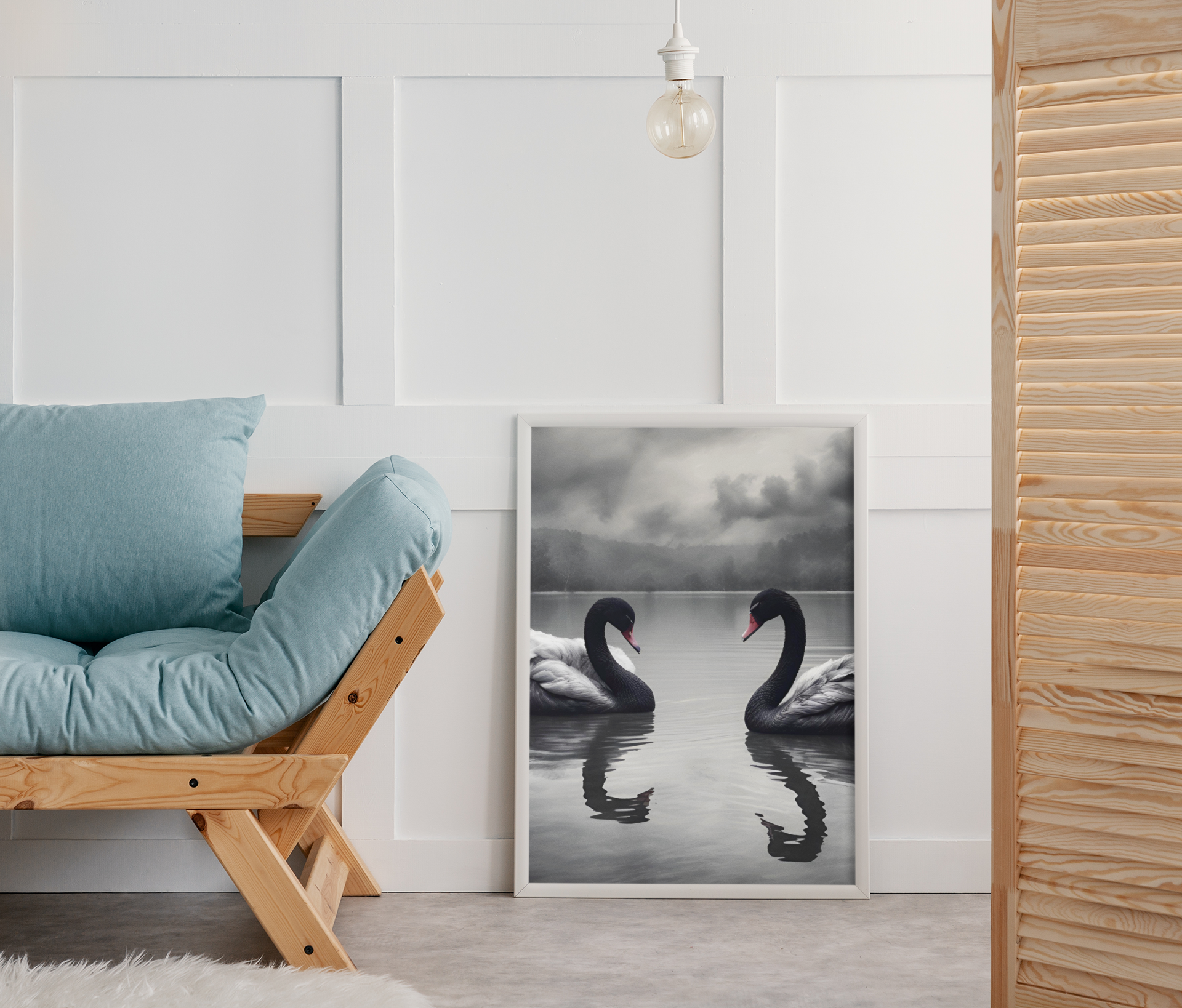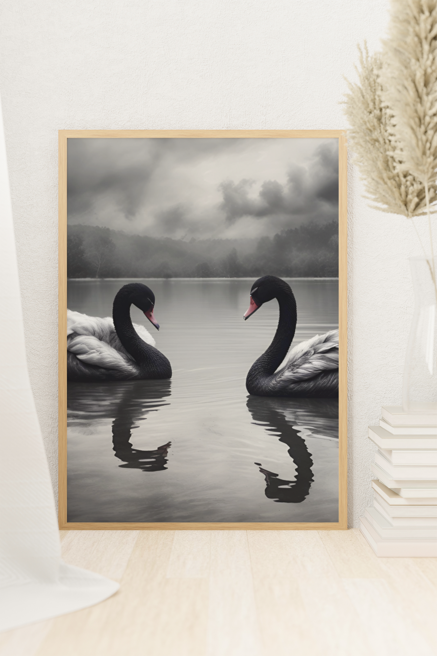 On a still obsidian lake, two swans black as shadows with wisps of white as moonlight glide in haunting harmony. Their mirrored forms ripple through the water like a silent waltz, graceful yet heavy with mystery. Above them, twisted grey clouds churn across the sky, veiling the world in a stormy hush. The air feels thick with forgotten whispers and the pull of ancient magic, as if the lake itself holds secrets it will never speak aloud. Together, the swans drift through the gloom symbols of balance, of love touched by darkness, and beauty born in the quiet before the storm.