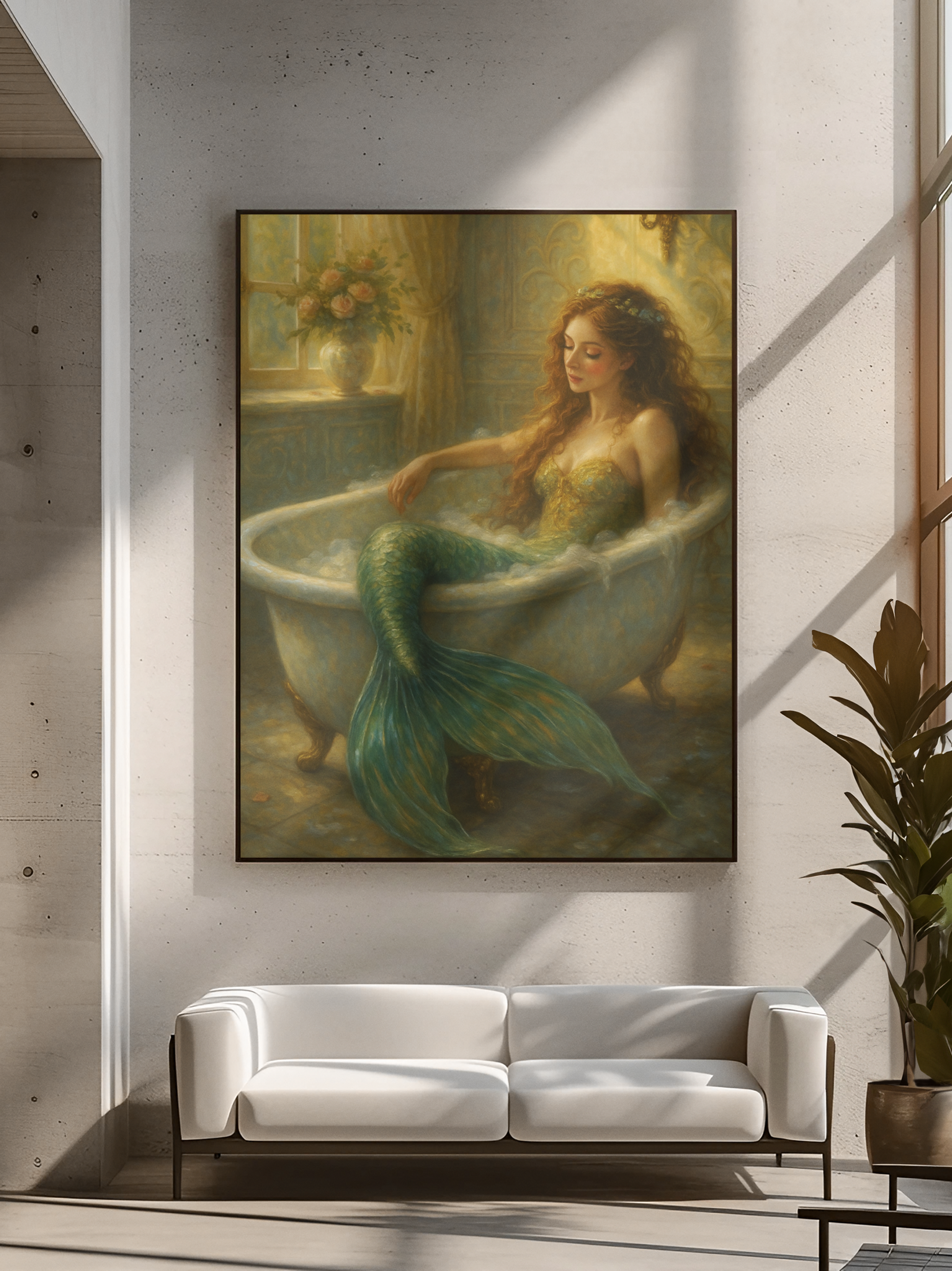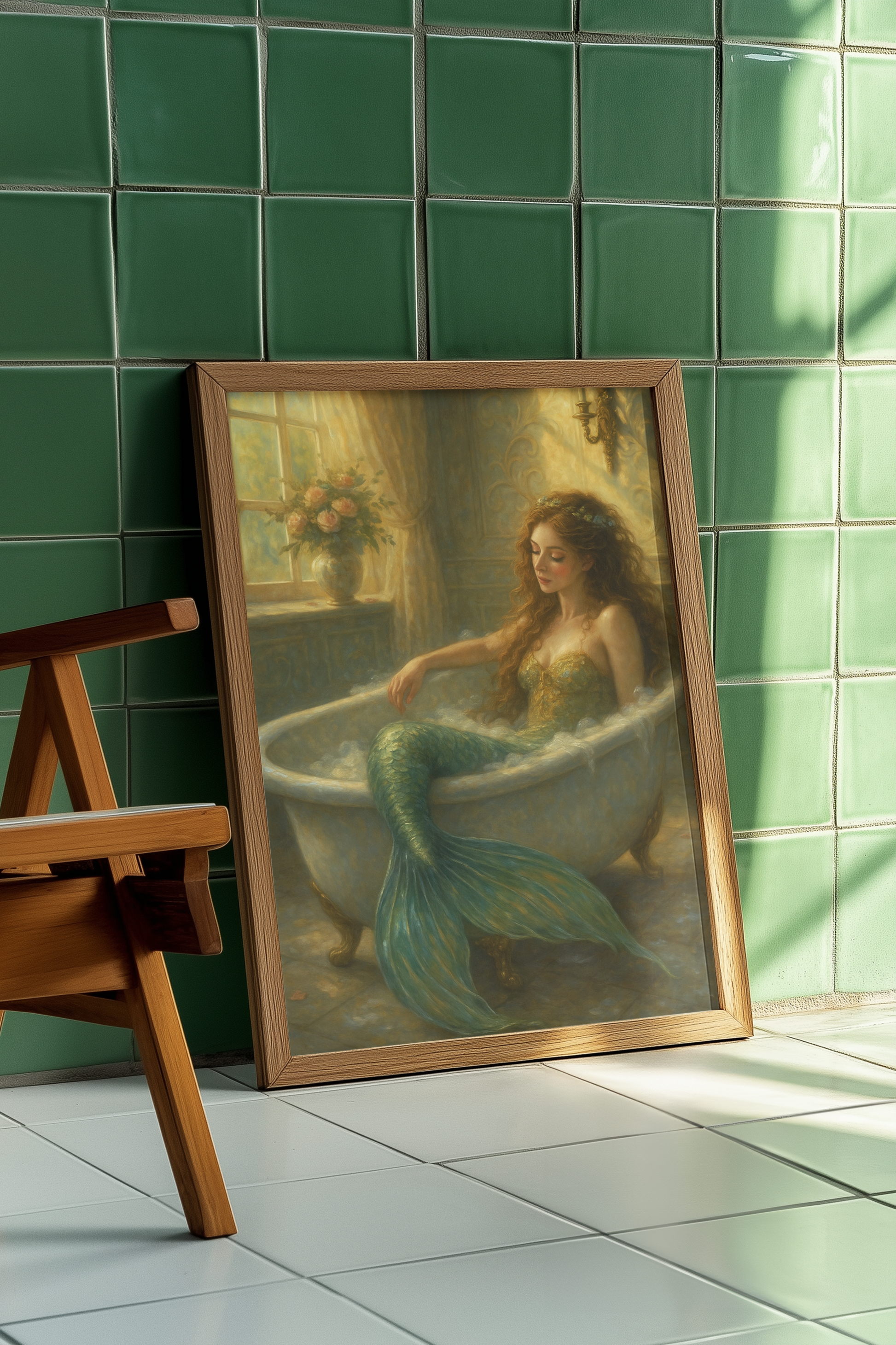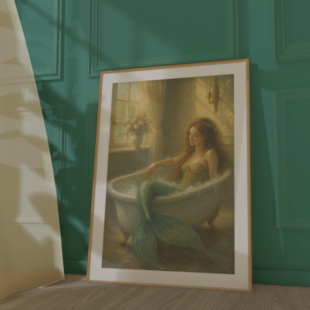 Bathed in golden morning light, the mermaid reclines gracefully in a vintage clawfoot bathtub, her shimmering emerald tail cascading over the porcelain edge like a waterfall of sea-jewels. Her auburn curls, adorned with tiny blossoms and ocean pearls, spill over her shoulders as she closes her eyes in peaceful reverie. The sunlight filters gently through gauzy curtains, illuminating the ornate chamber with a soft, enchanted glow. Surrounded by an antique vase of blooming roses, and a gilded wall sconce, the scene feels suspended in a fairytale, as though time itself pauses to witness this rare moment of ocean magic meeting earthly elegance.