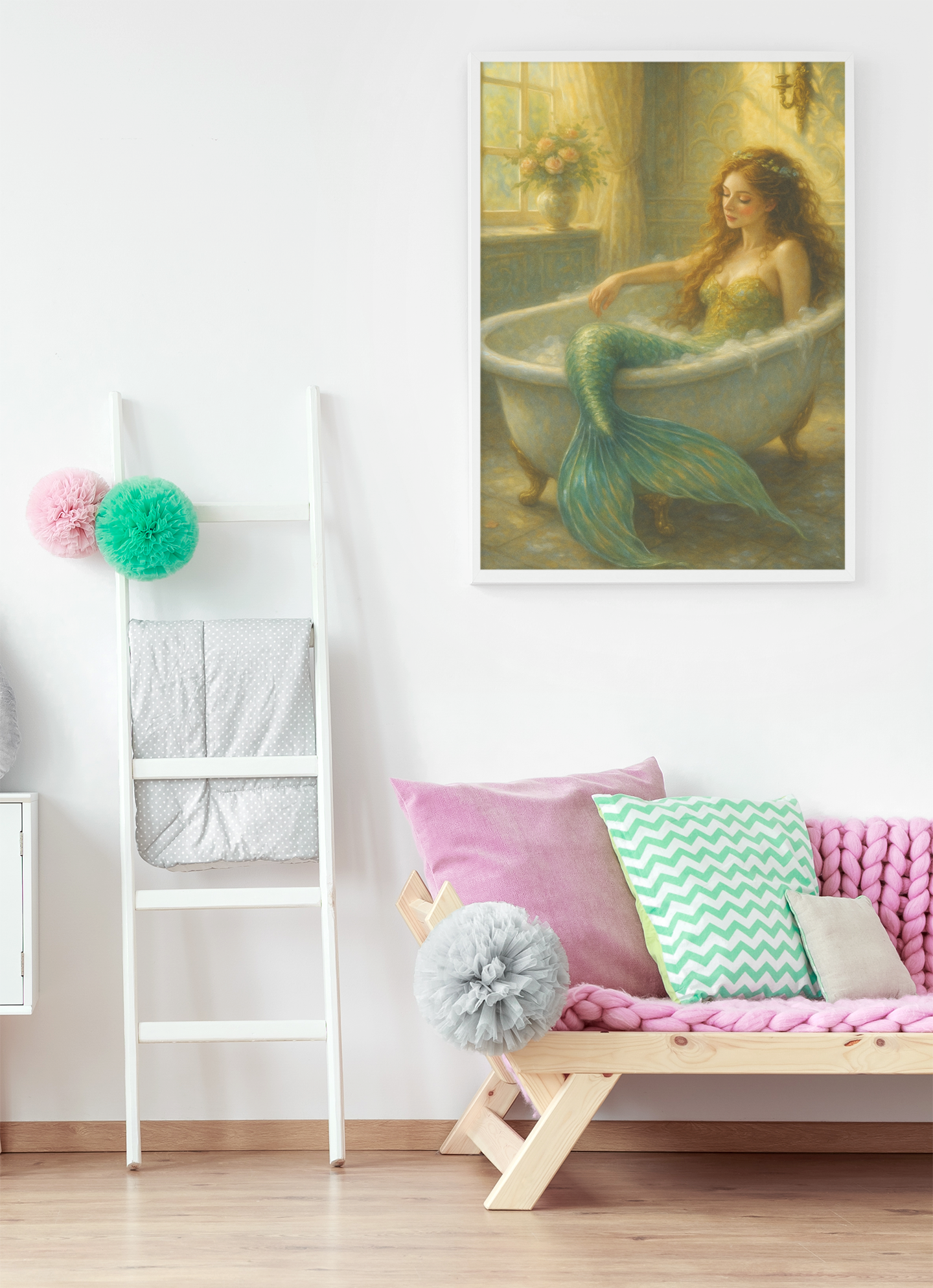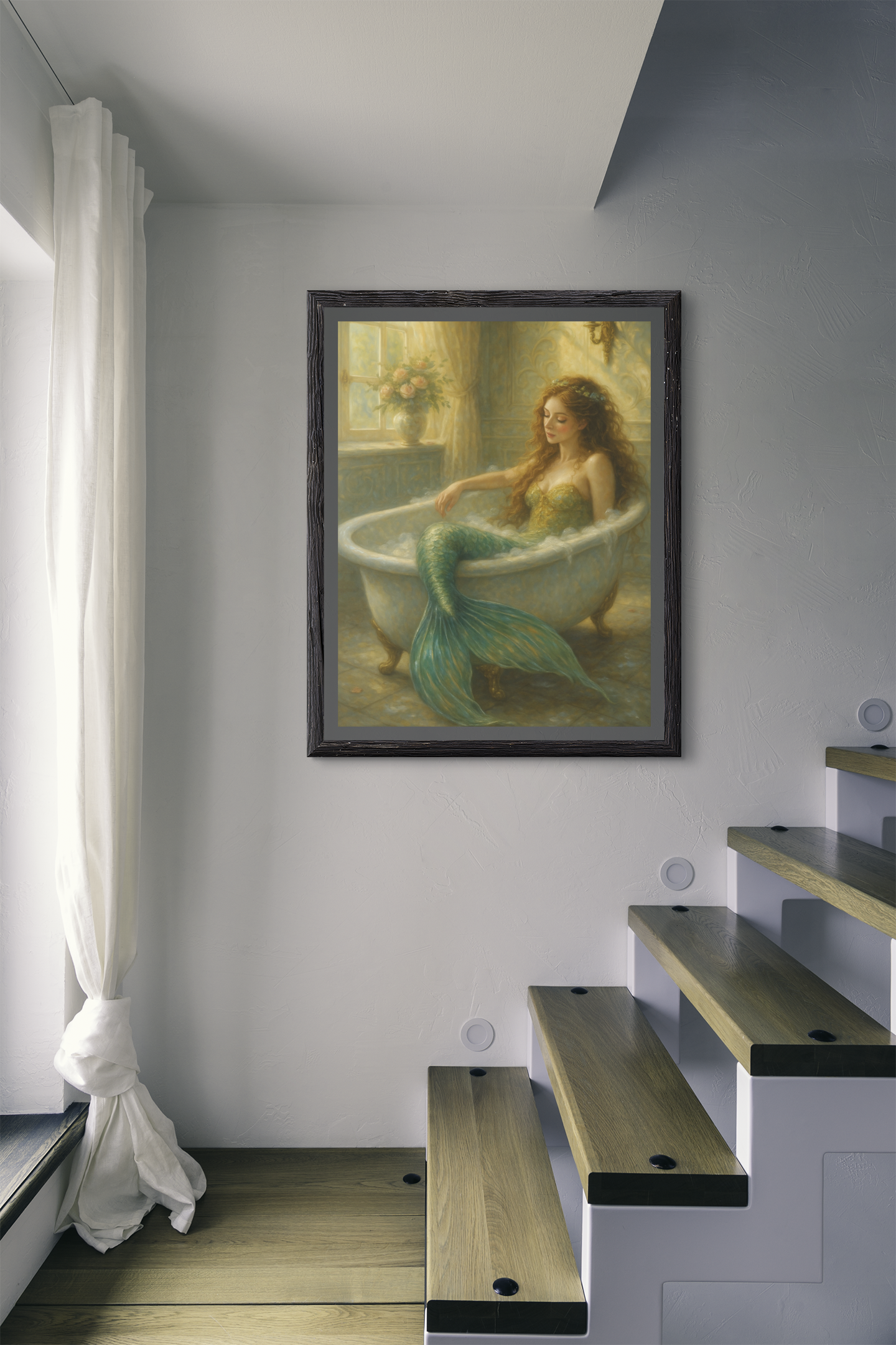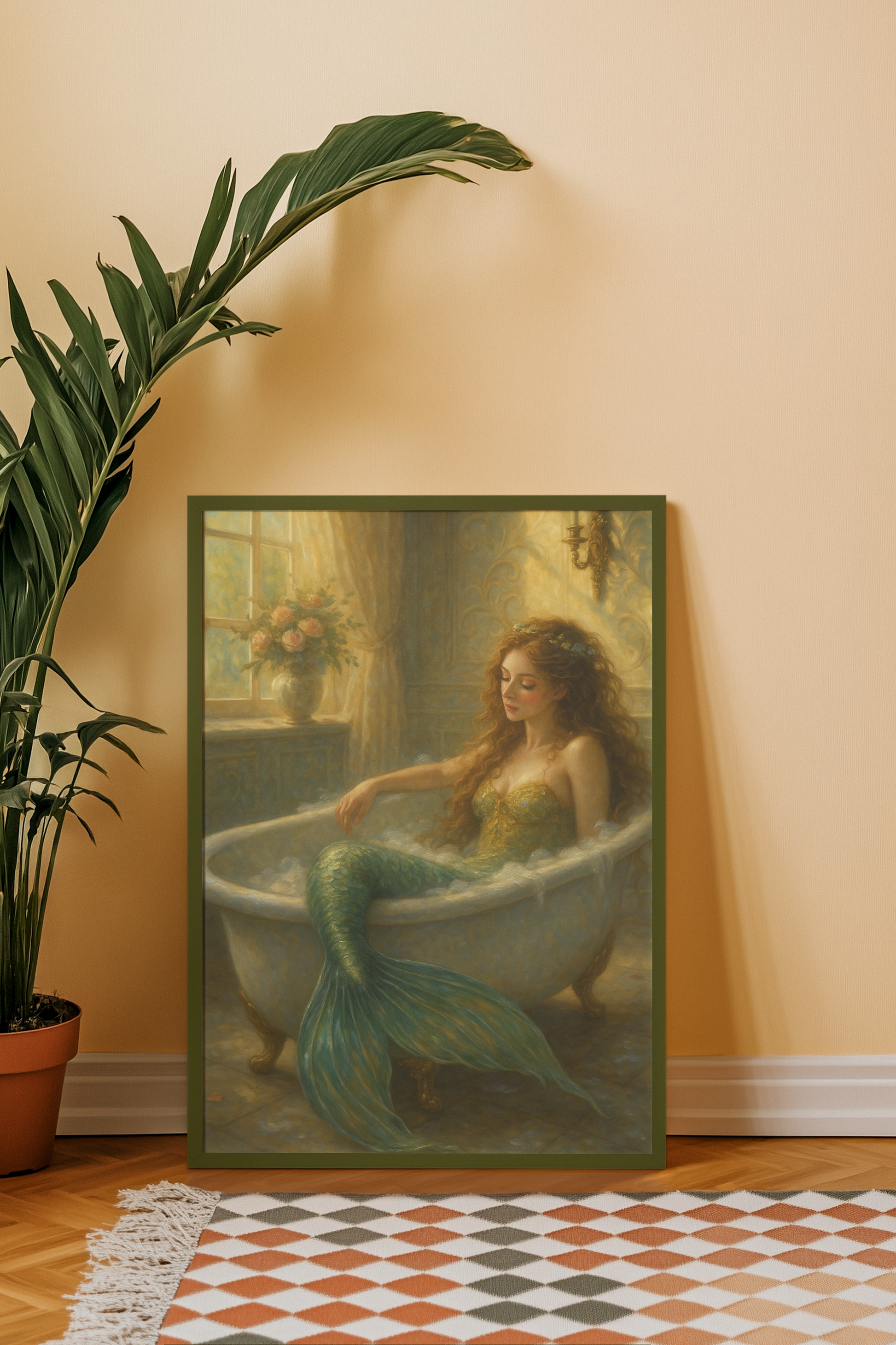 Bathed in golden morning light, the mermaid reclines gracefully in a vintage clawfoot bathtub, her shimmering emerald tail cascading over the porcelain edge like a waterfall of sea-jewels. Her auburn curls, adorned with tiny blossoms and ocean pearls, spill over her shoulders as she closes her eyes in peaceful reverie. The sunlight filters gently through gauzy curtains, illuminating the ornate chamber with a soft, enchanted glow. Surrounded by an antique vase of blooming roses, and a gilded wall sconce, the scene feels suspended in a fairytale, as though time itself pauses to witness this rare moment of ocean magic meeting earthly elegance.