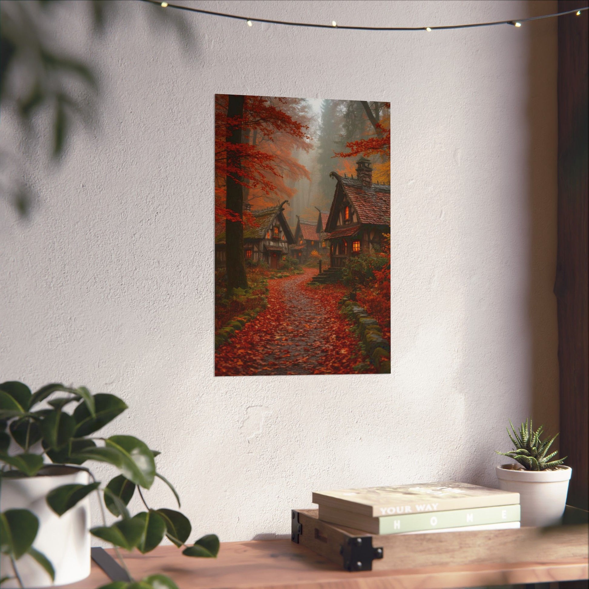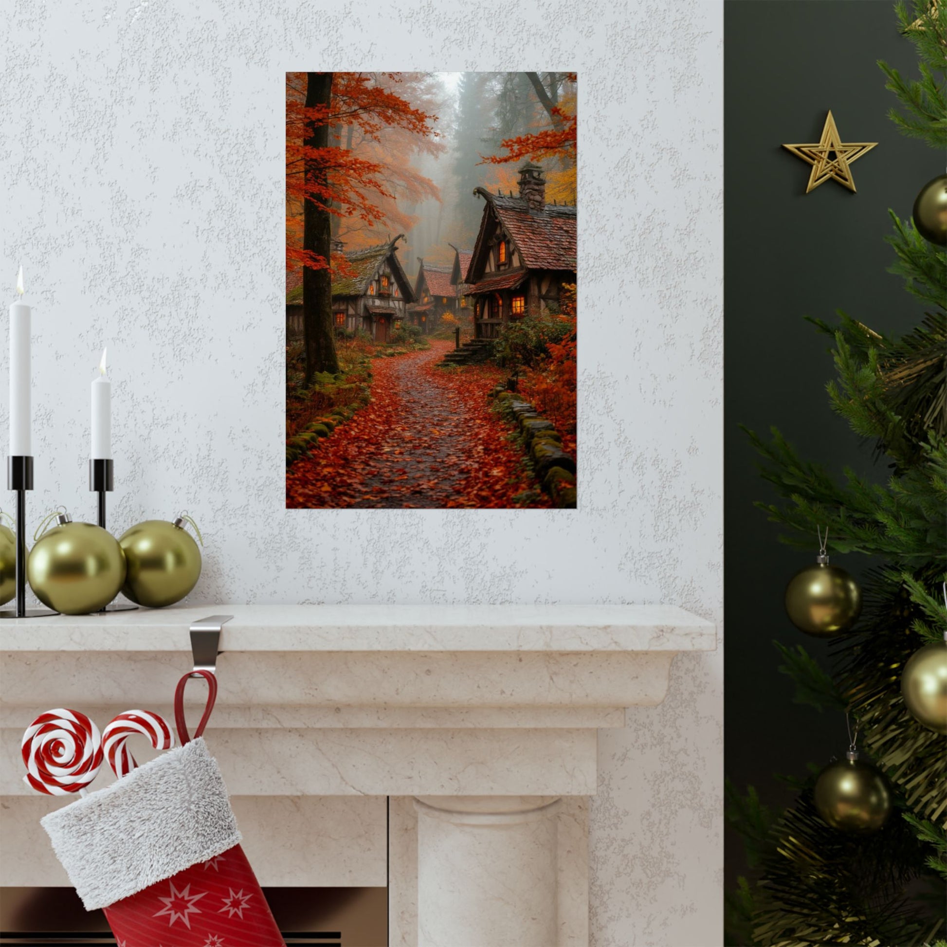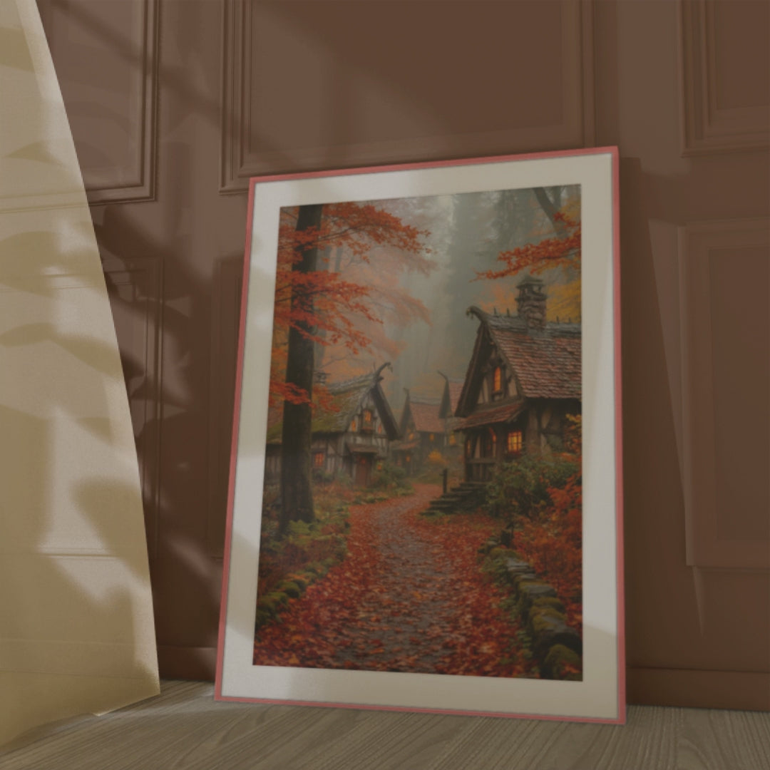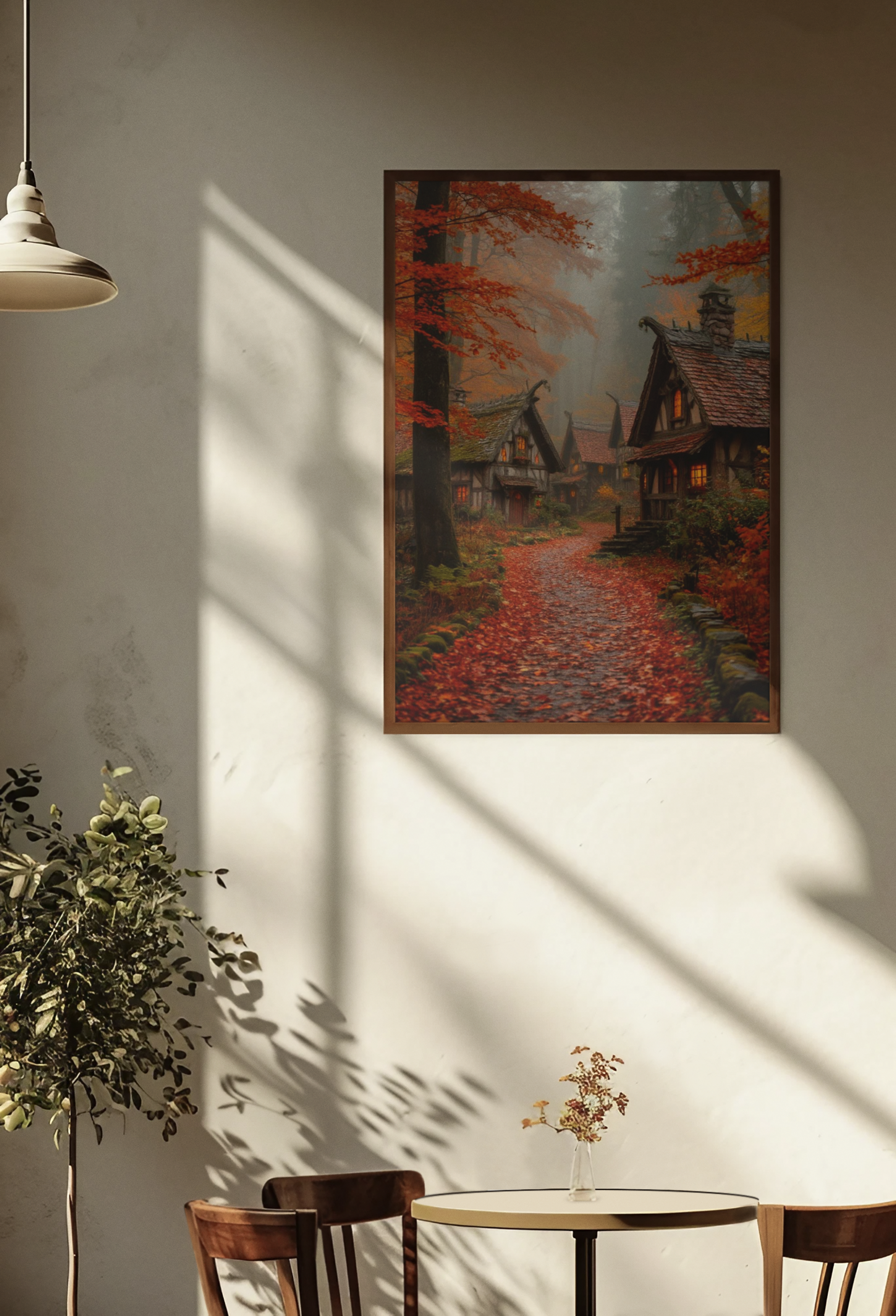 Nestled in a quiet valley where the trees wear coats of amber, crimson, and gold, this charming autumn village comes to life in a swirl of falling leaves and chimney smoke. Cobblestone paths wind between cozy cottages, each one wrapped in ivy and touched by the glow of the season. The air is crisp, the skies soft with golden light, and every rooftop is framed by trees in full autumn splendor. A picture-perfect haven where harvest joy, warm pies, and timeless traditions fill every window and heart.