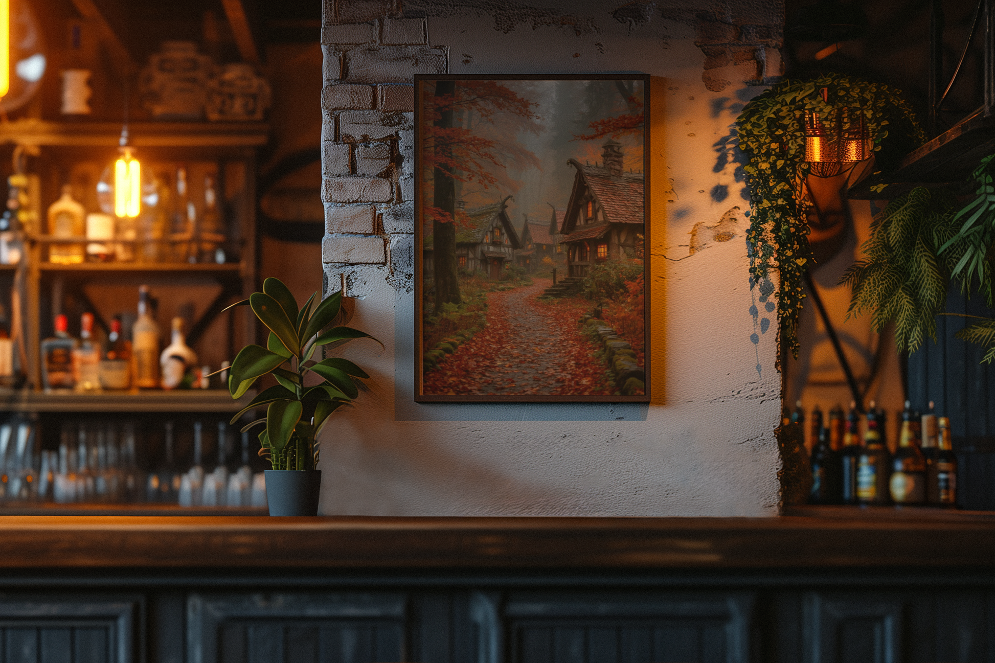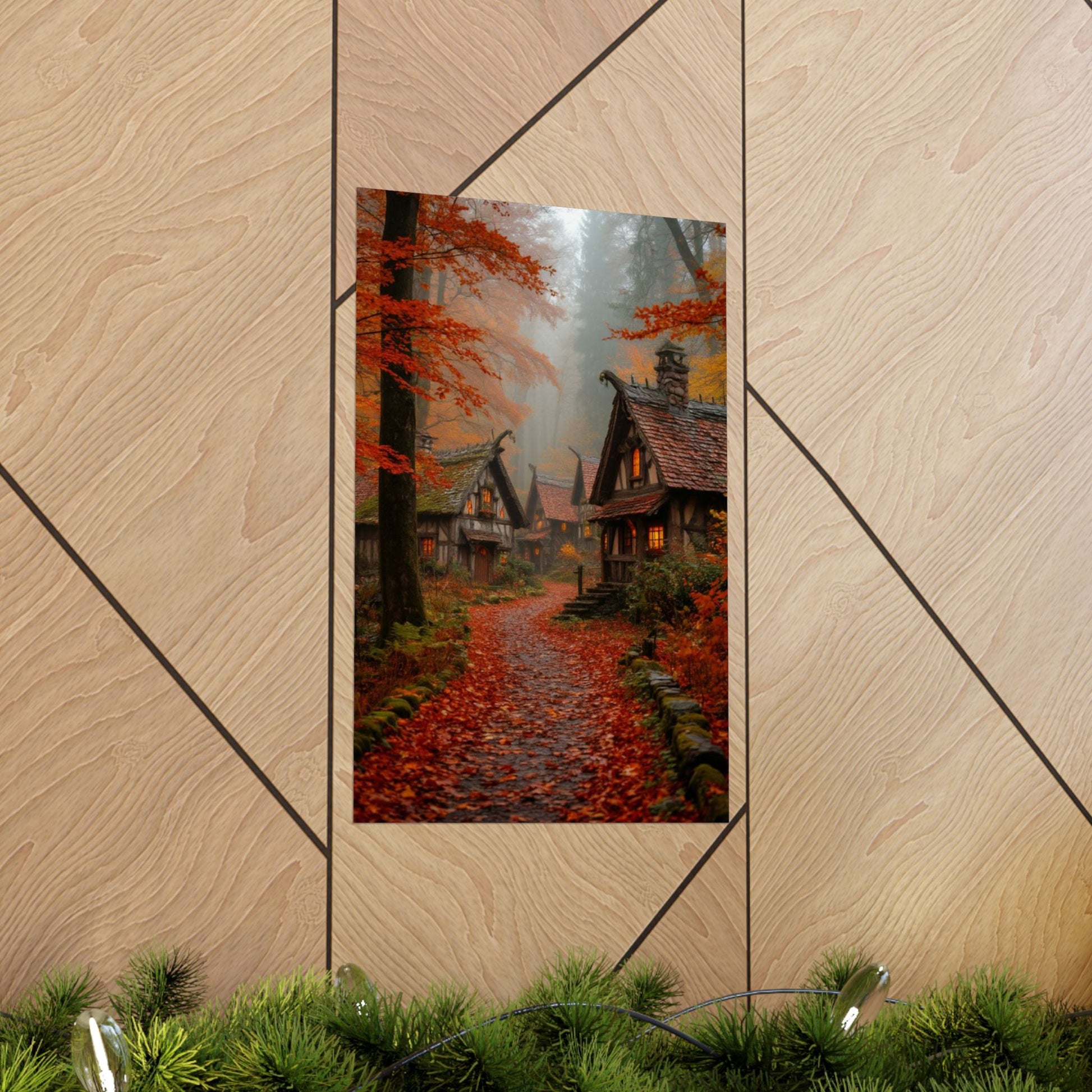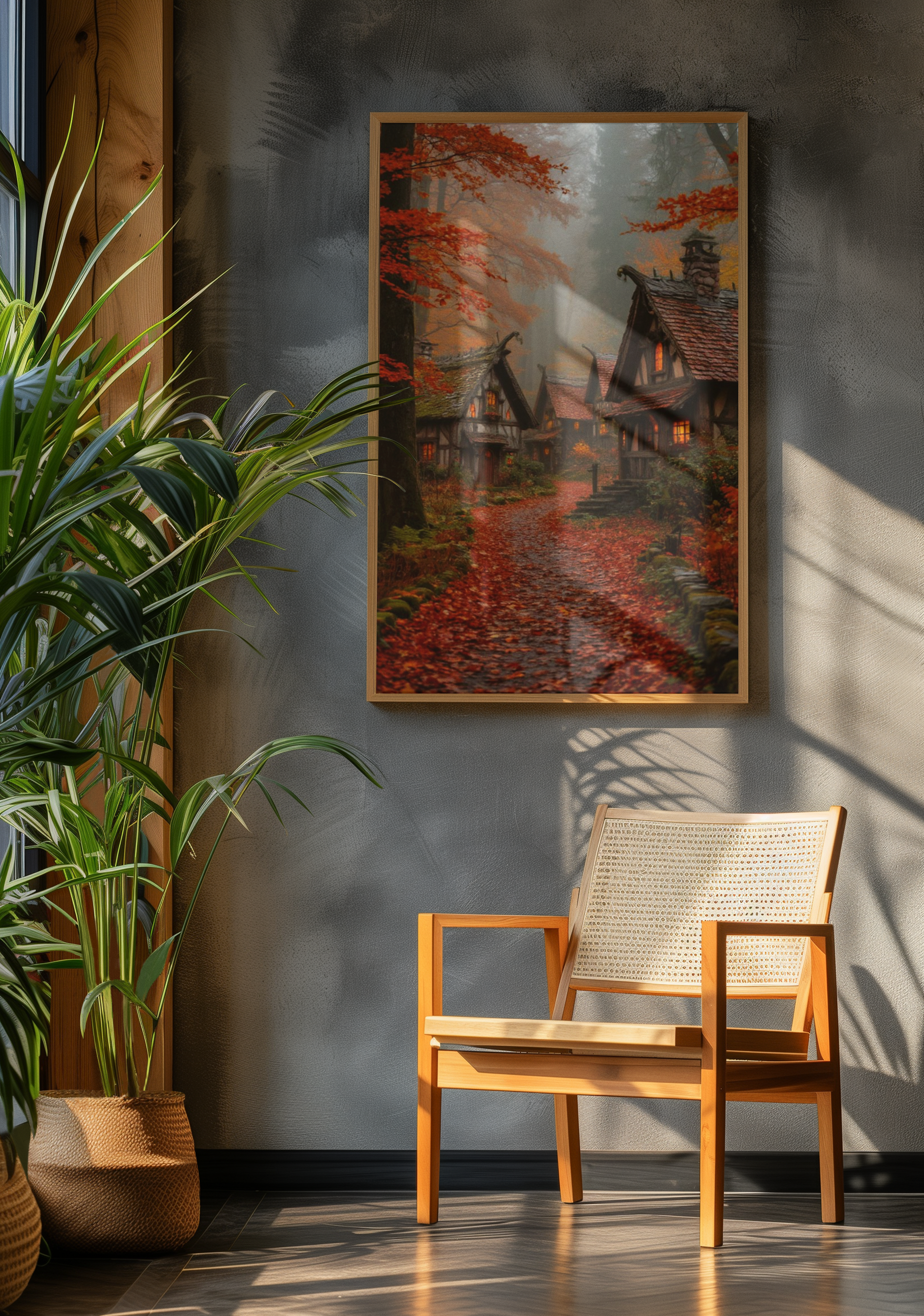 Nestled in a quiet valley where the trees wear coats of amber, crimson, and gold, this charming autumn village comes to life in a swirl of falling leaves and chimney smoke. Cobblestone paths wind between cozy cottages, each one wrapped in ivy and touched by the glow of the season. The air is crisp, the skies soft with golden light, and every rooftop is framed by trees in full autumn splendor. A picture-perfect haven where harvest joy, warm pies, and timeless traditions fill every window and heart.