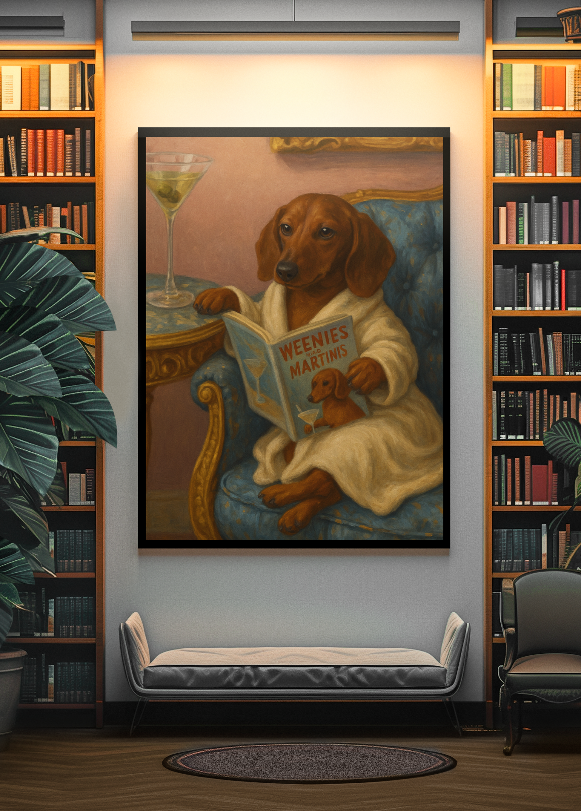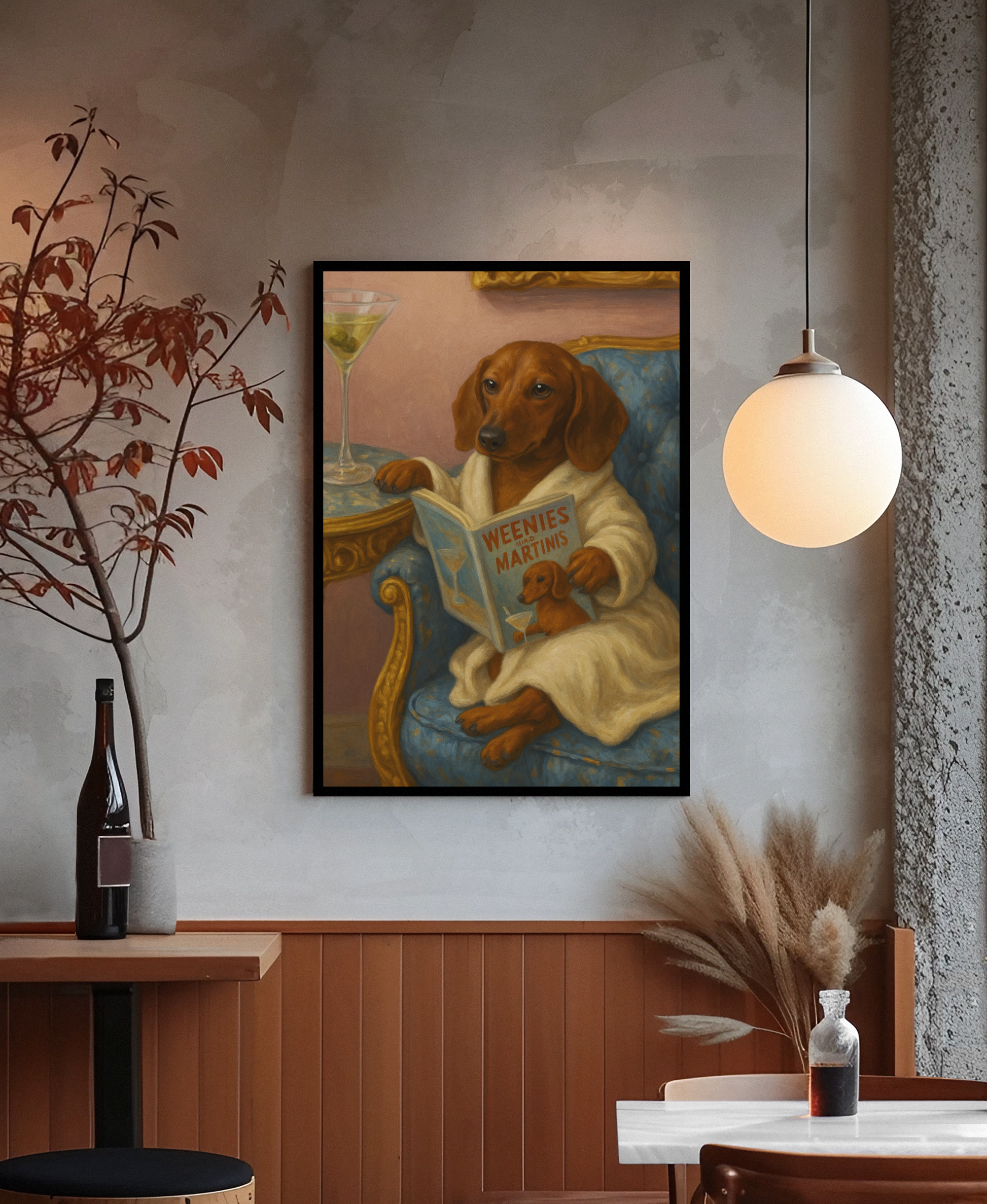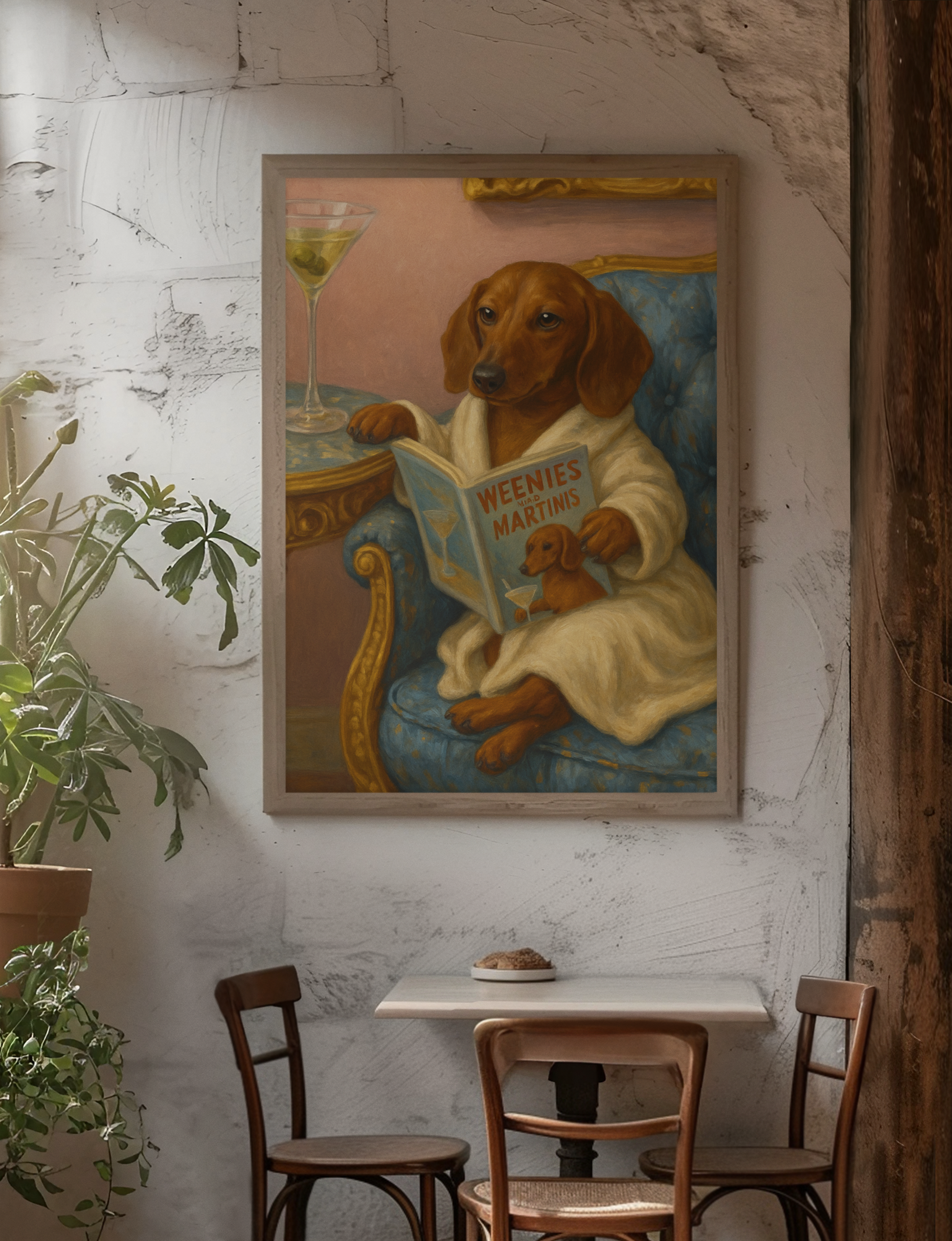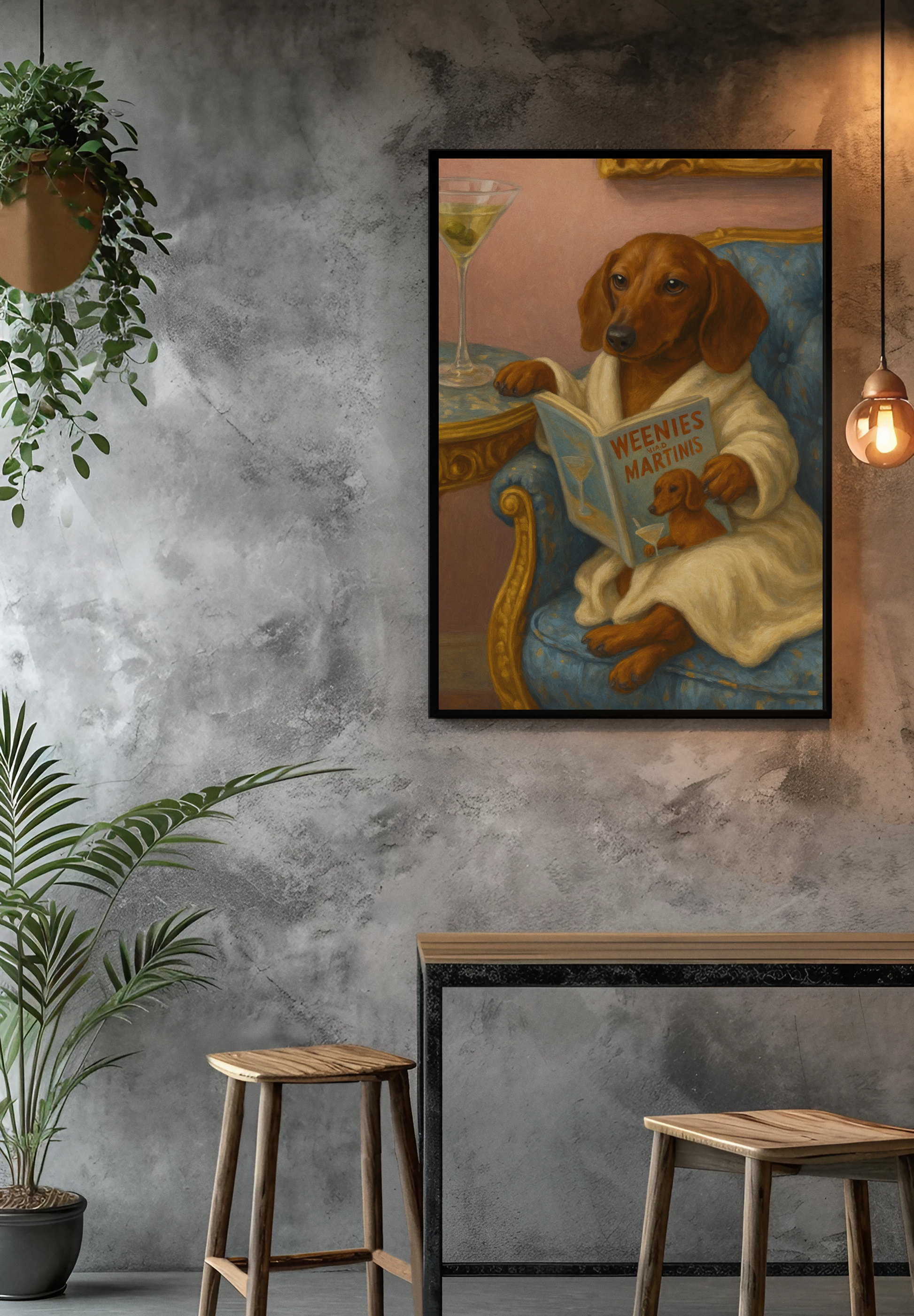 Shake up your space with a splash of sass and a whole lot of charm! This hilarious satin poster features a dashing dachshund lounging in a cozy bathrobe, casually flipping through a magazine titled Weenies & Martinis. With its retro glam vibes and playful attitude, this print is perfect for dog lovers with a sense of humor and a flair for the fabulous. Add it to your bathroom, bar area, or gallery wall for instant smiles and martini-worthy style!