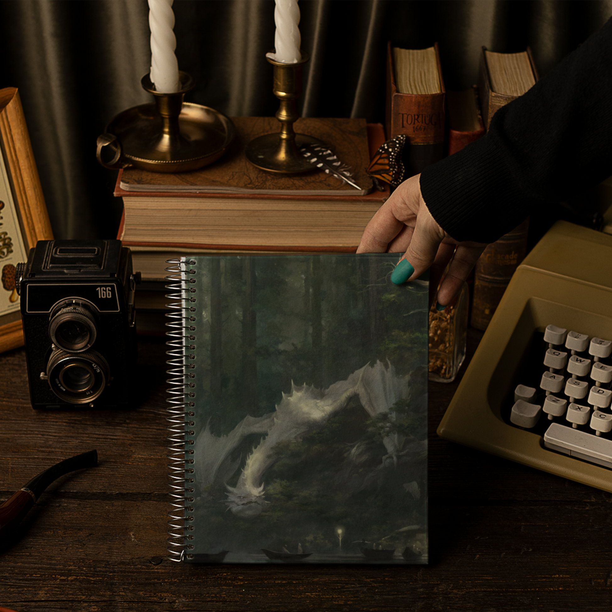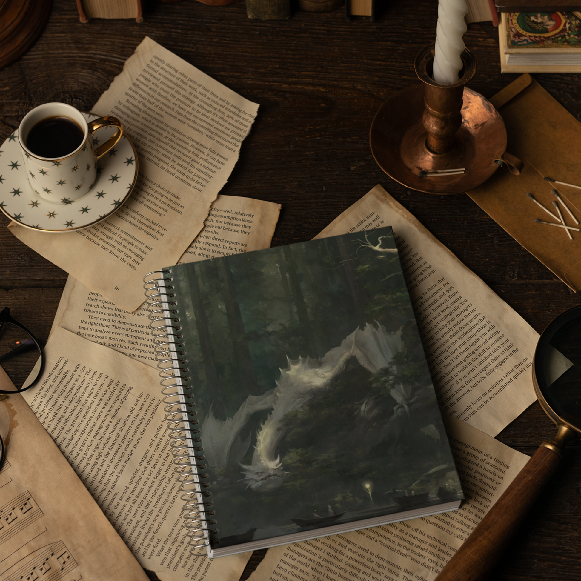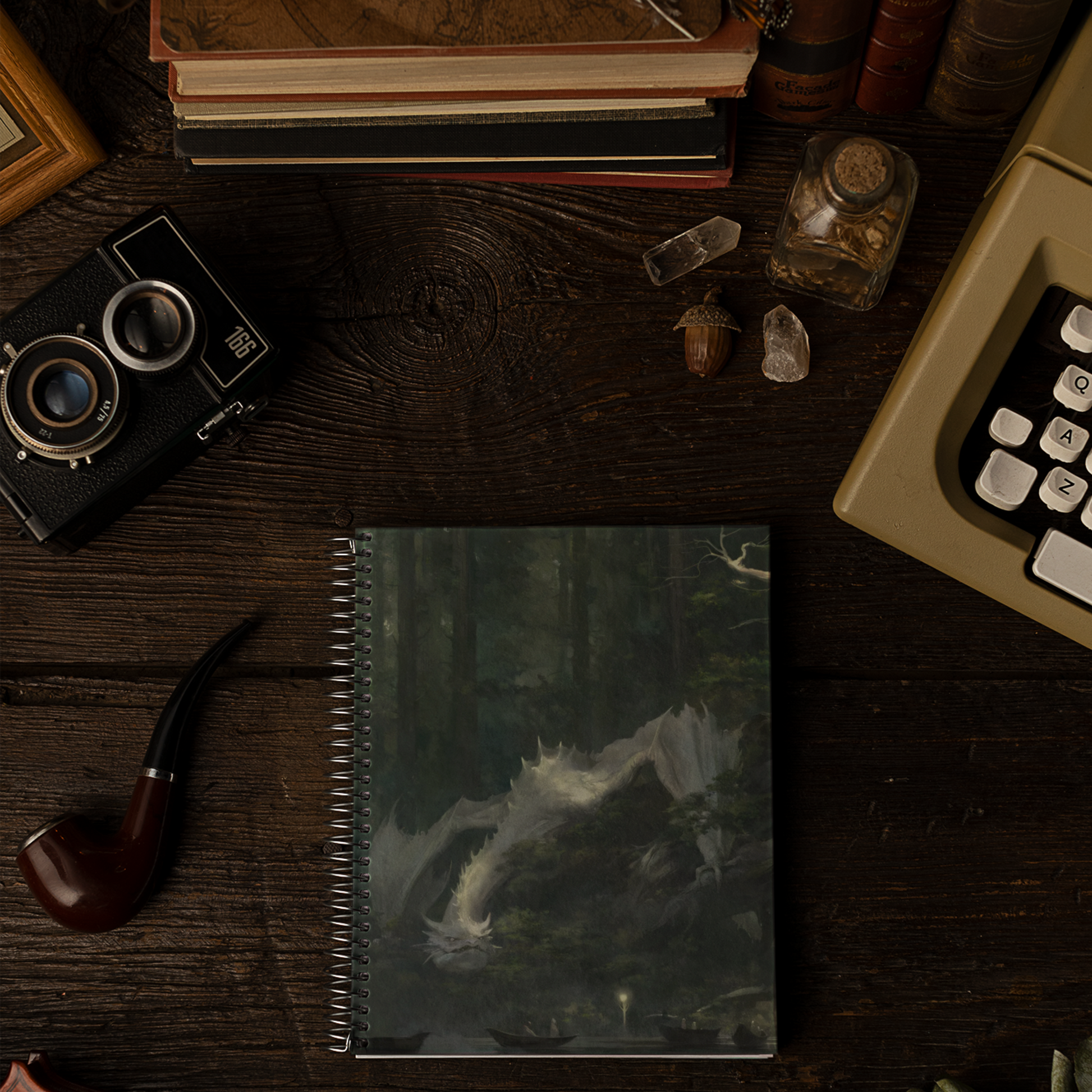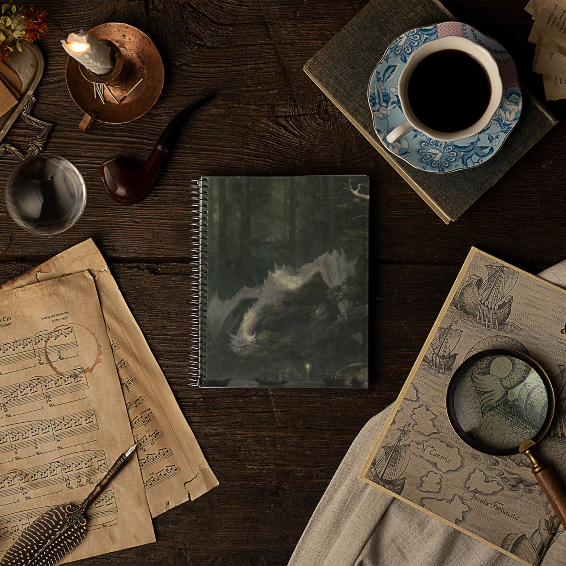 Unleash your imagination with a breathtaking portal into a mythical realm. Dominating the scene is an ancient white dragon emerging out of the dark forest awaiting the journeyman on their boats. its massive wings unfurled against a swirling twilight sky. Wisps of enchanted mist curl around the dragon’s talons, and far below, a moonlit forest hints at secrets waiting to be discovered.